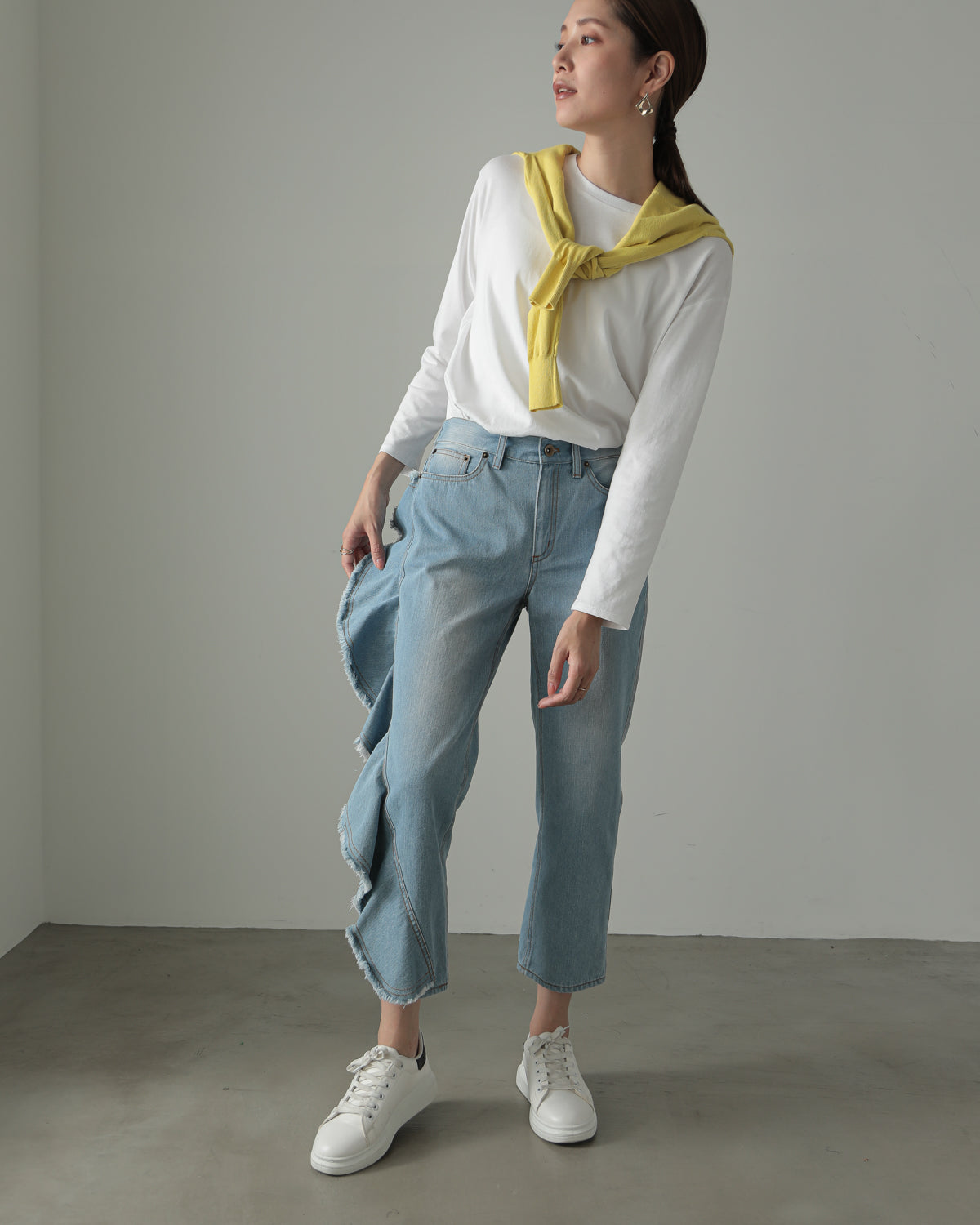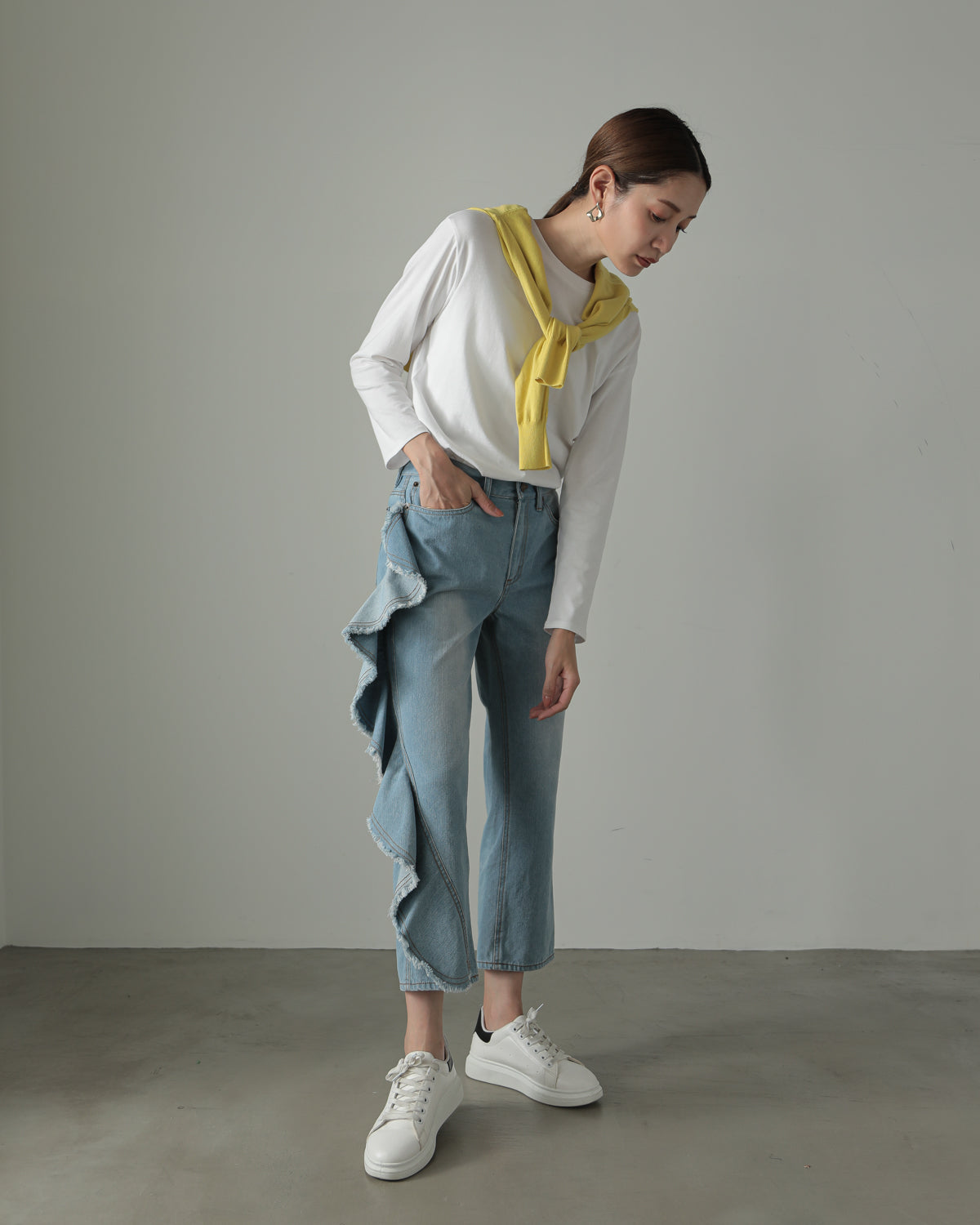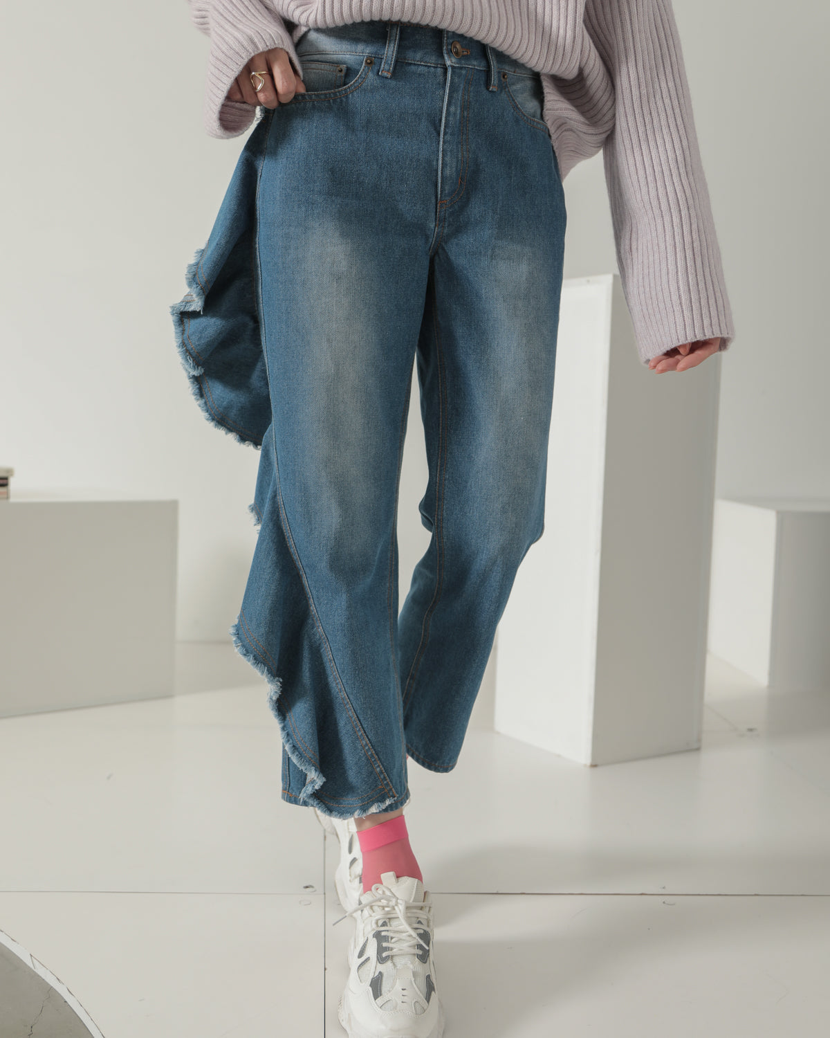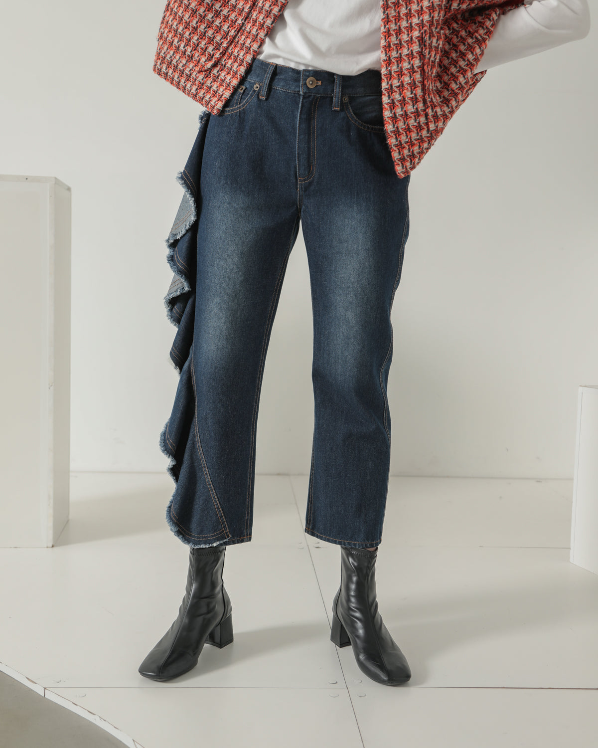斬新なスタイルのデニムパンツ。ネイビー、サックス、ブルーのカラーバリエーションでご用意、片側のサイドにはデニム素材のフリルが特徴的にあしらわれており、個性的なデザインがおしゃれなアクセントとなっています。