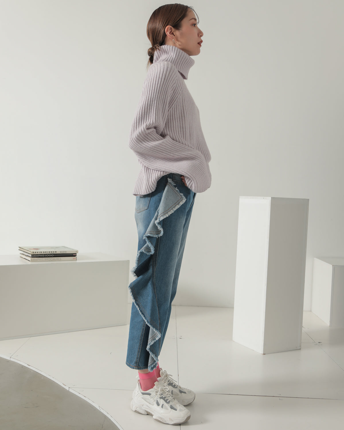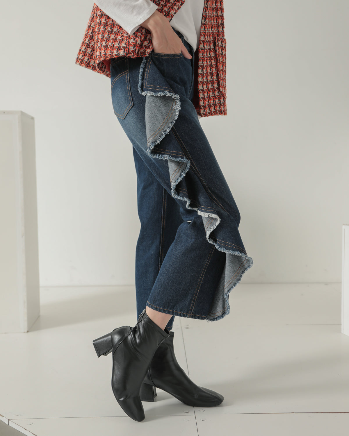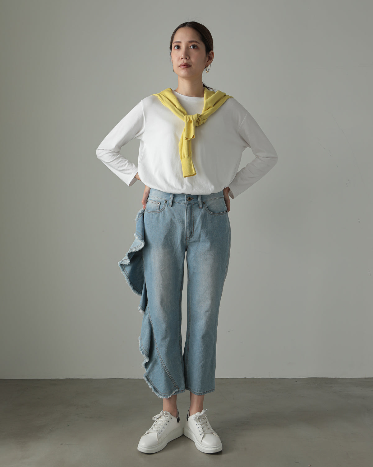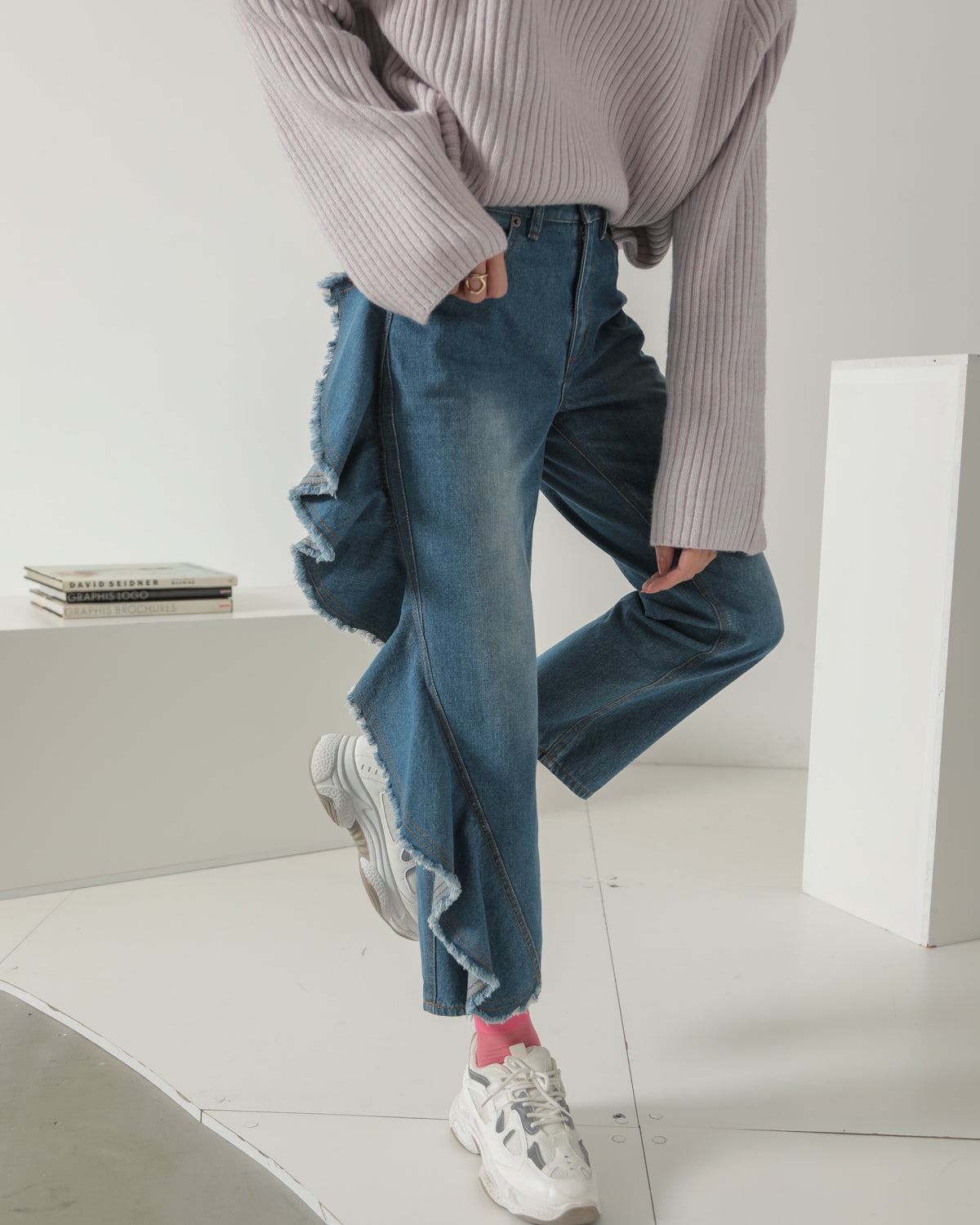 斬新なスタイルのデニムパンツ。ネイビー、サックス、ブルーのカラーバリエーションでご用意、片側のサイドにはデニム素材のフリルが特徴的にあしらわれており、個性的なデザインがおしゃれなアクセントとなっています。