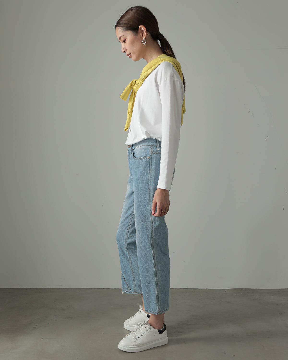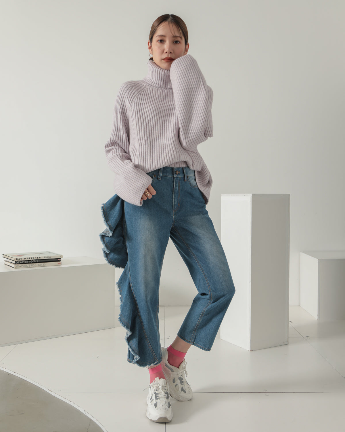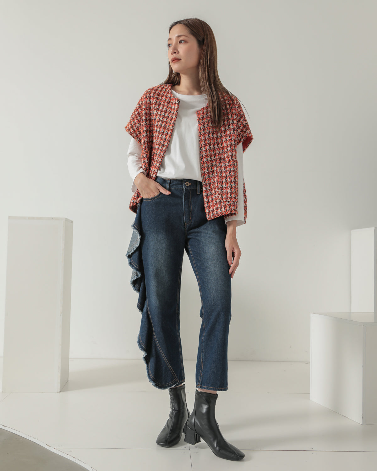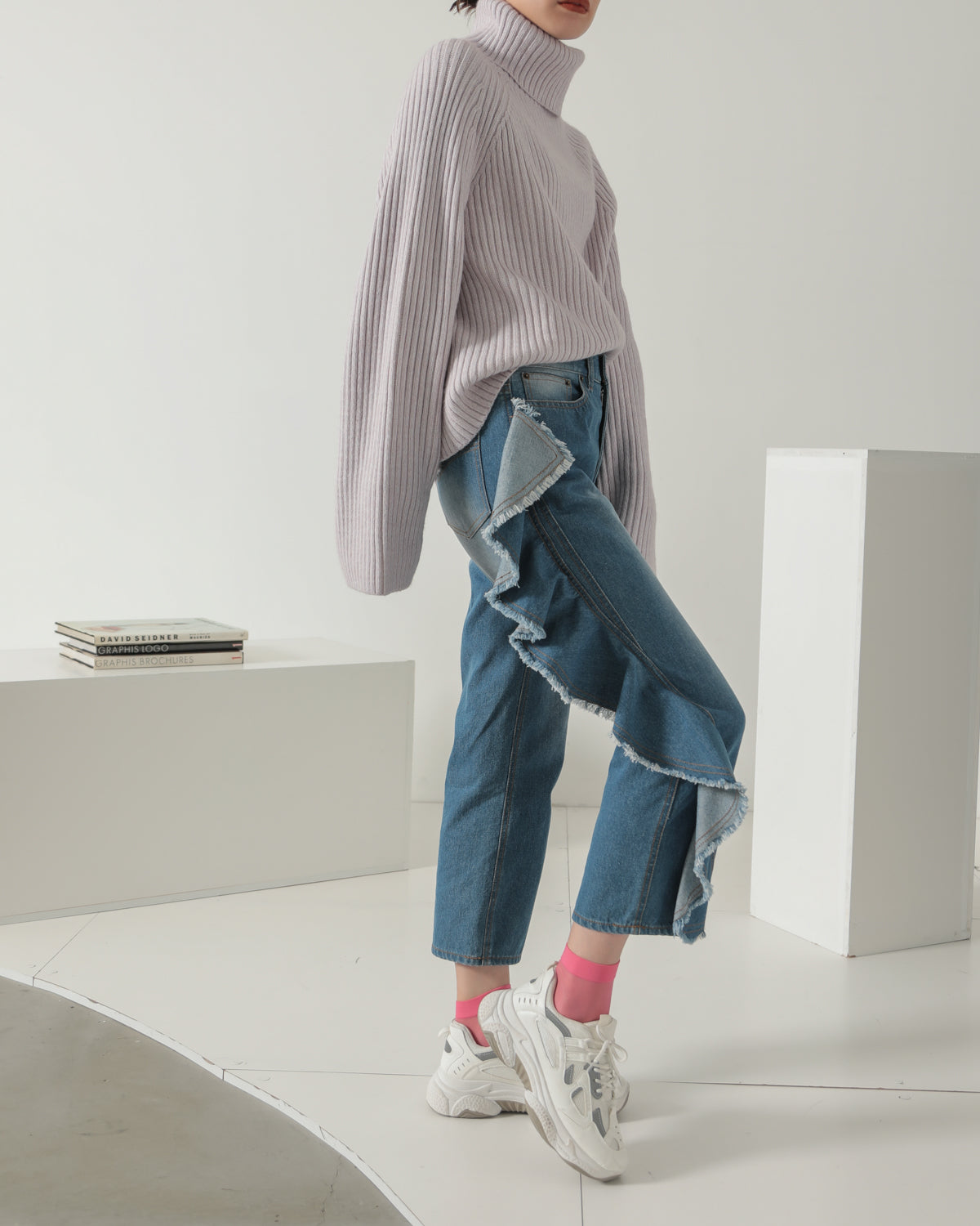 斬新なスタイルのデニムパンツ。ネイビー、サックス、ブルーのカラーバリエーションでご用意、片側のサイドにはデニム素材のフリルが特徴的にあしらわれており、個性的なデザインがおしゃれなアクセントとなっています。