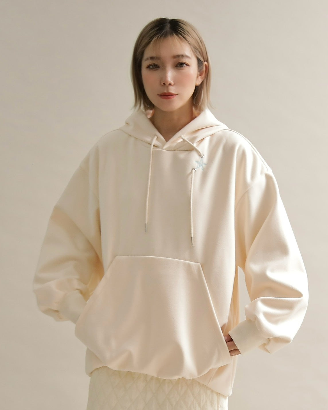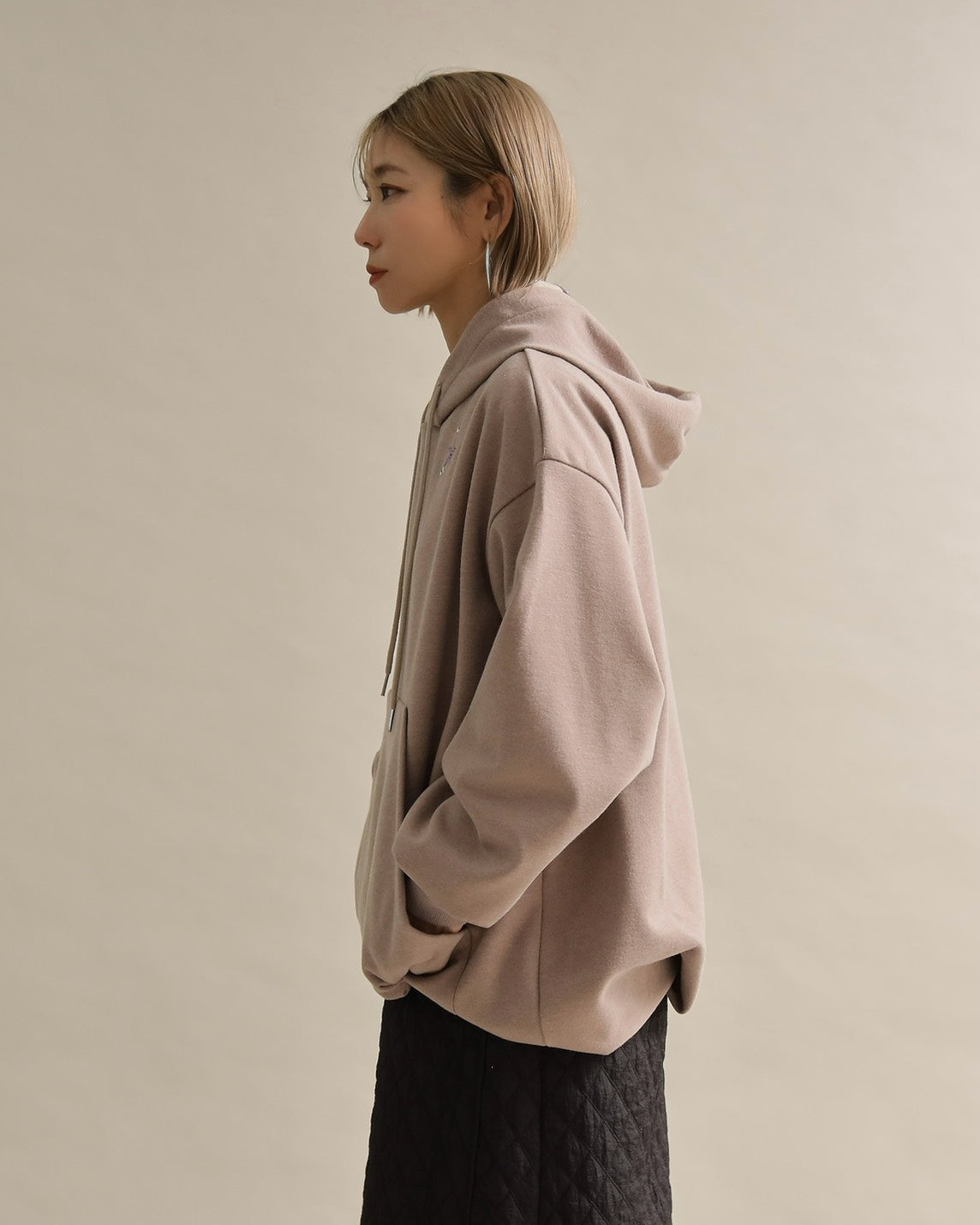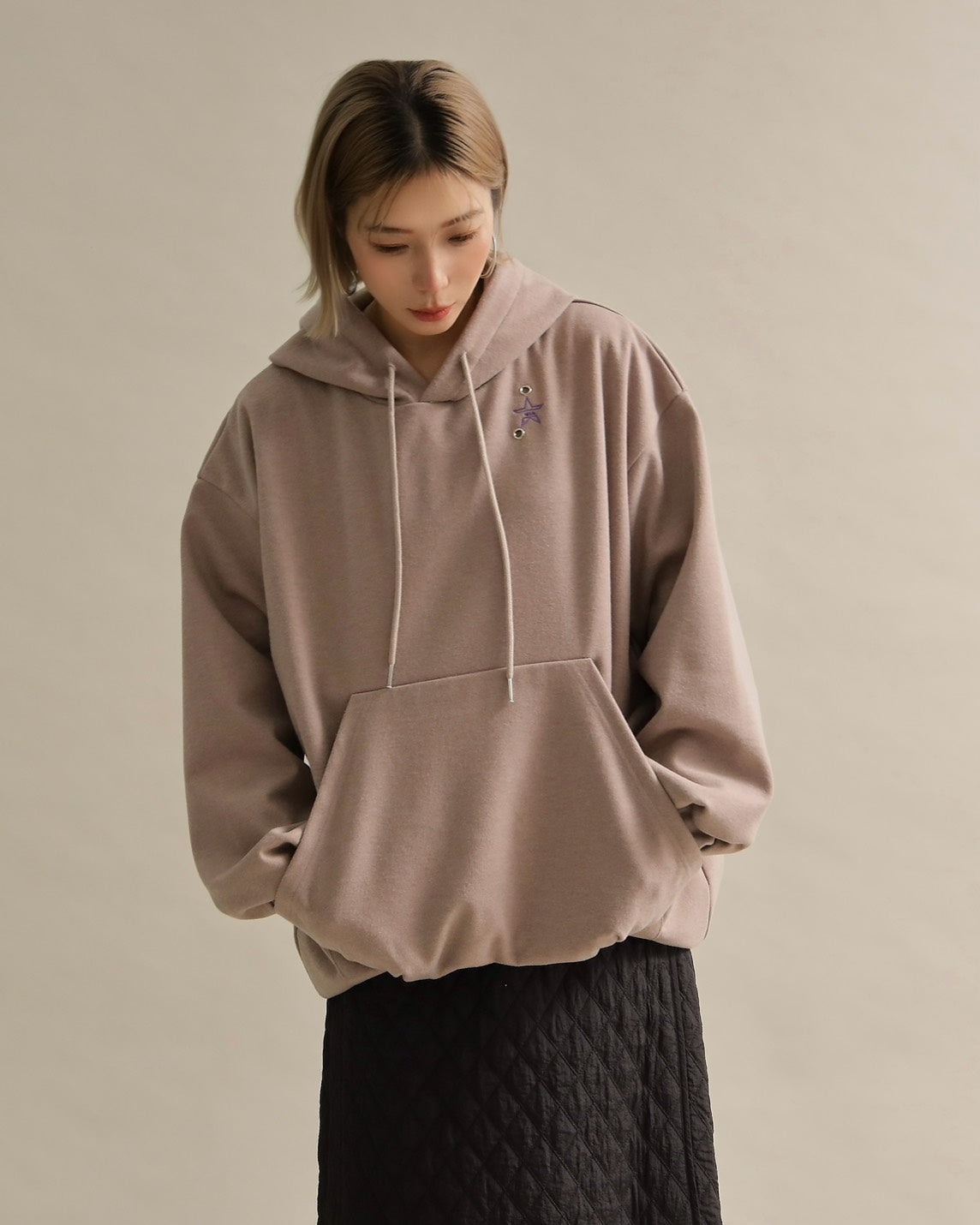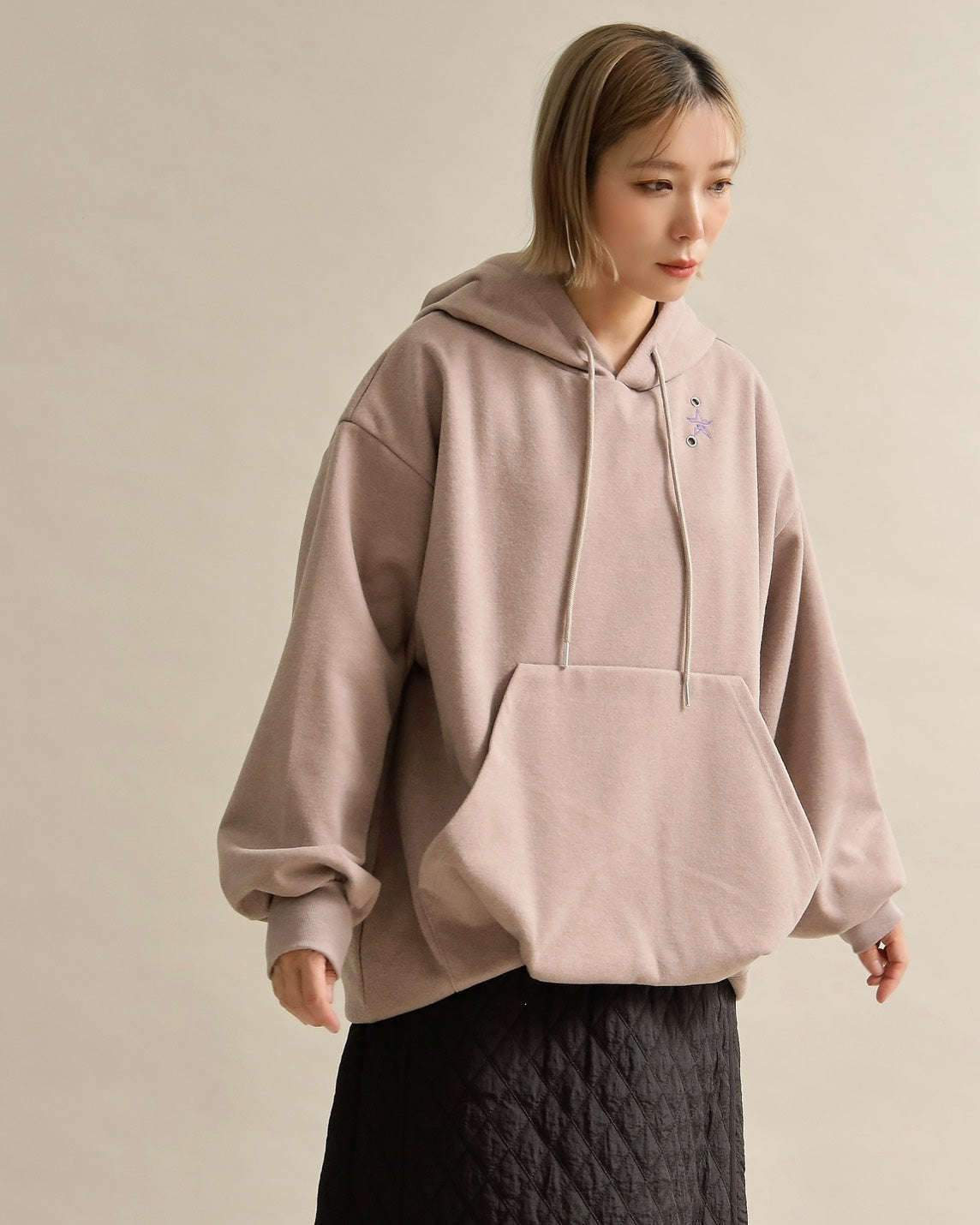 胸元には小さな星の刺繍をあしらい、シンプルなデザインにさりげない可愛さをプラス。ラフな印象のパーカーも、女性らしいニュアンスカラーで上品に仕上がっています。