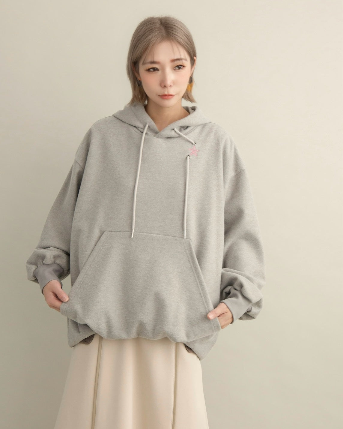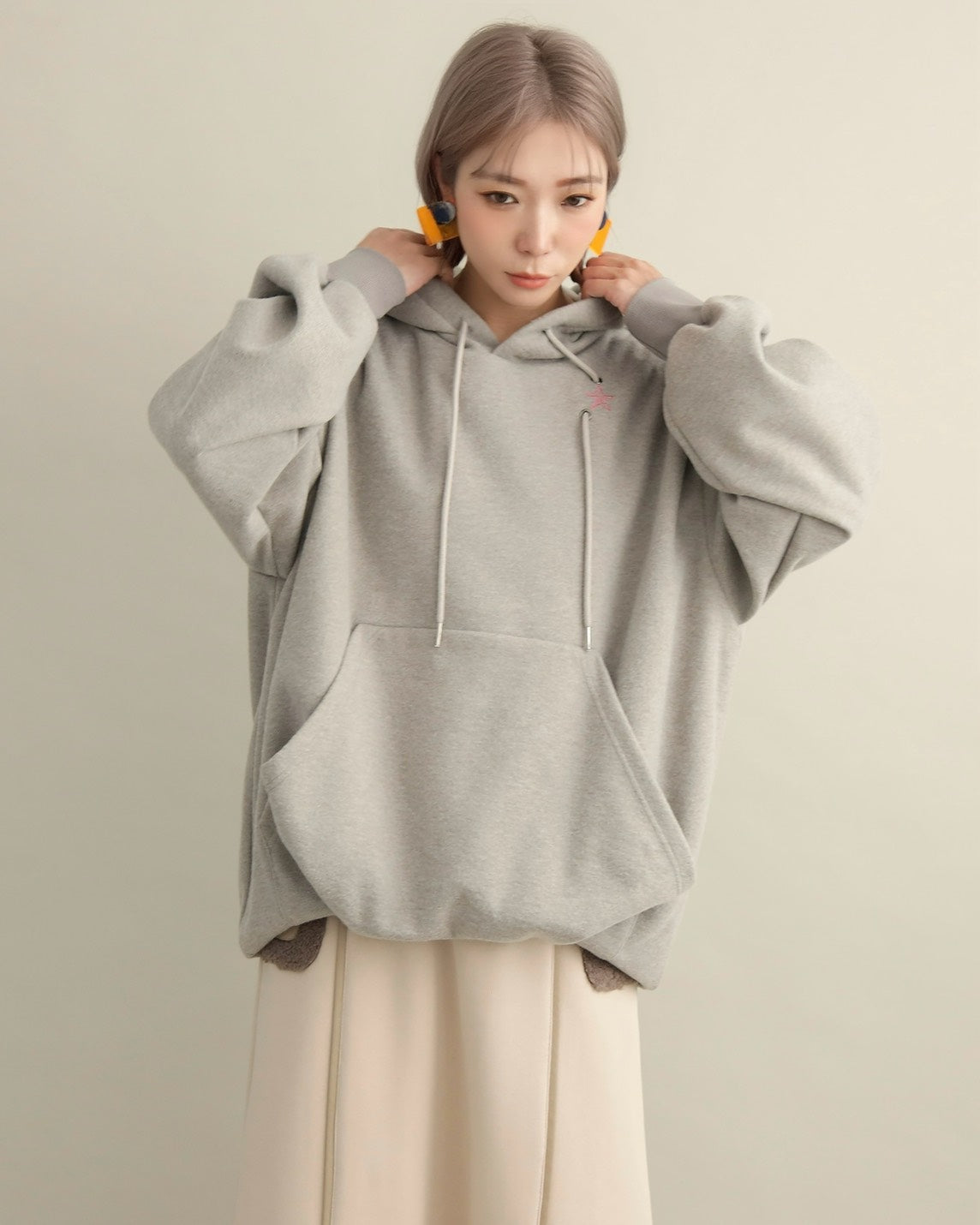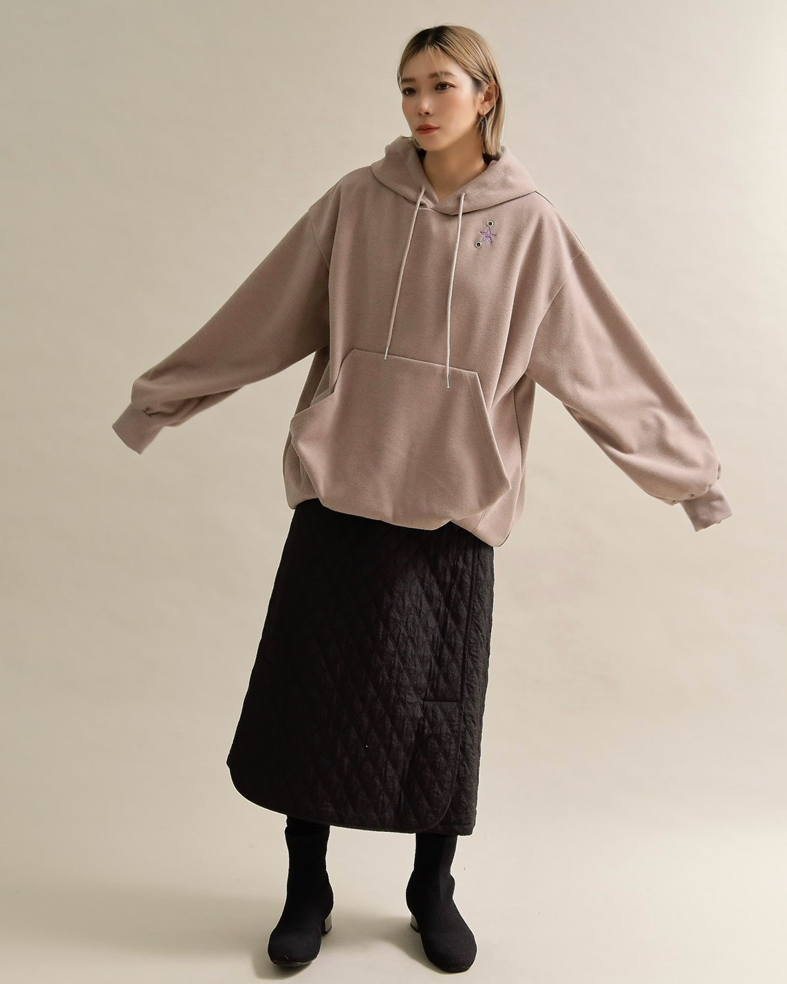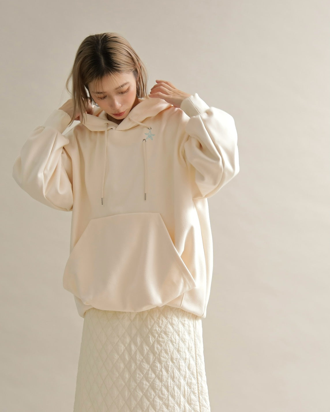 胸元には小さな星の刺繍をあしらい、シンプルなデザインにさりげない可愛さをプラス。ラフな印象のパーカーも、女性らしいニュアンスカラーで上品に仕上がっています。