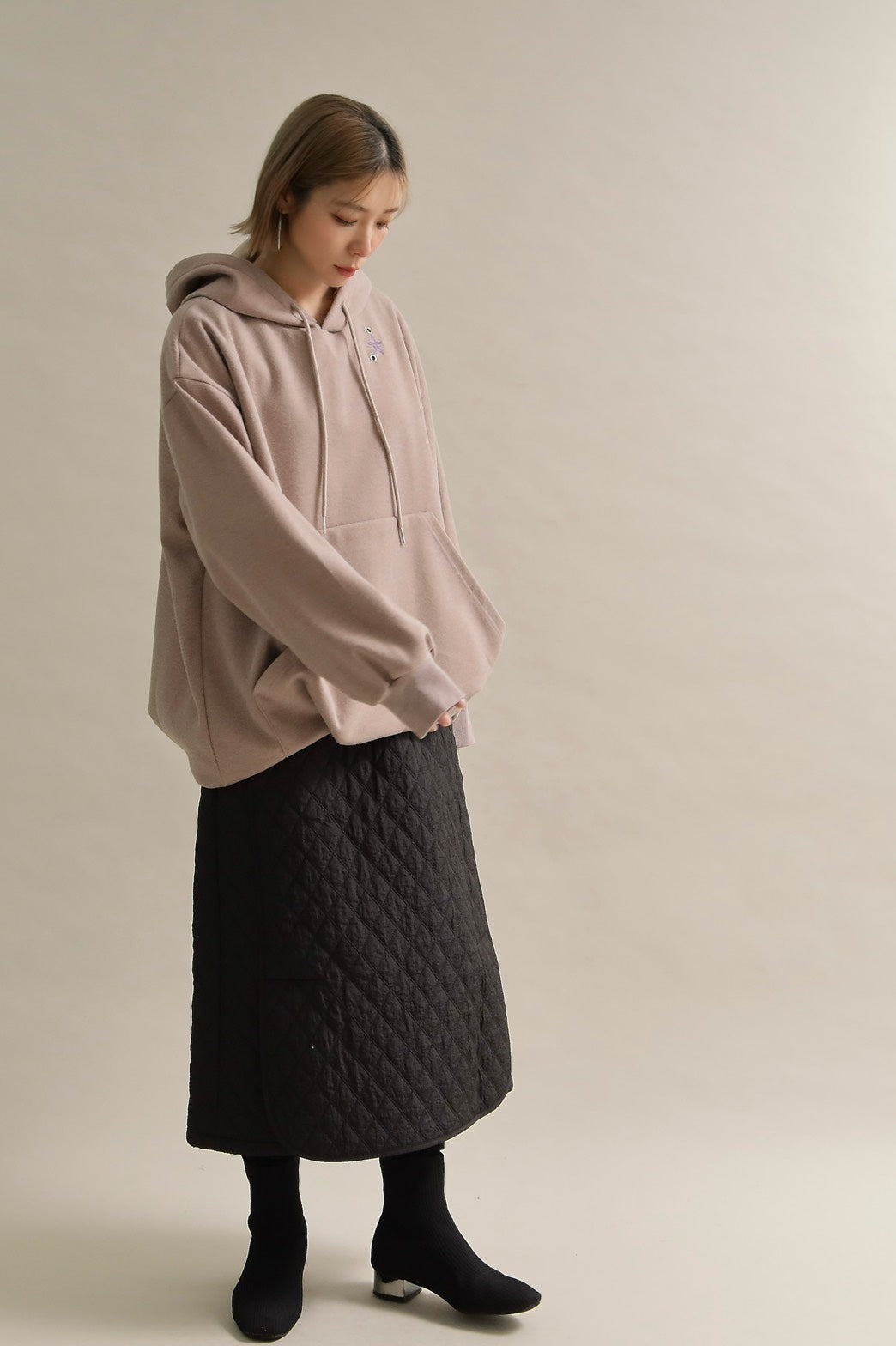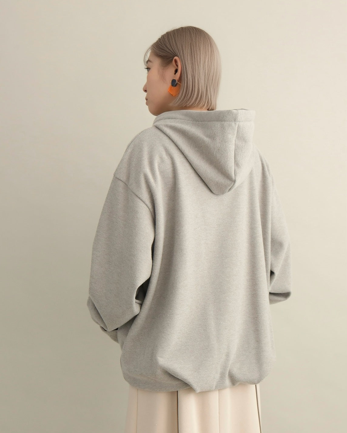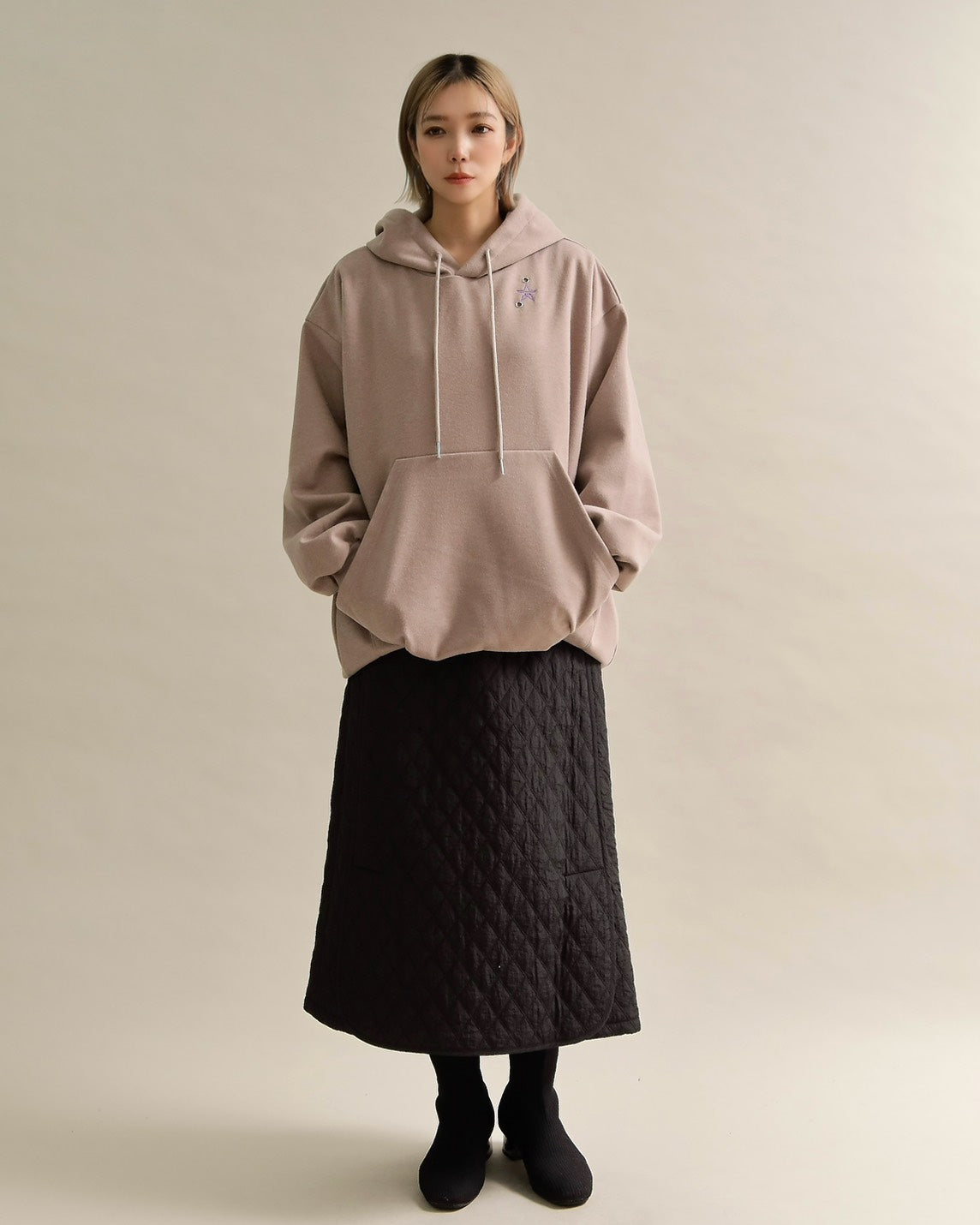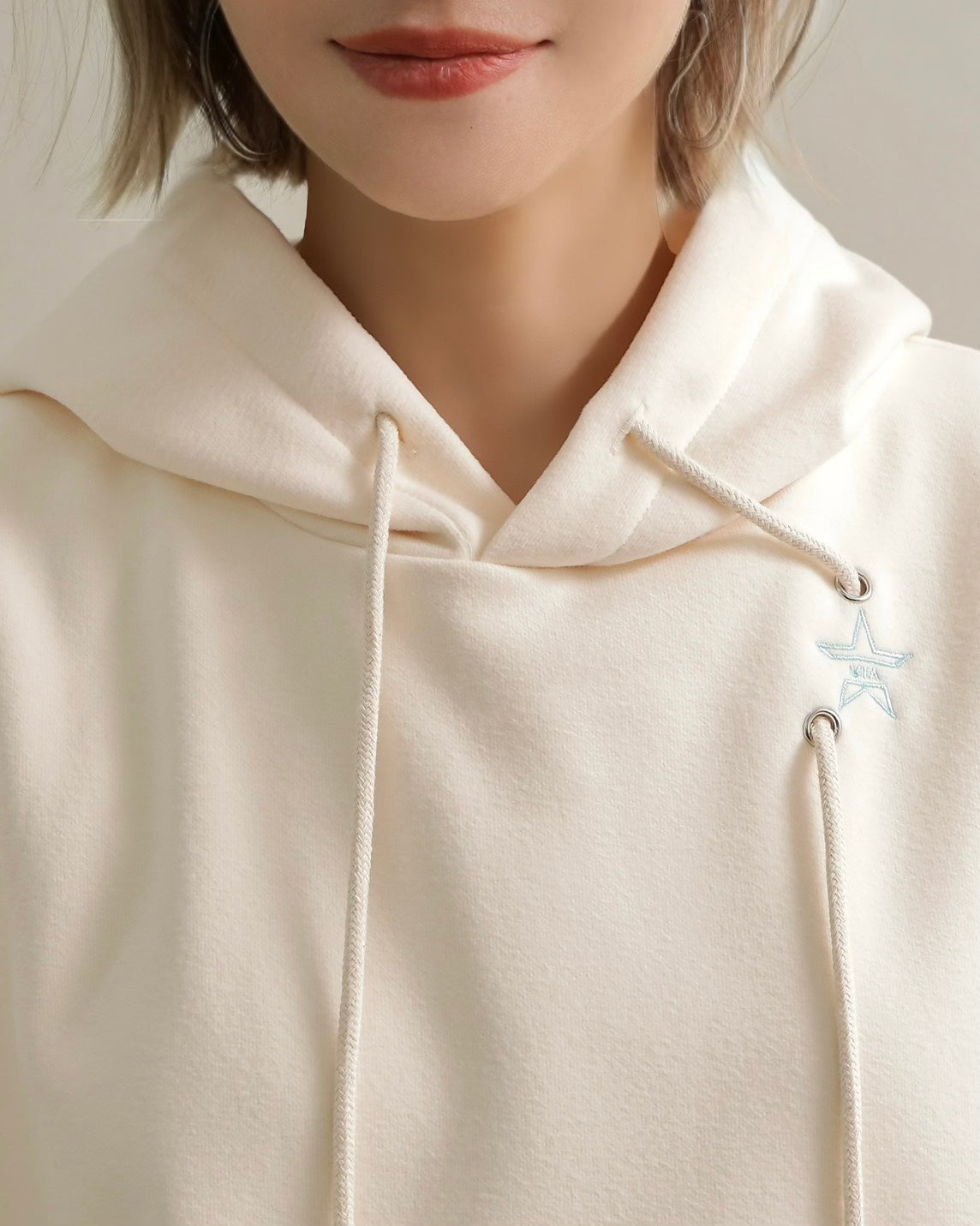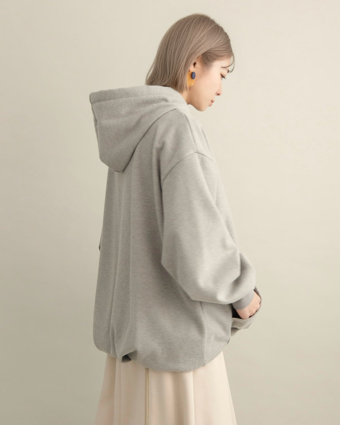胸元には小さな星の刺繍をあしらい、シンプルなデザインにさりげない可愛さをプラス。ラフな印象のパーカーも、女性らしいニュアンスカラーで上品に仕上がっています。