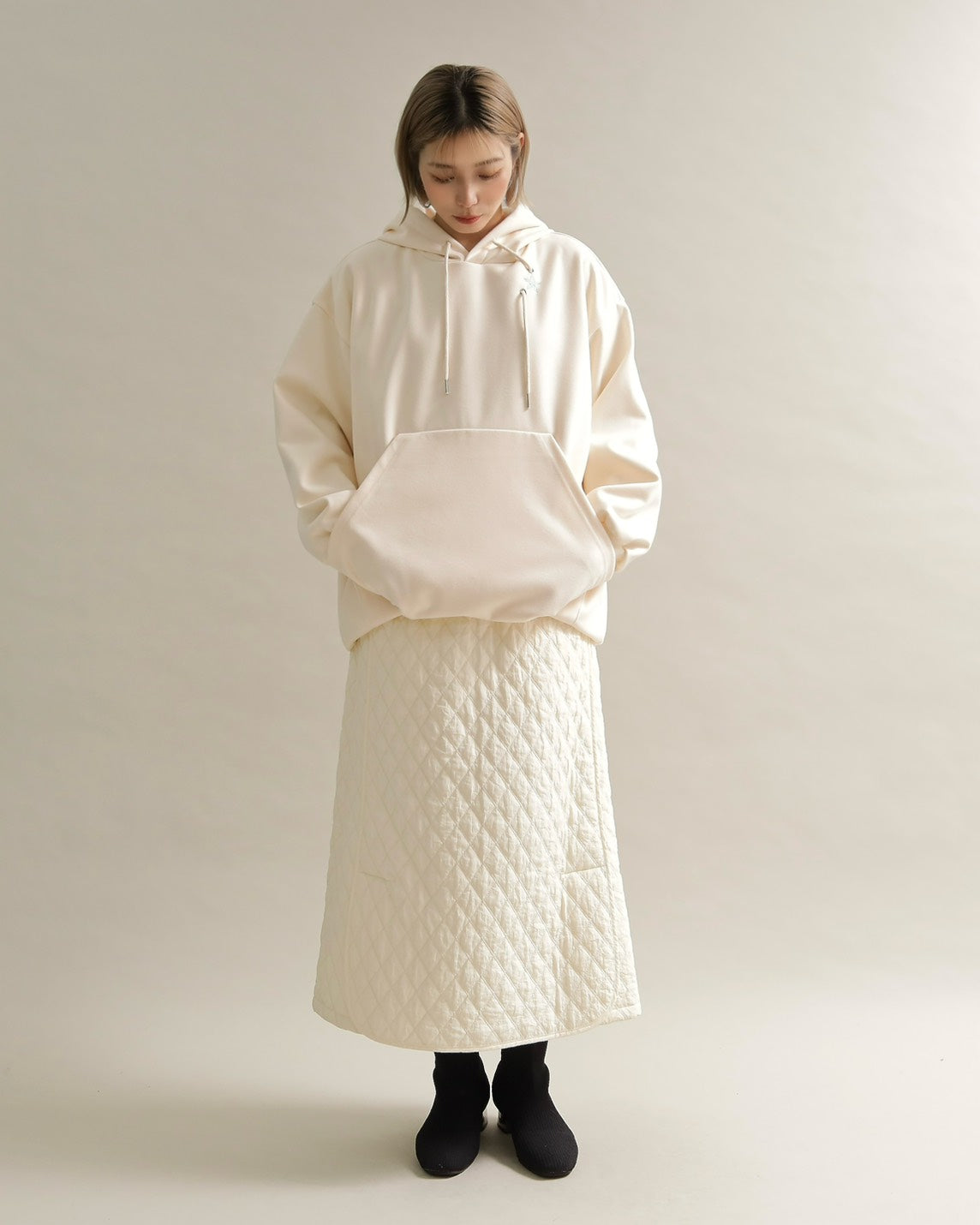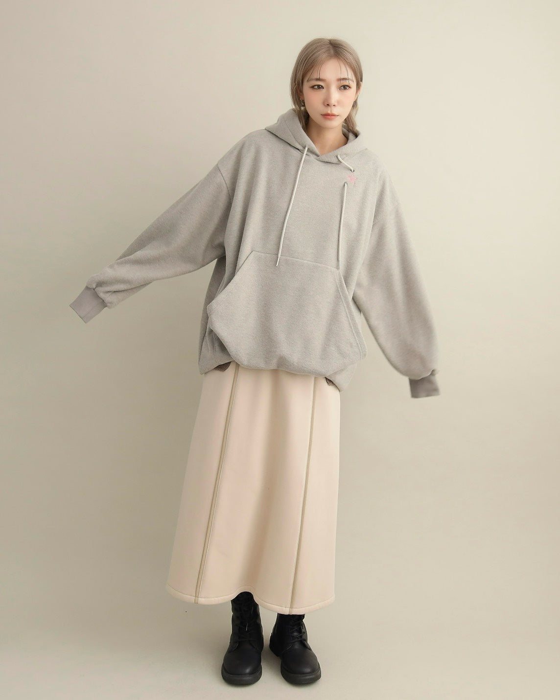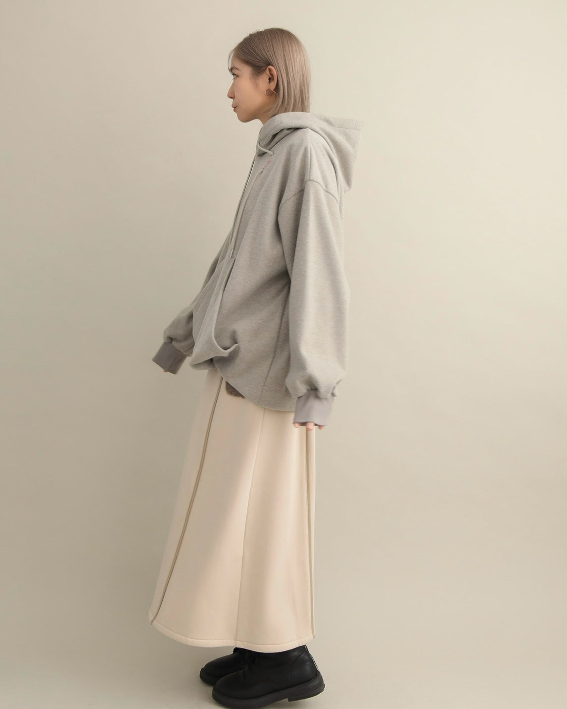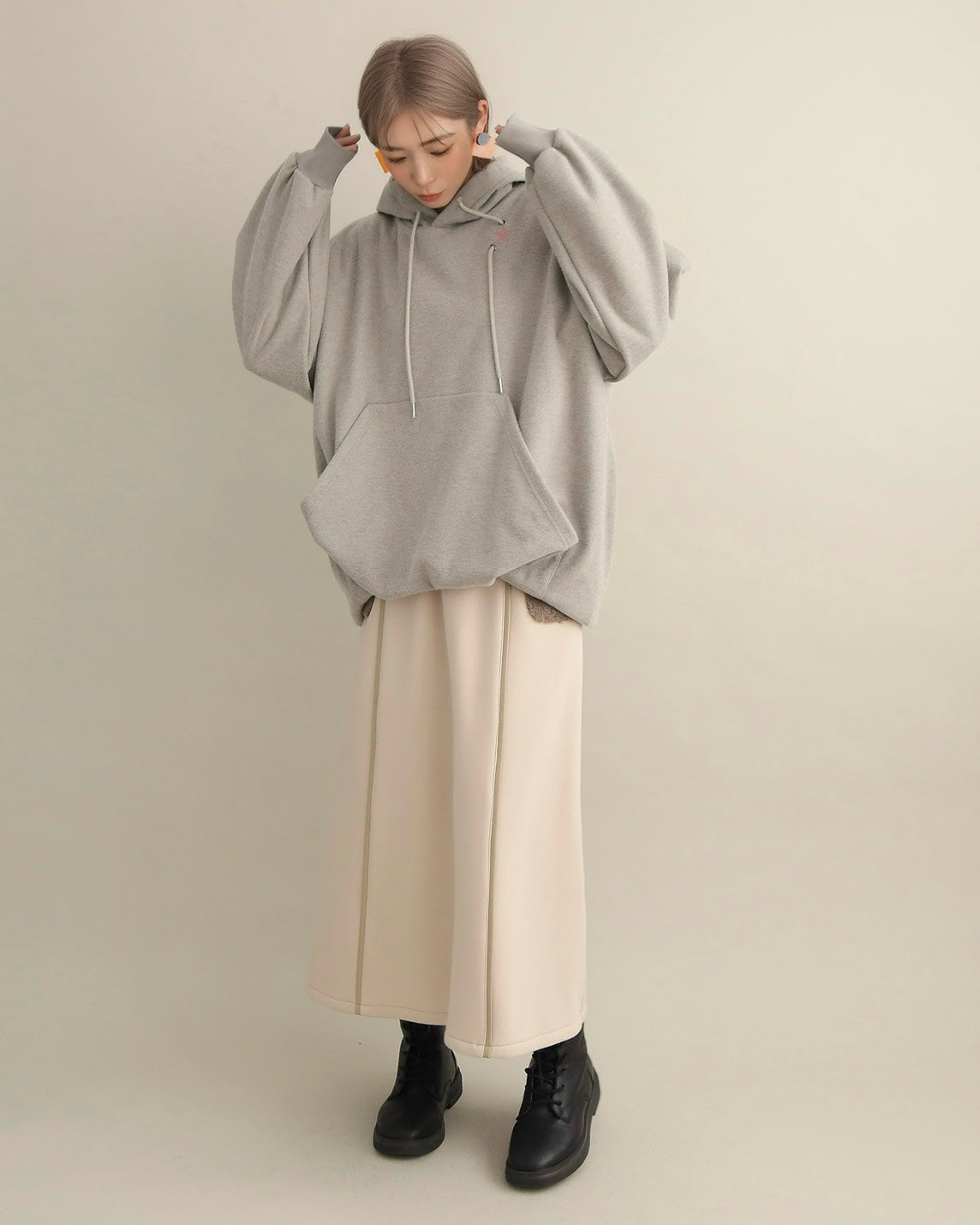 胸元には小さな星の刺繍をあしらい、シンプルなデザインにさりげない可愛さをプラス。ラフな印象のパーカーも、女性らしいニュアンスカラーで上品に仕上がっています。
