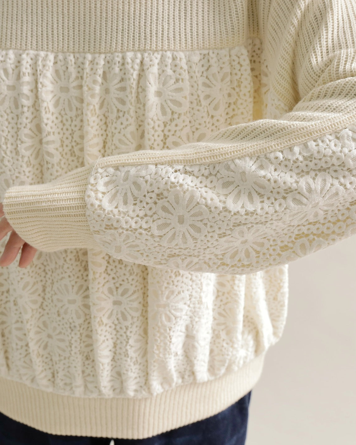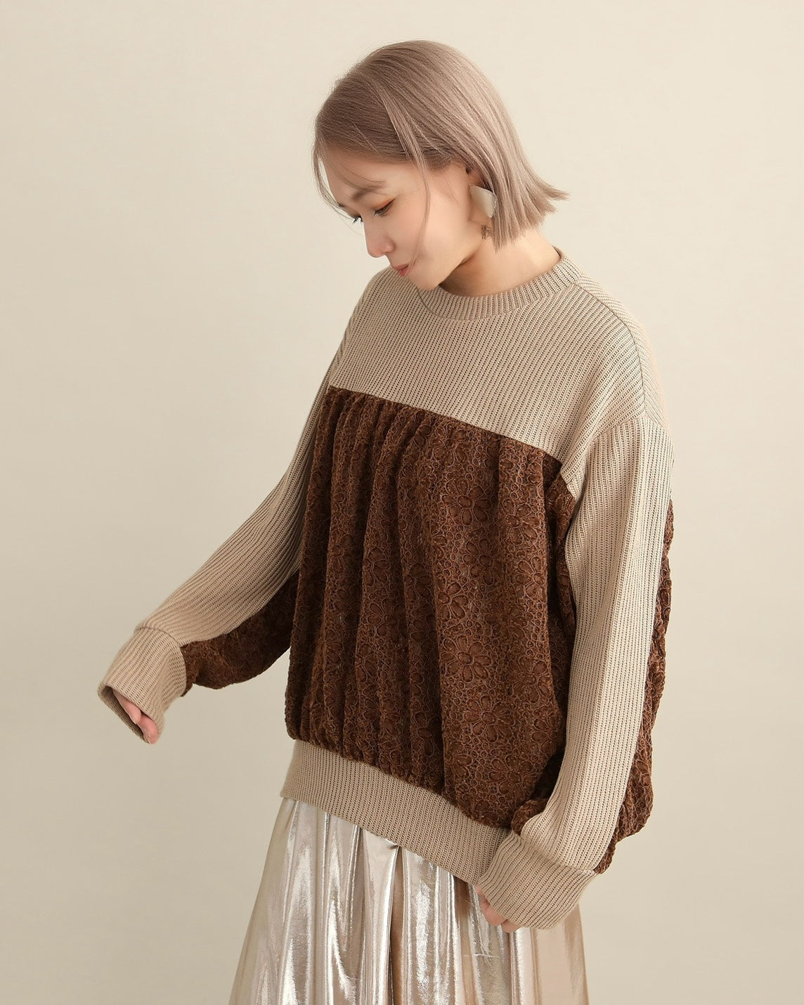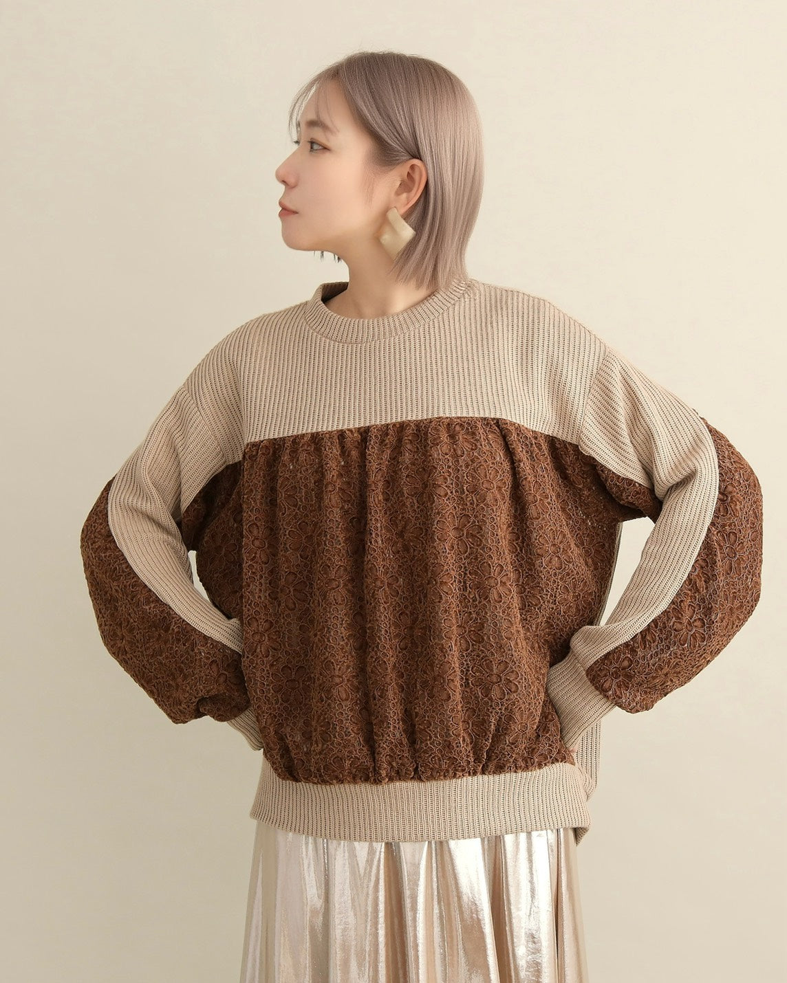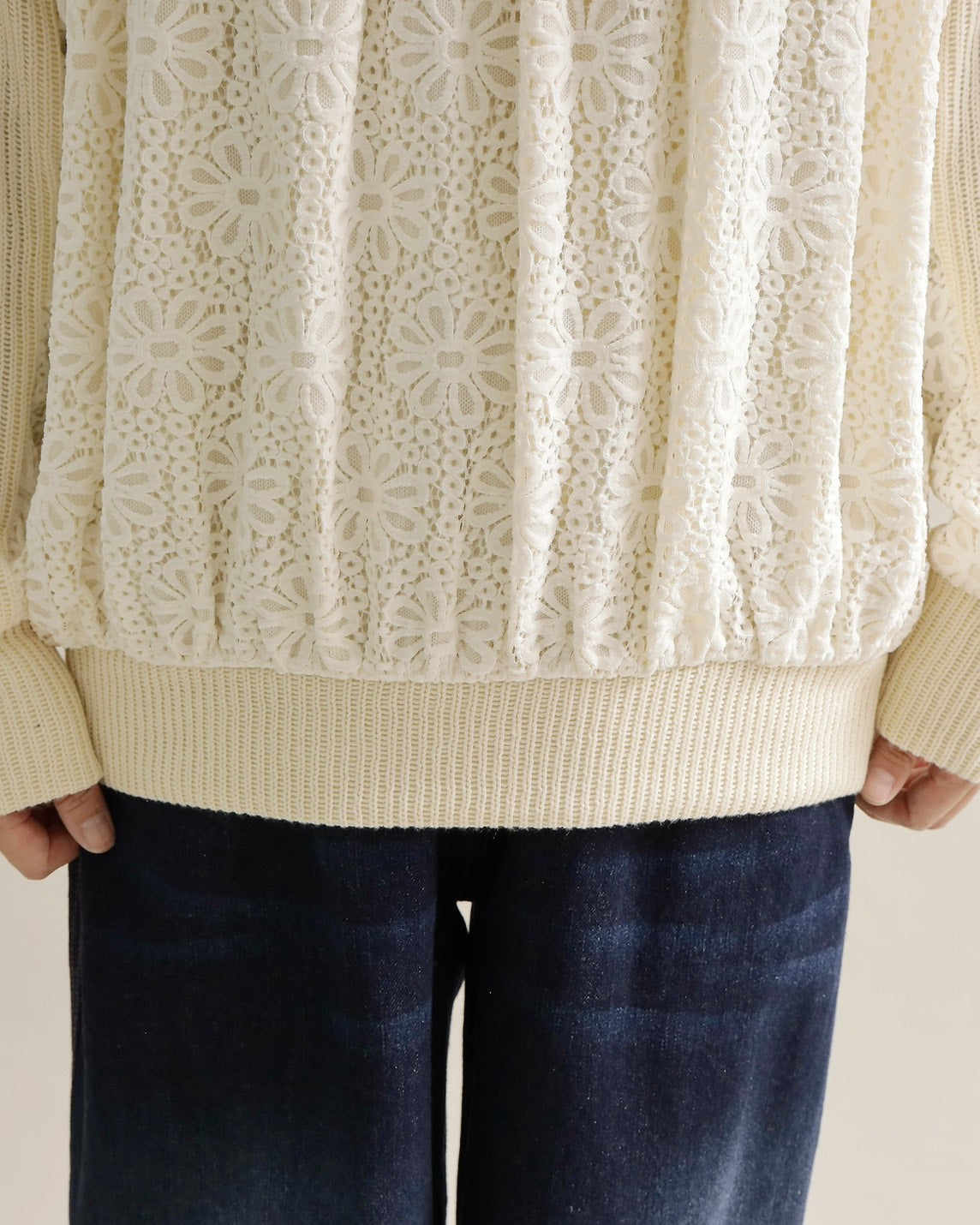ふんわり広がるレースの表情が女性らしさを引き立てる、異素材ミックスのニットプルオーバー。胸下から切り替えたレースギャザーが立体的に広がり、1枚で着映えする大人のフェミニンスタイルを叶えます。