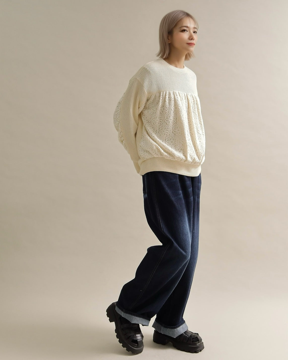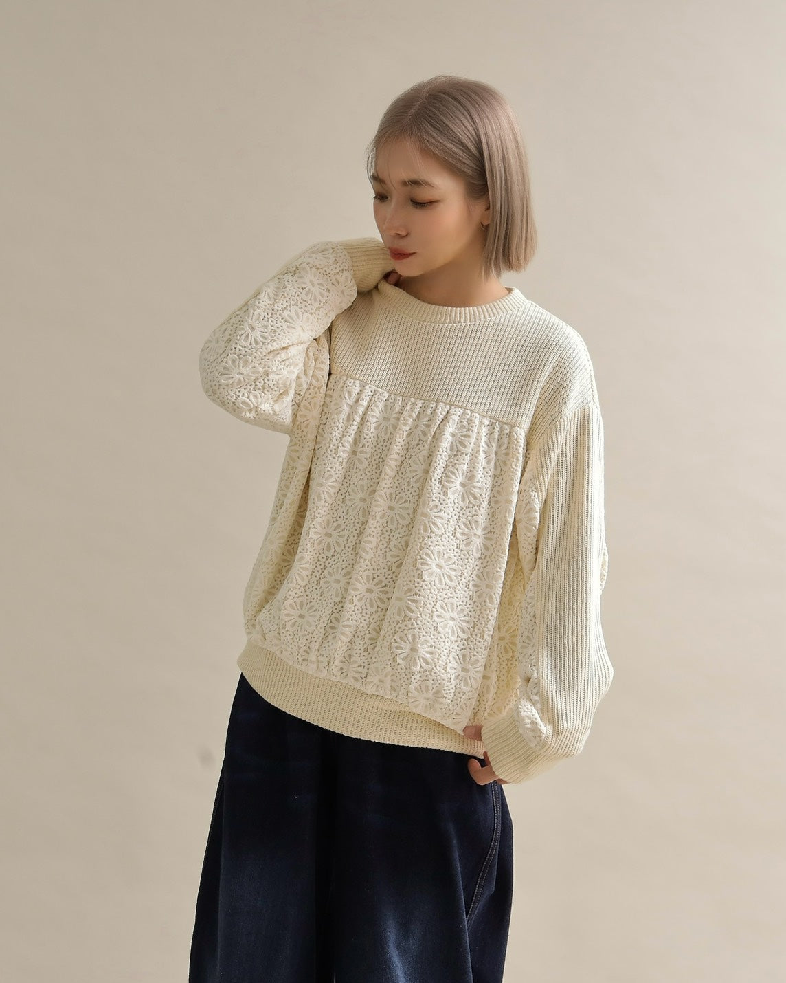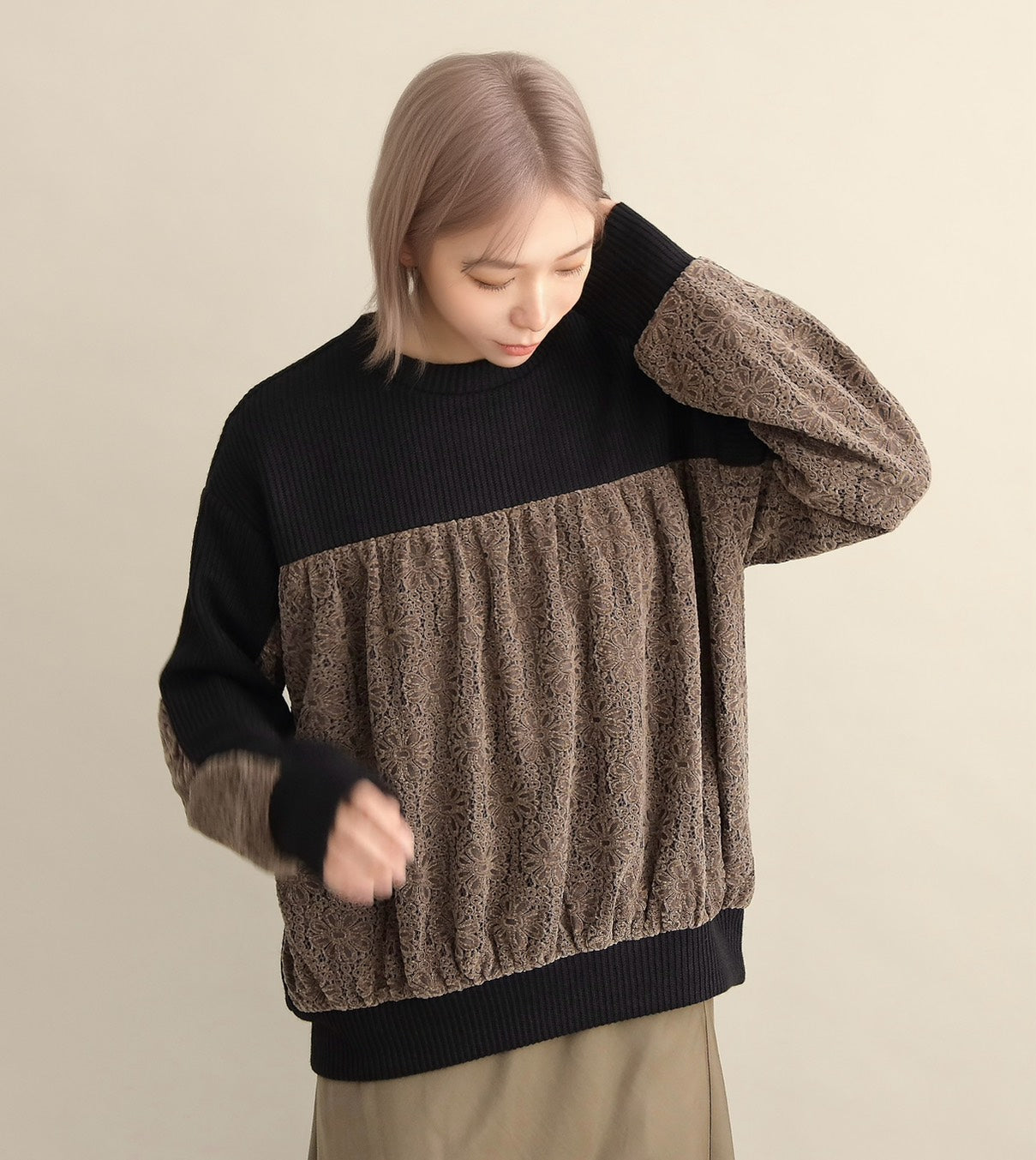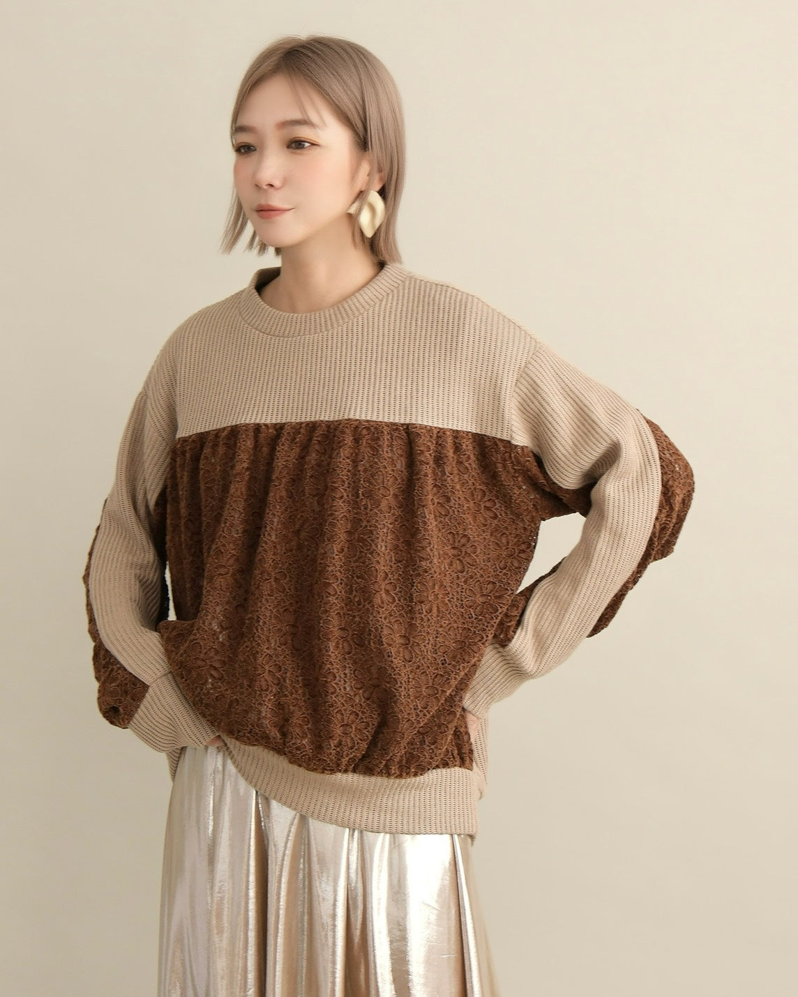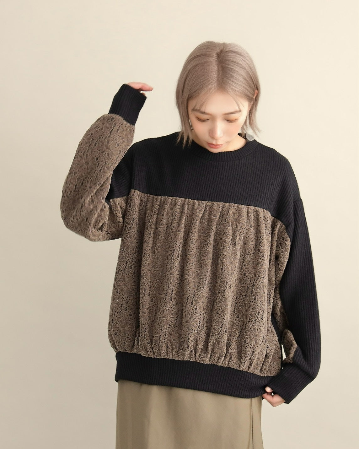 ふんわり広がるレースの表情が女性らしさを引き立てる、異素材ミックスのニットプルオーバー。胸下から切り替えたレースギャザーが立体的に広がり、1枚で着映えする大人のフェミニンスタイルを叶えます。