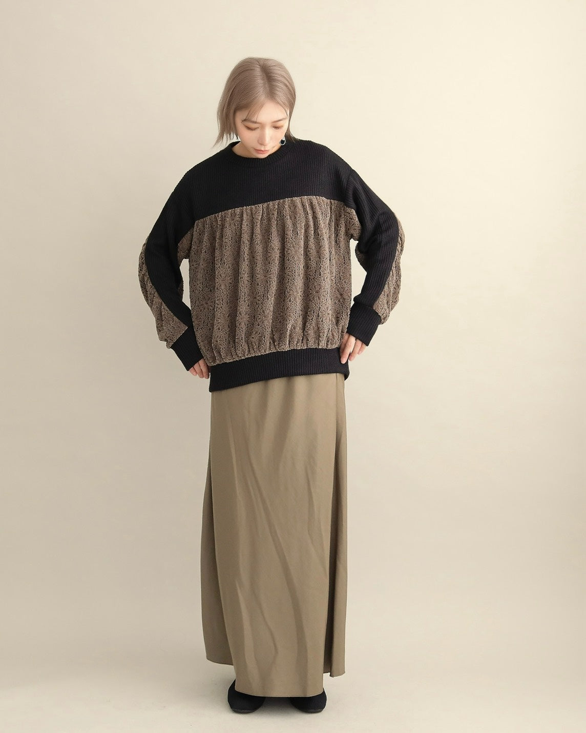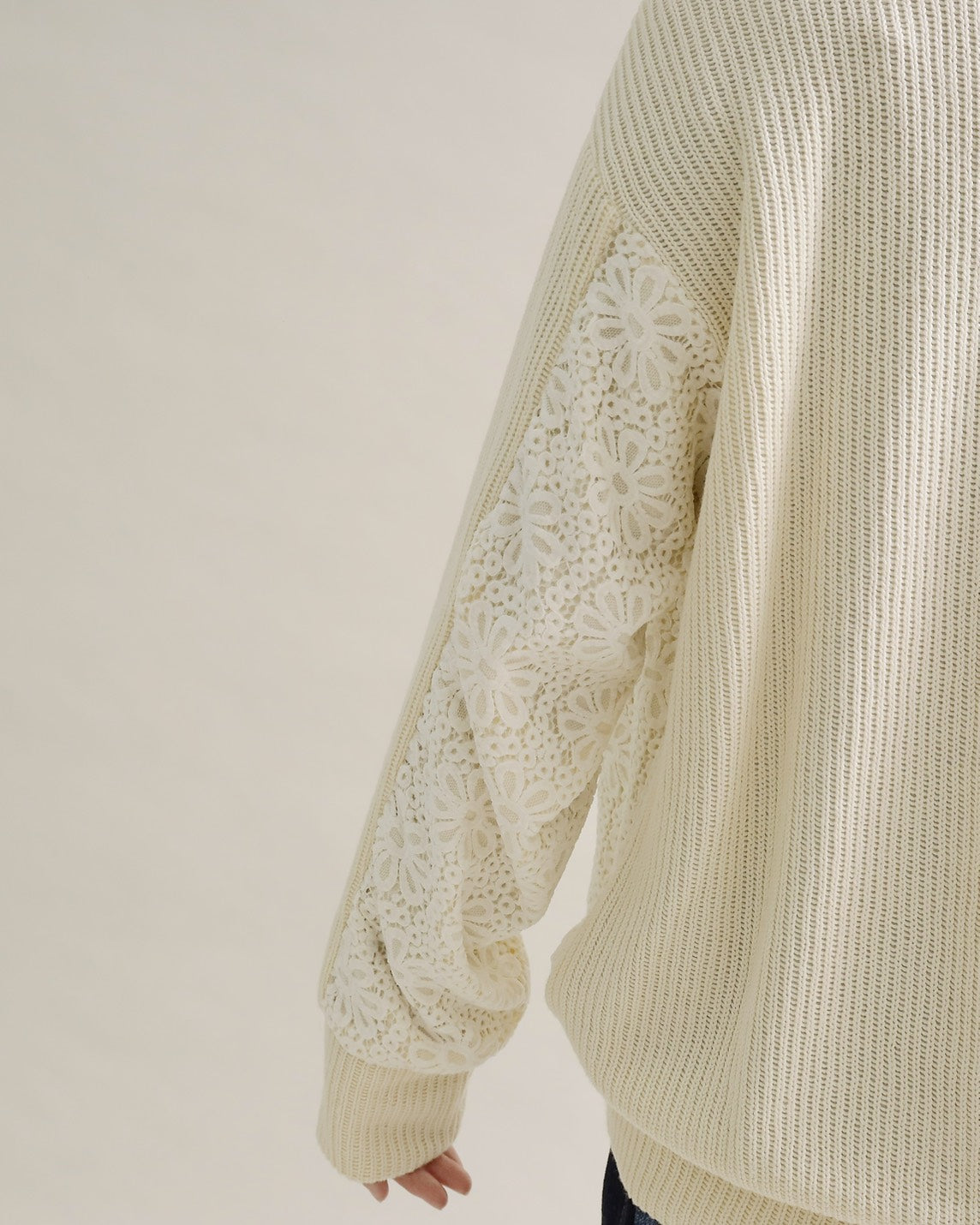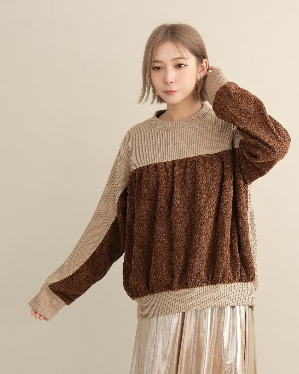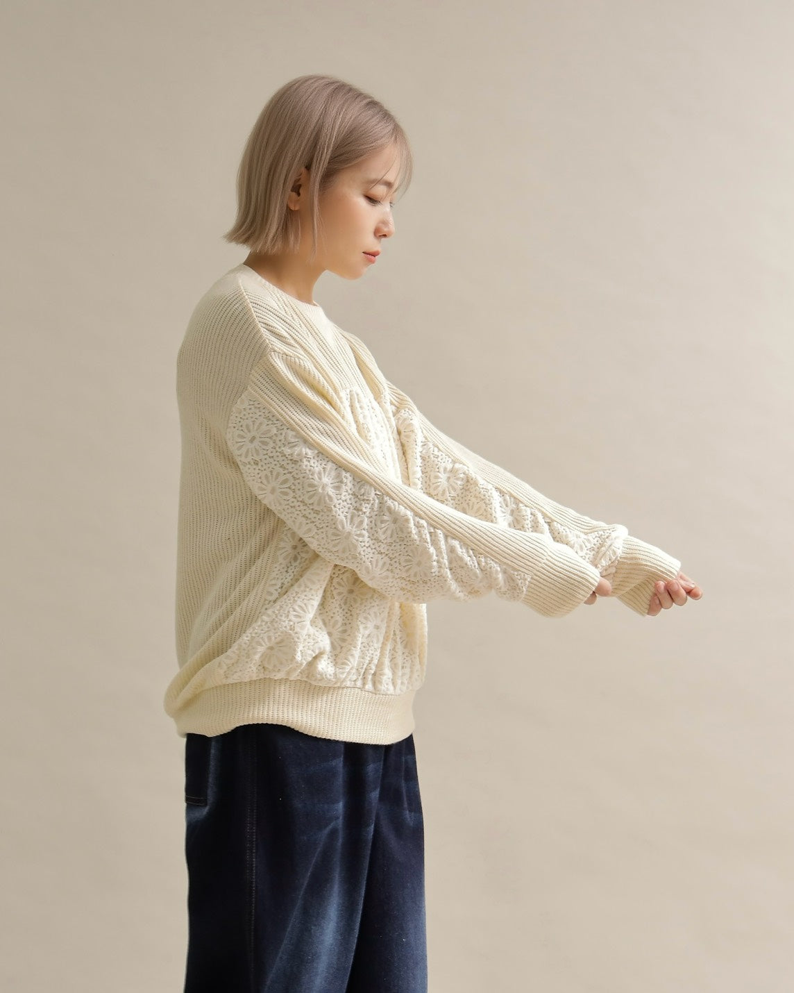 ふんわり広がるレースの表情が女性らしさを引き立てる、異素材ミックスのニットプルオーバー。胸下から切り替えたレースギャザーが立体的に広がり、1枚で着映えする大人のフェミニンスタイルを叶えます。