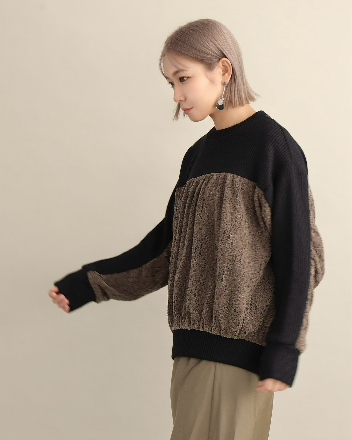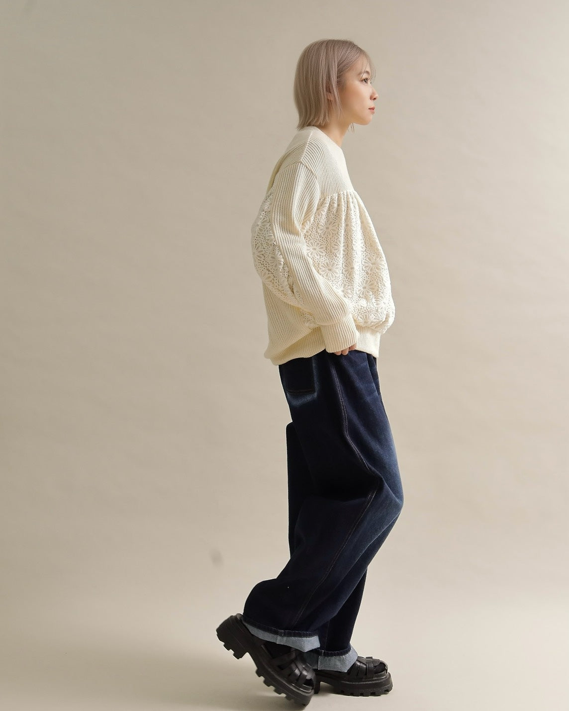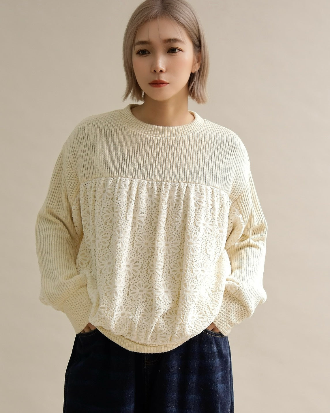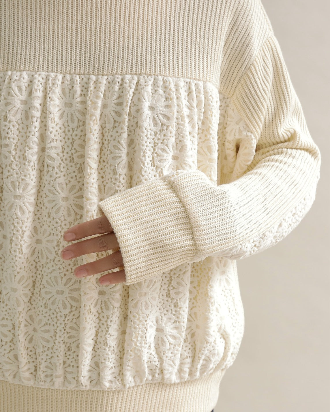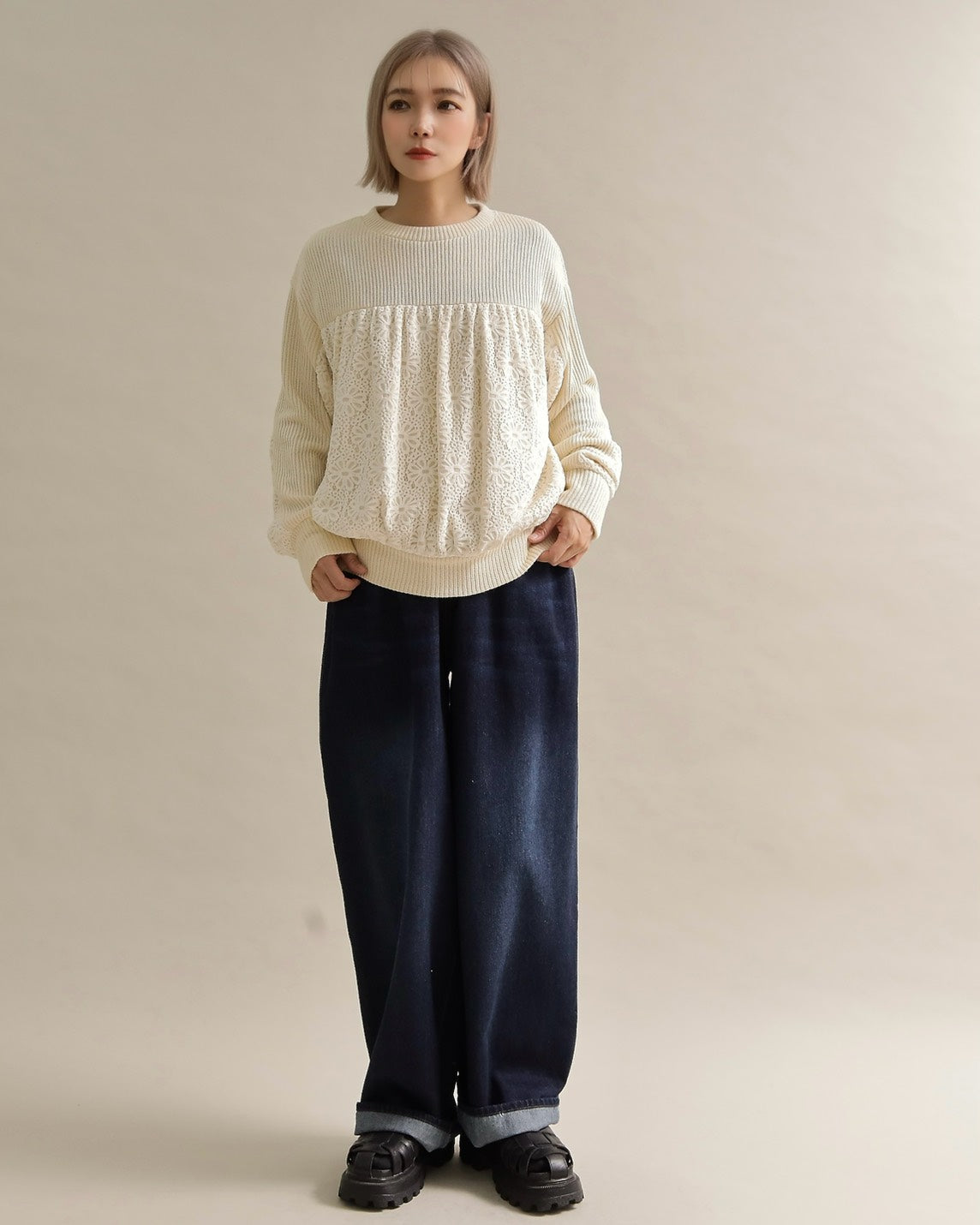 ふんわり広がるレースの表情が女性らしさを引き立てる、異素材ミックスのニットプルオーバー。胸下から切り替えたレースギャザーが立体的に広がり、1枚で着映えする大人のフェミニンスタイルを叶えます。