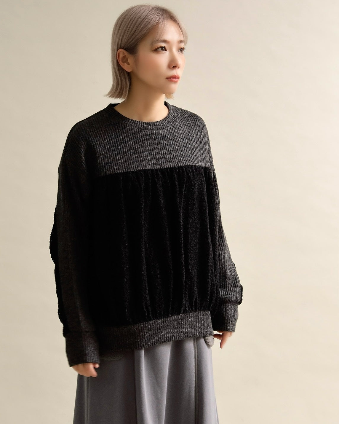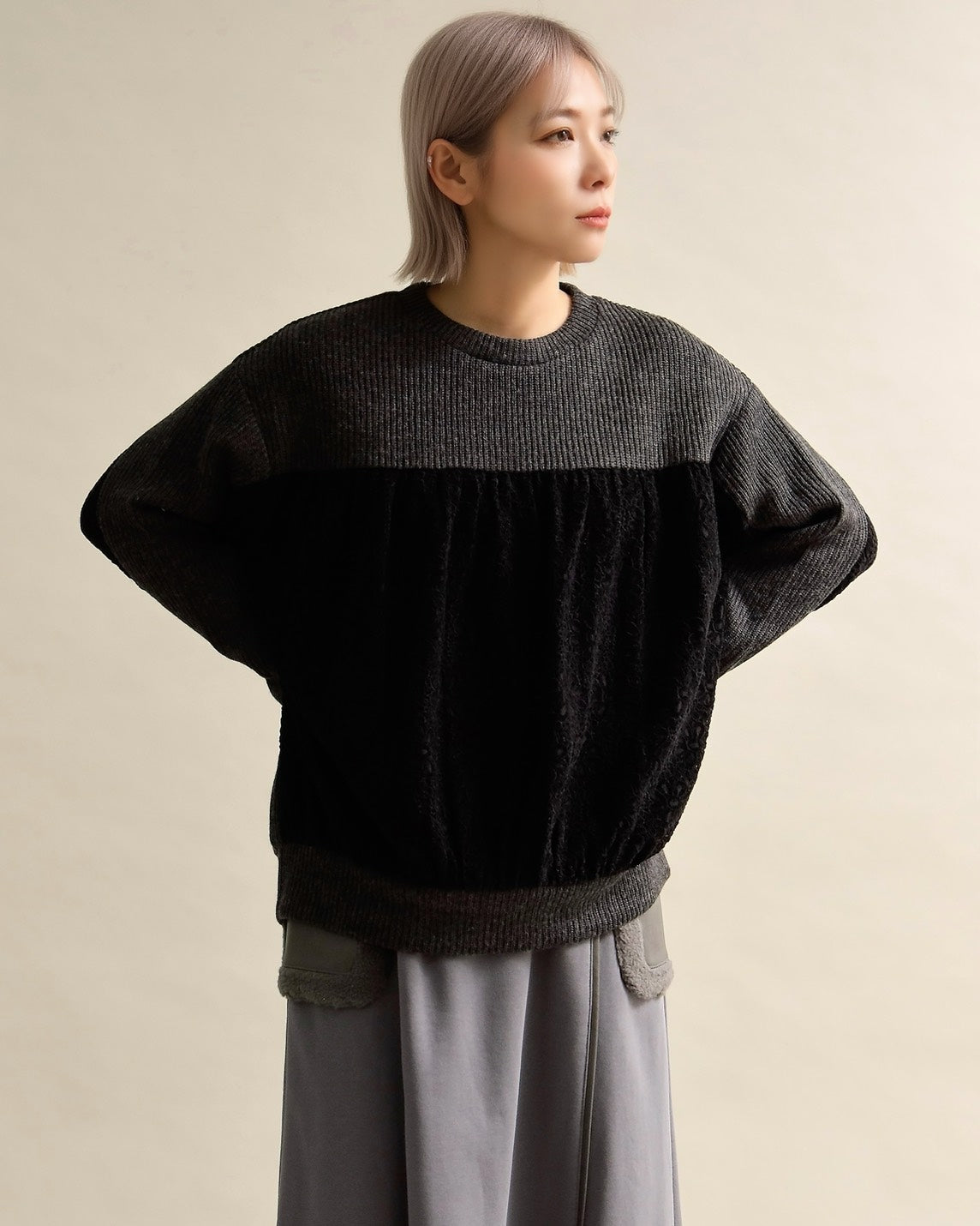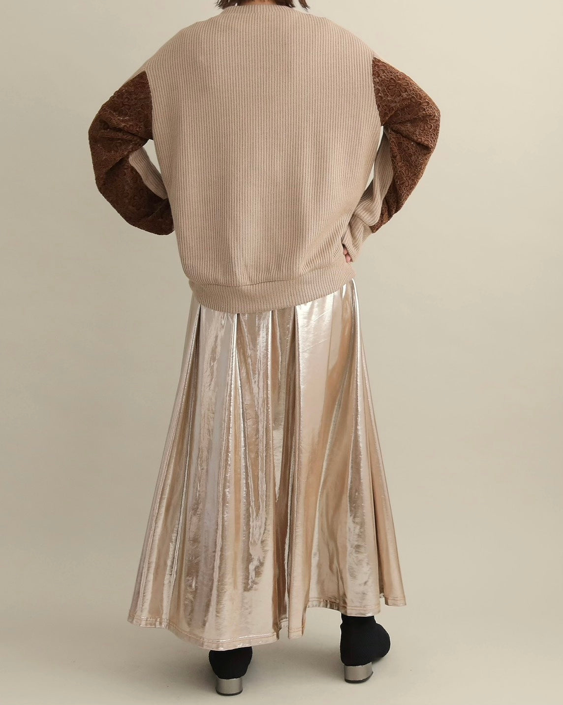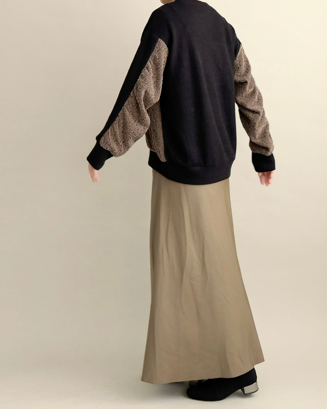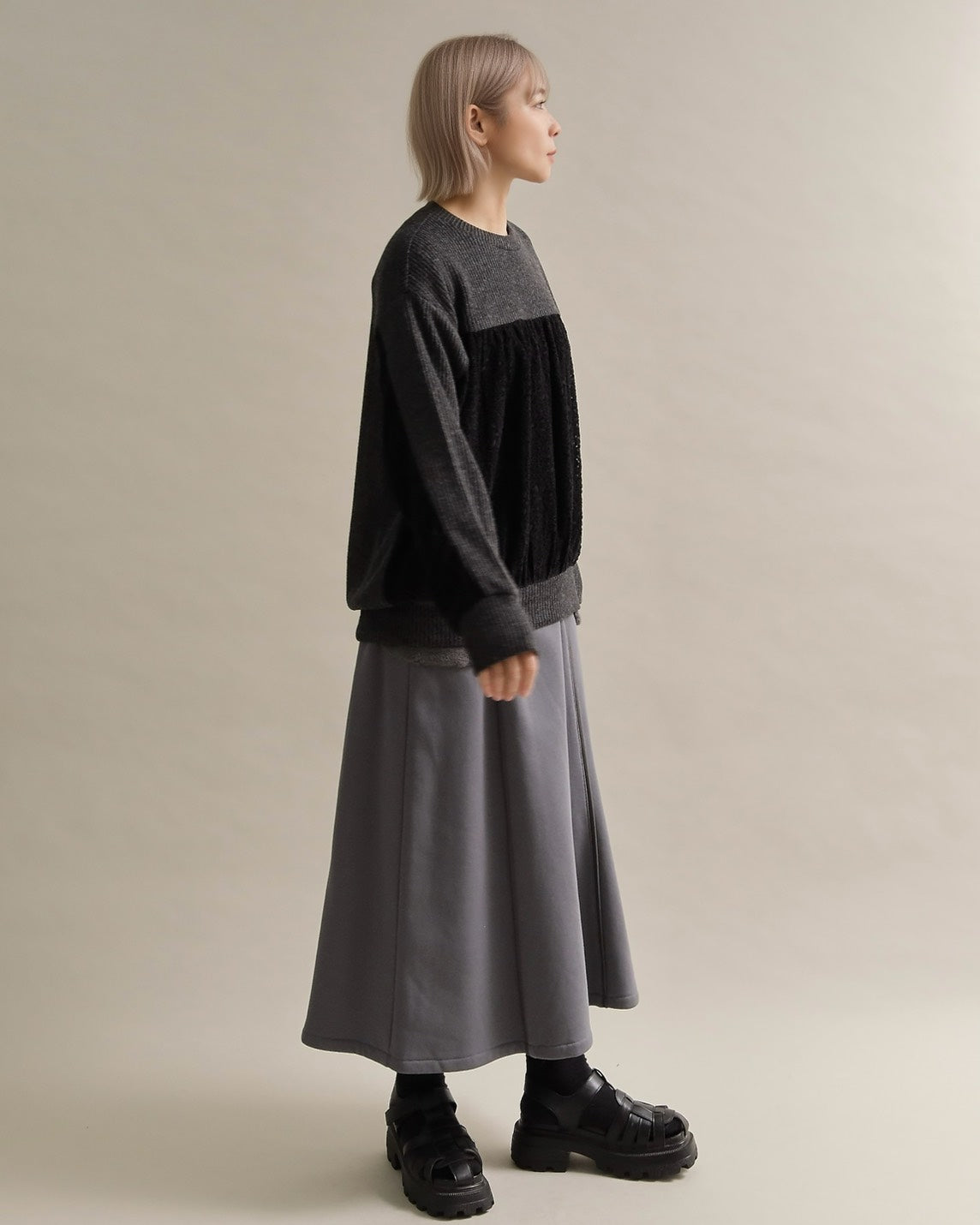 上身頃と袖には柔らかなリブニットを使用し、伸縮性のあるストレスフリーな着心地に。