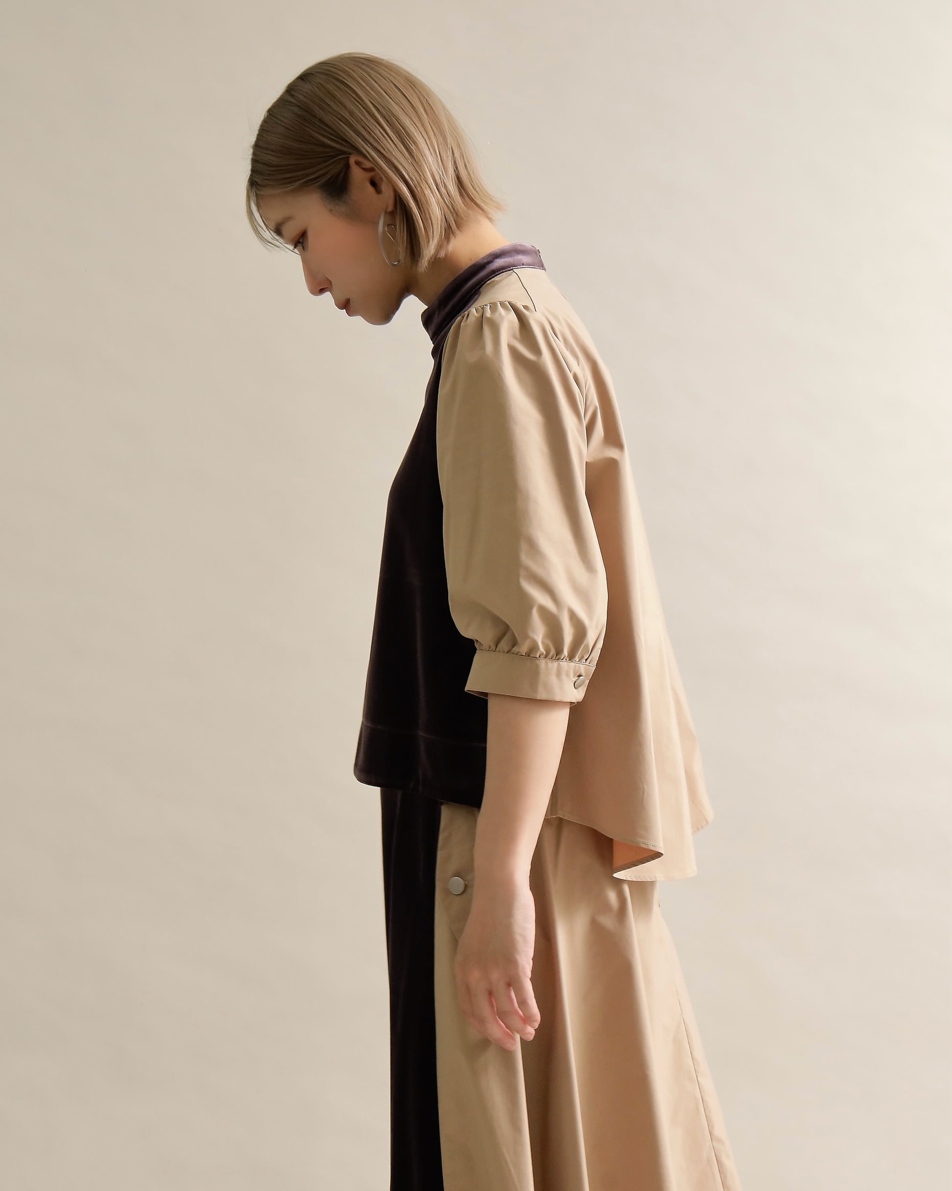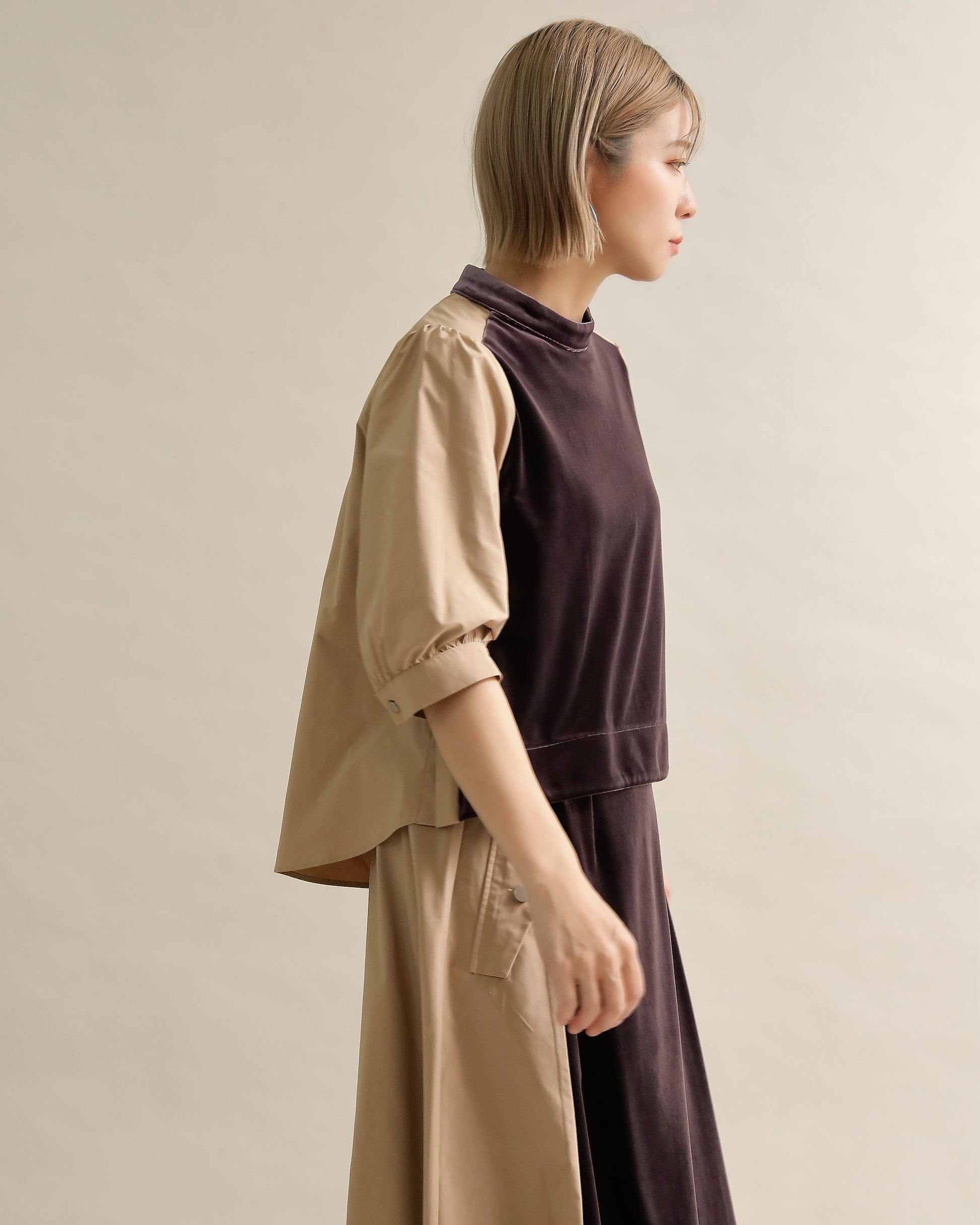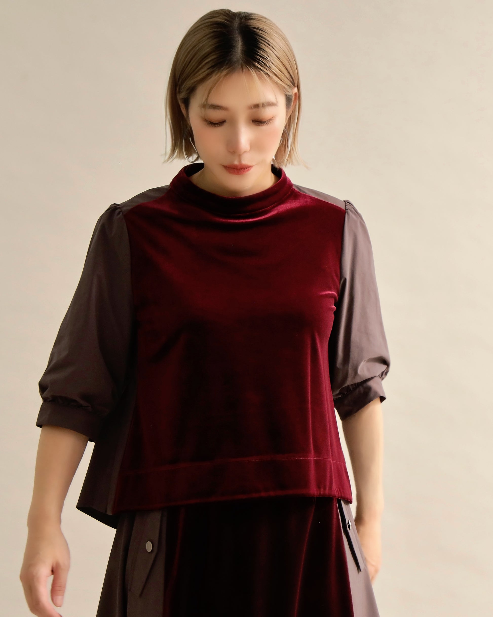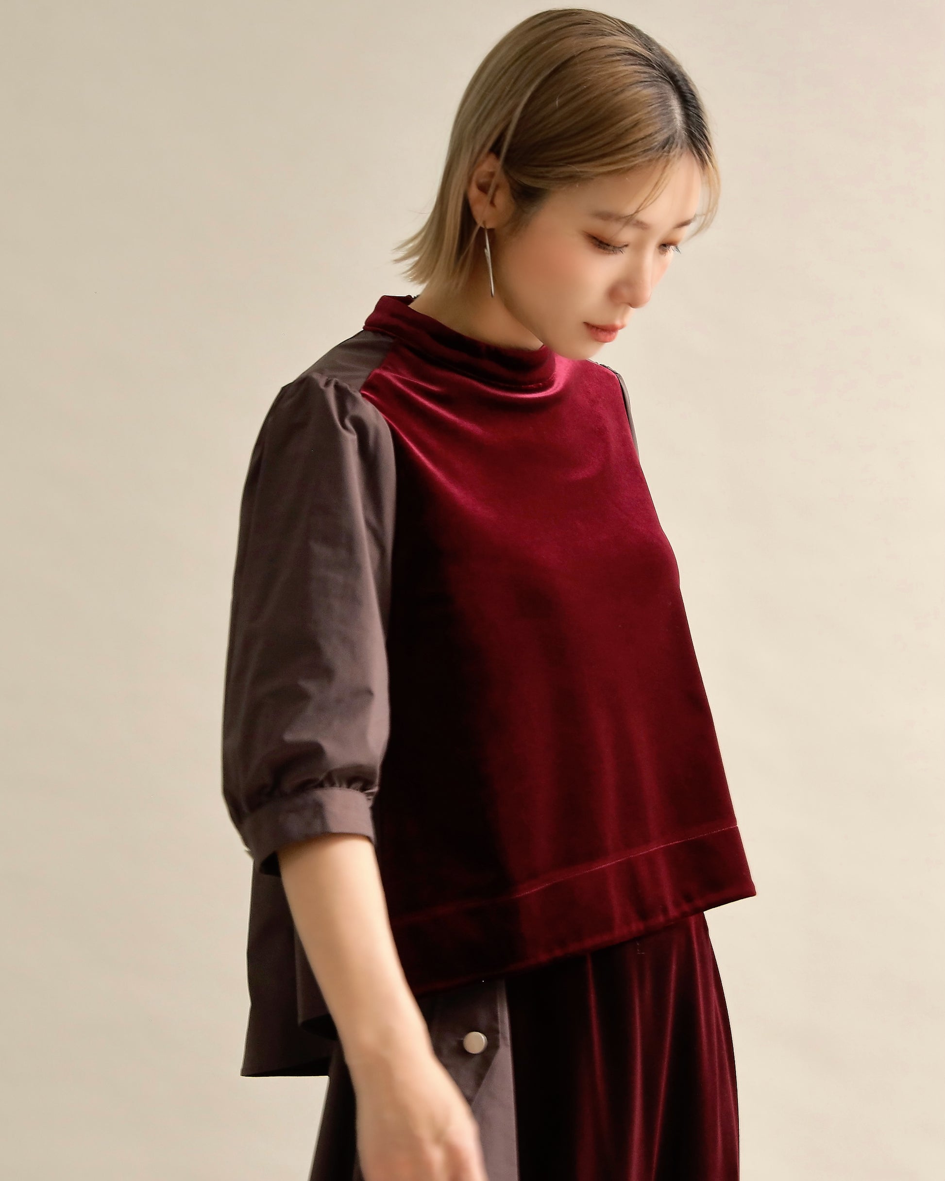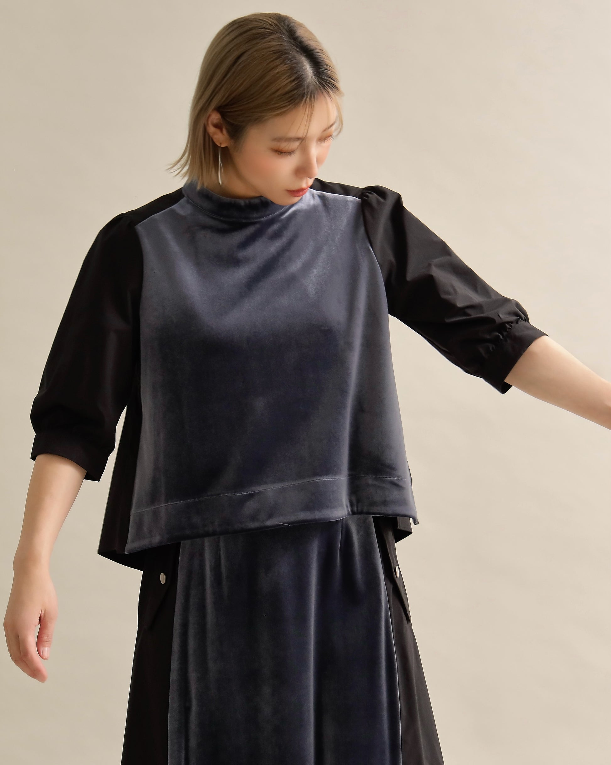 光沢のあるベロアと、ハリのある布帛スリーブを組み合わせた異素材トップス。