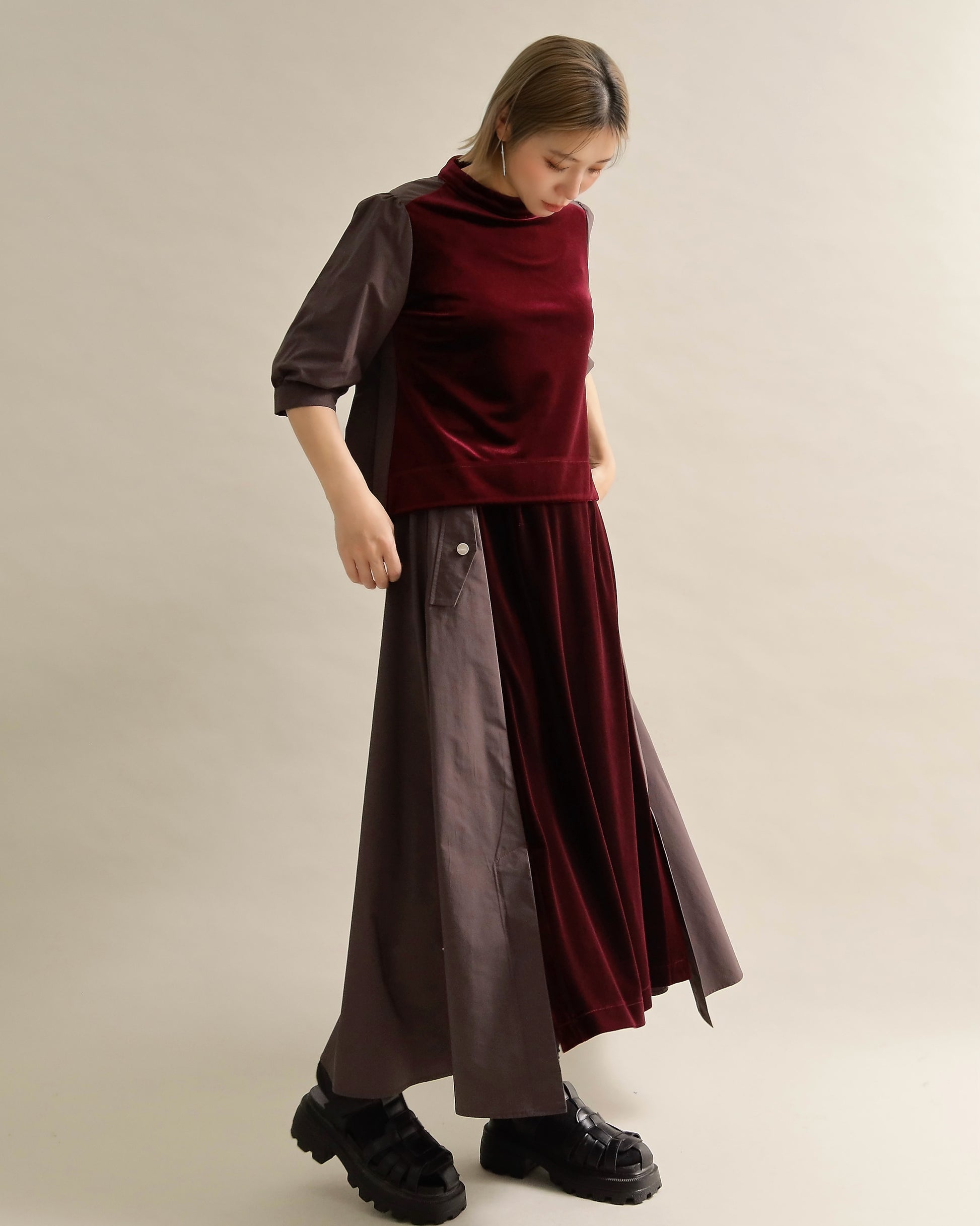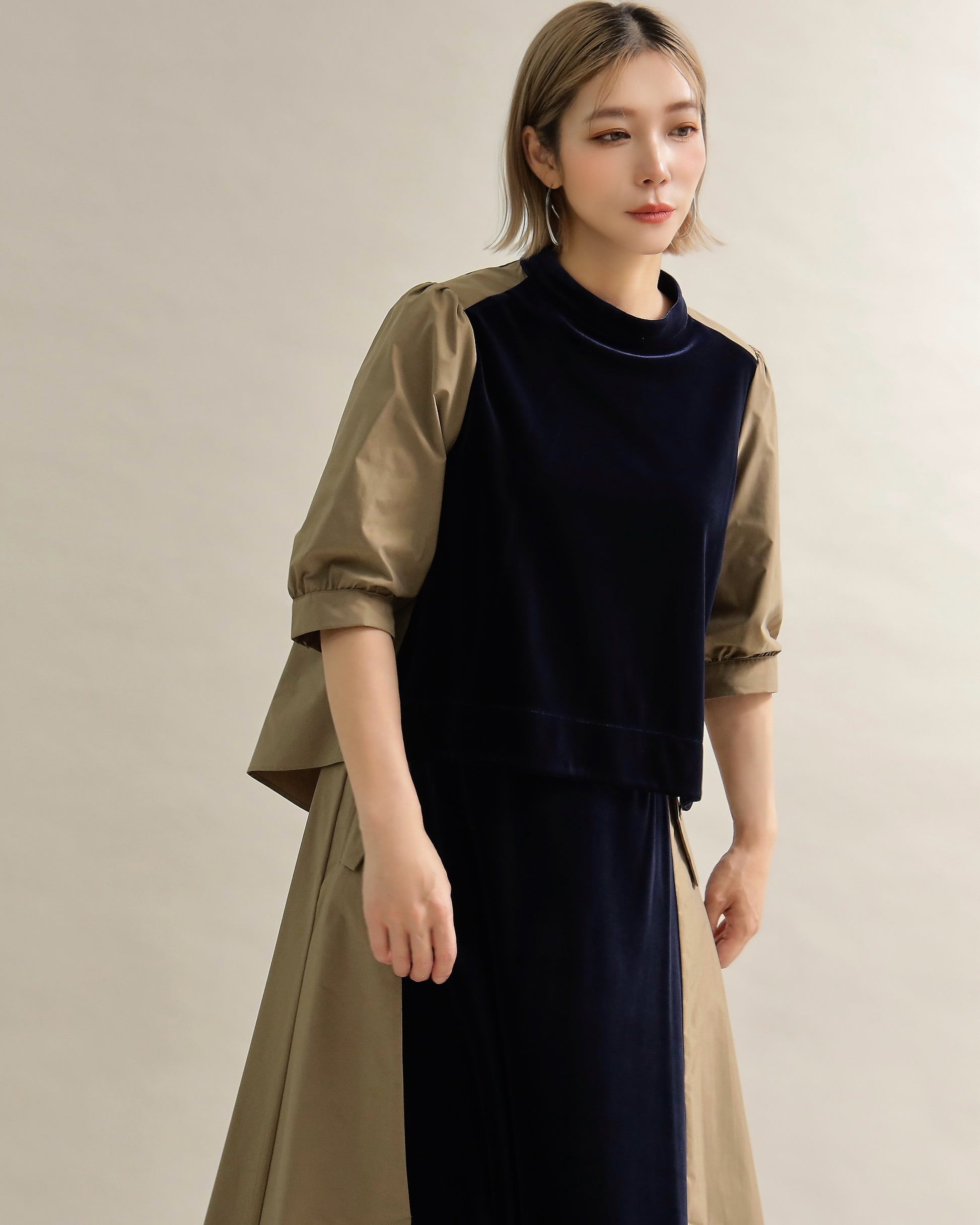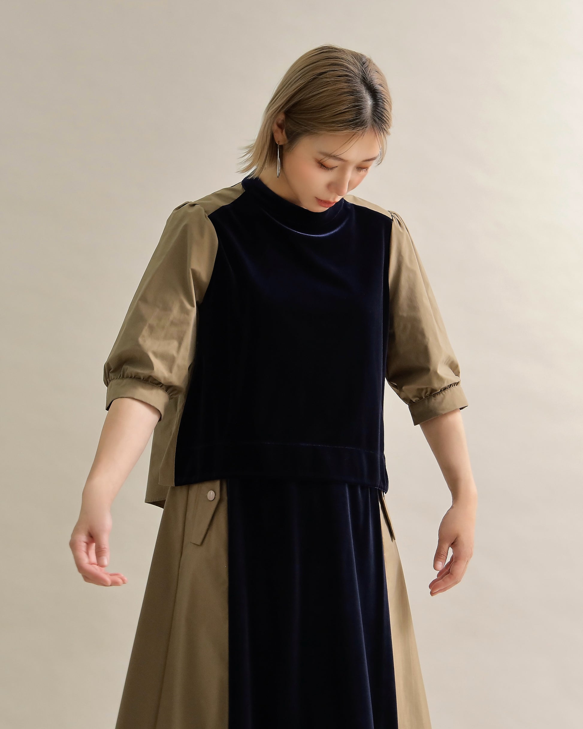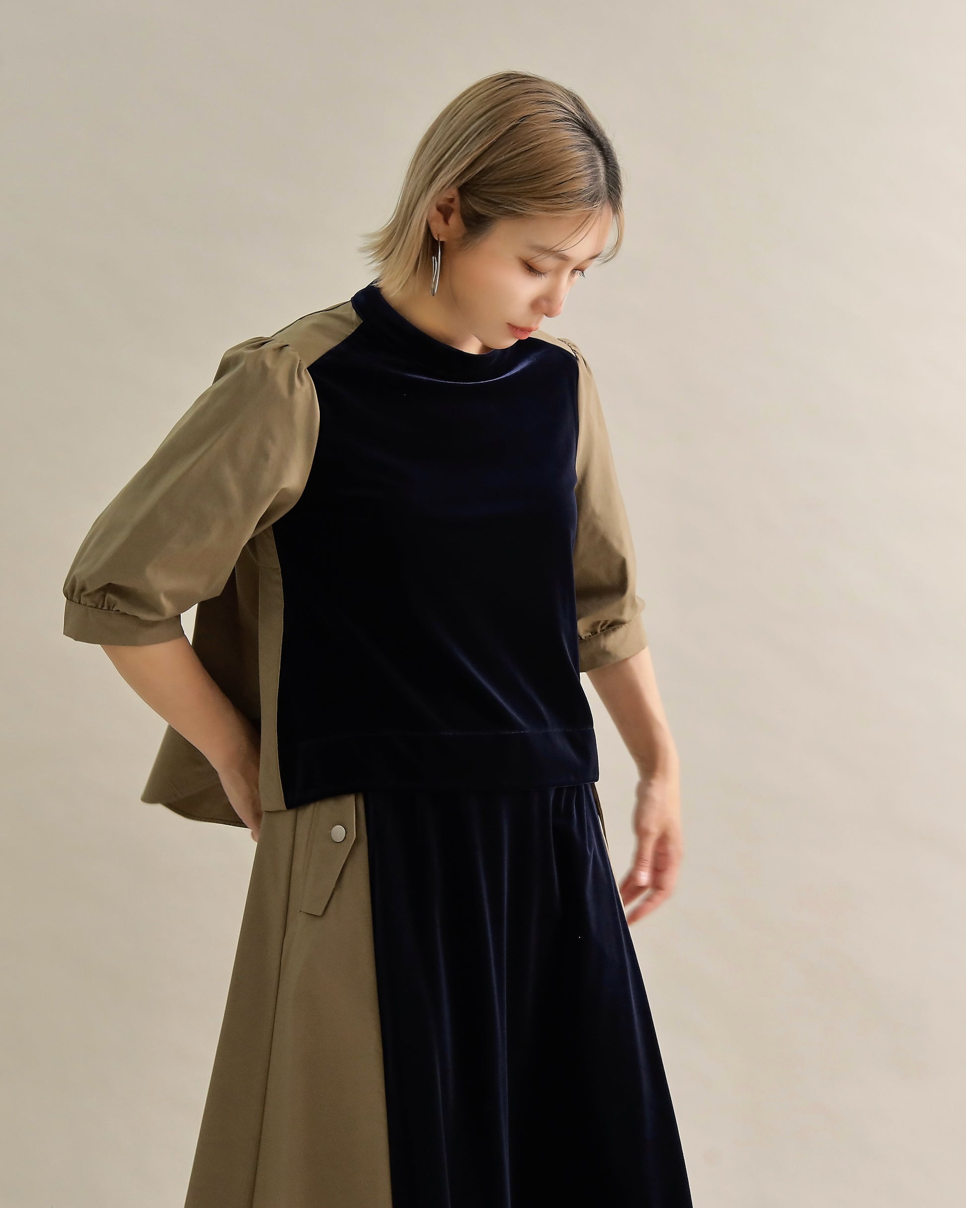 光沢のあるベロアと、ハリのある布帛スリーブを組み合わせた異素材トップス。