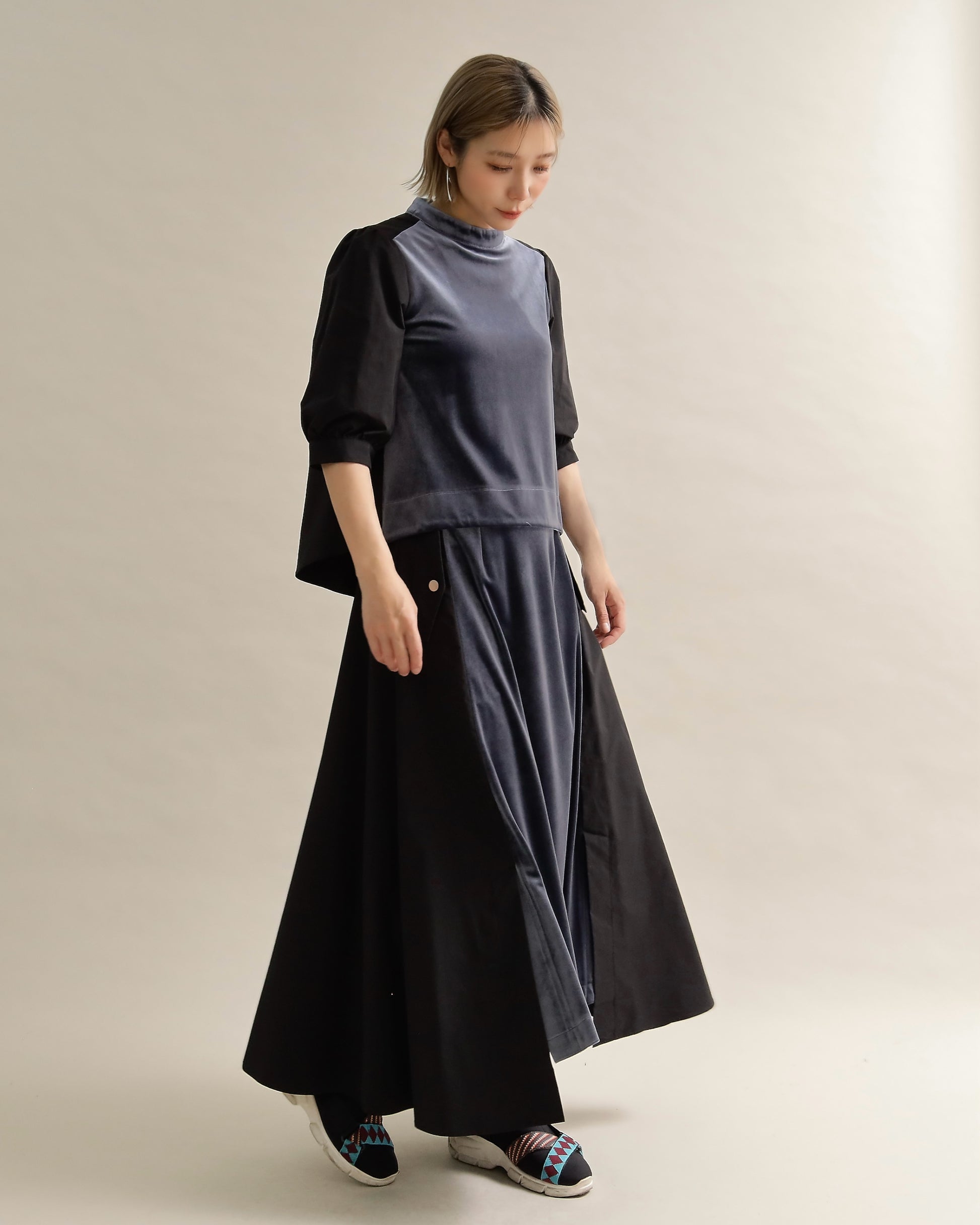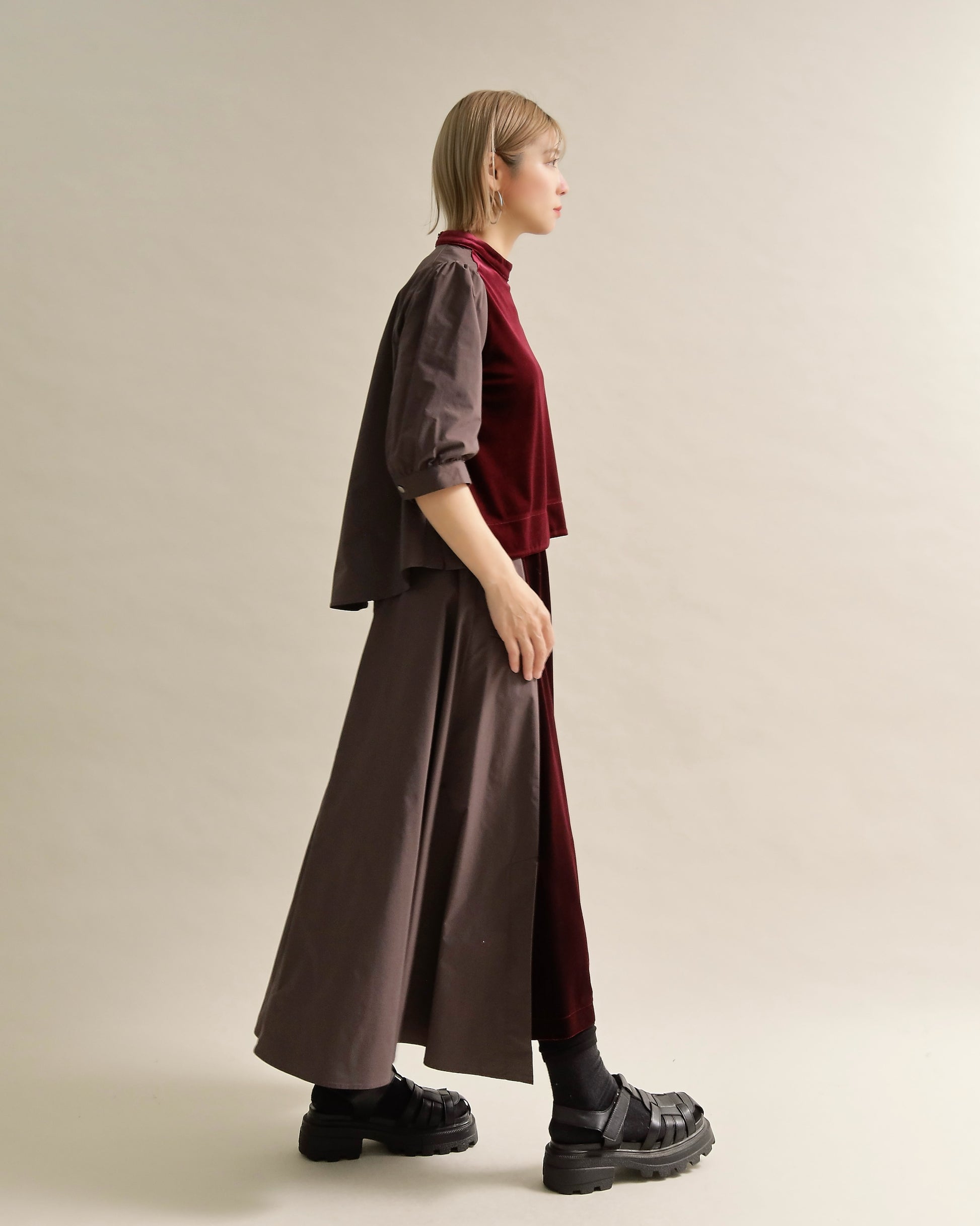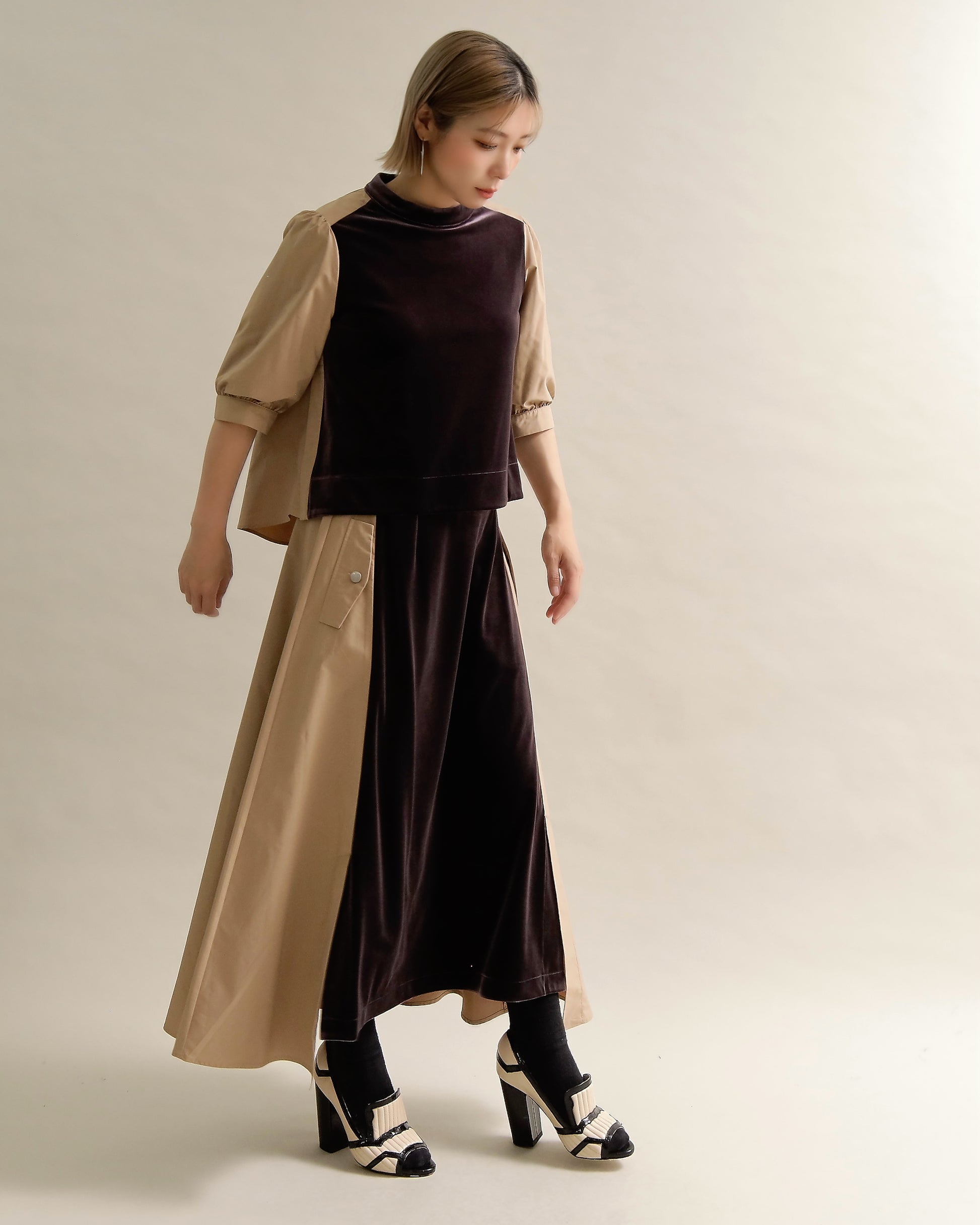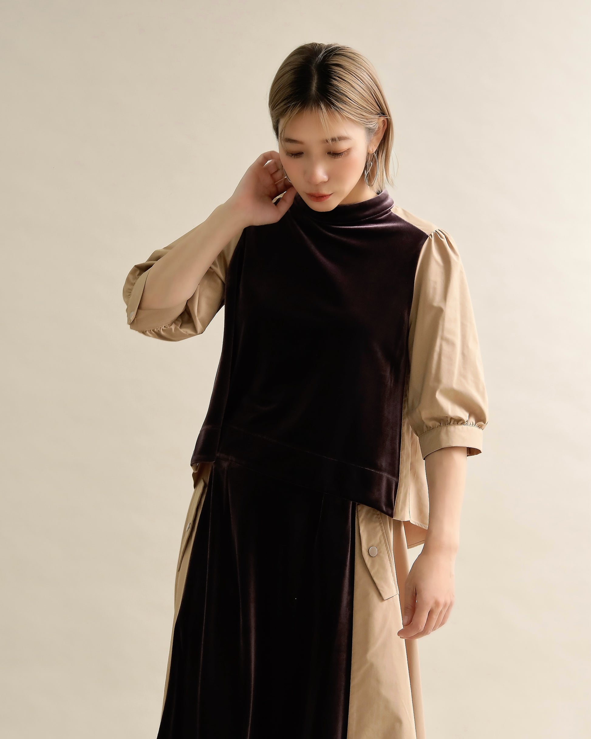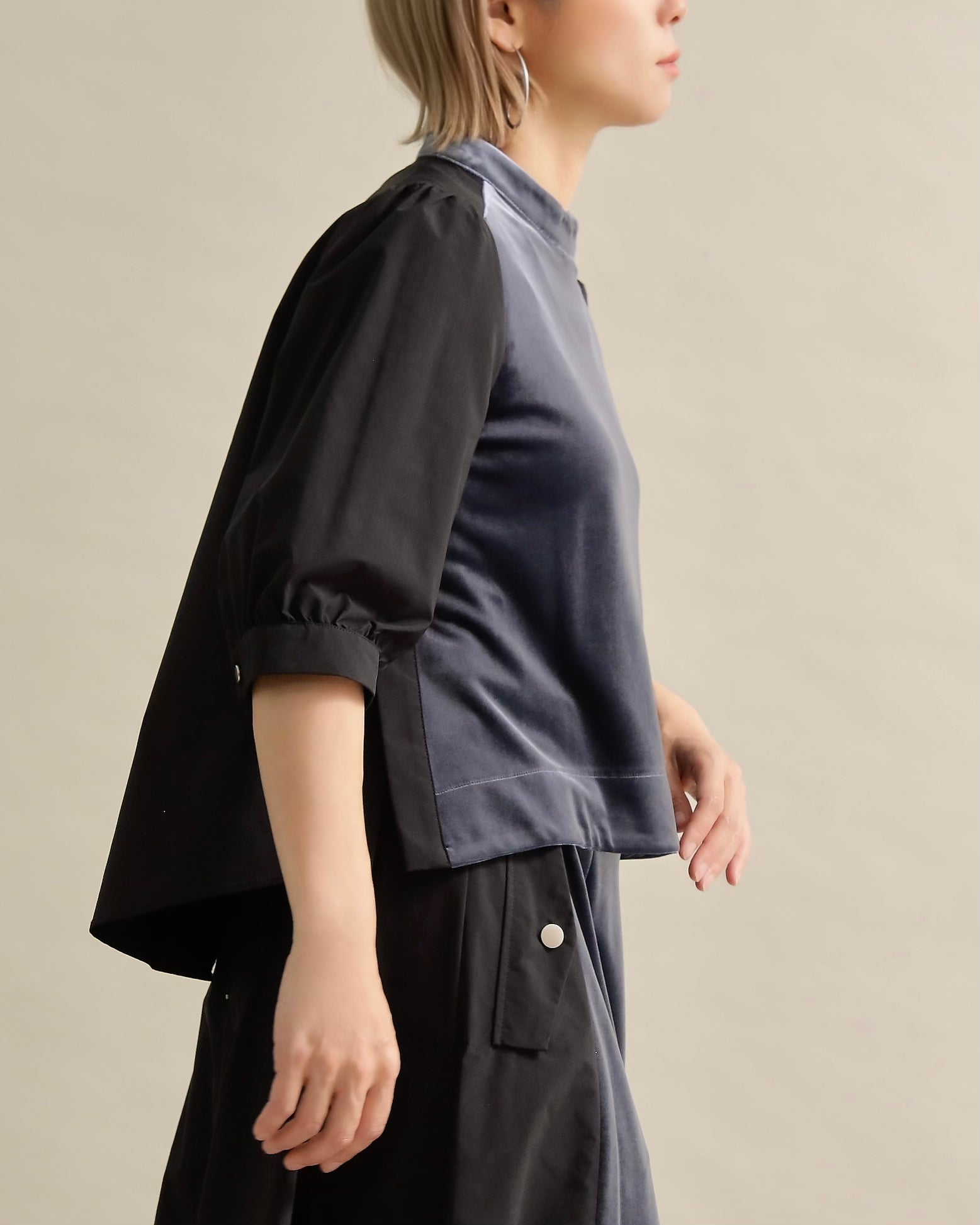 光沢のあるベロアと、ハリのある布帛スリーブを組み合わせた異素材トップス。