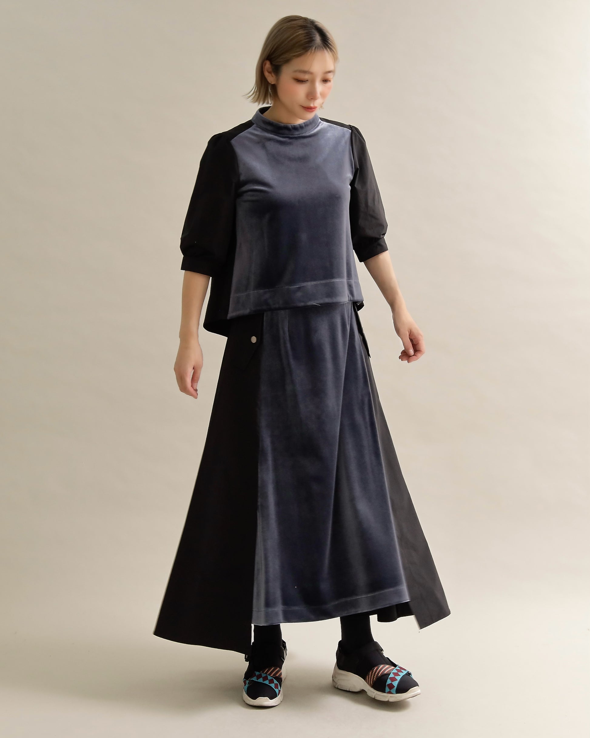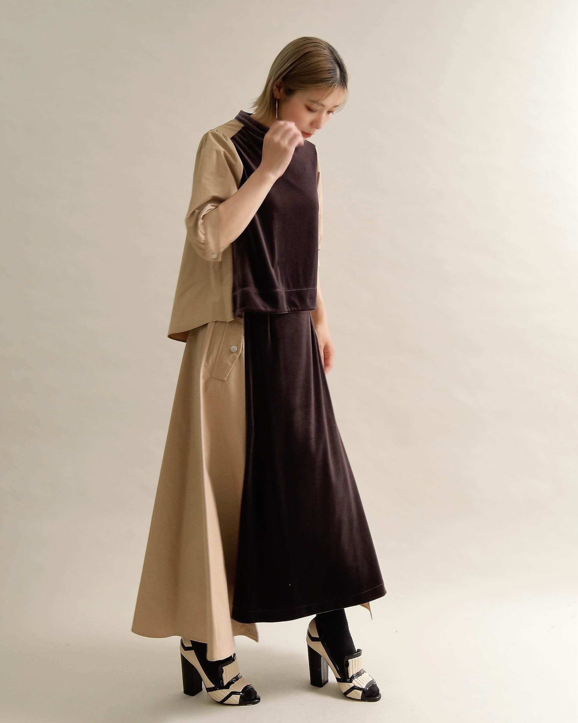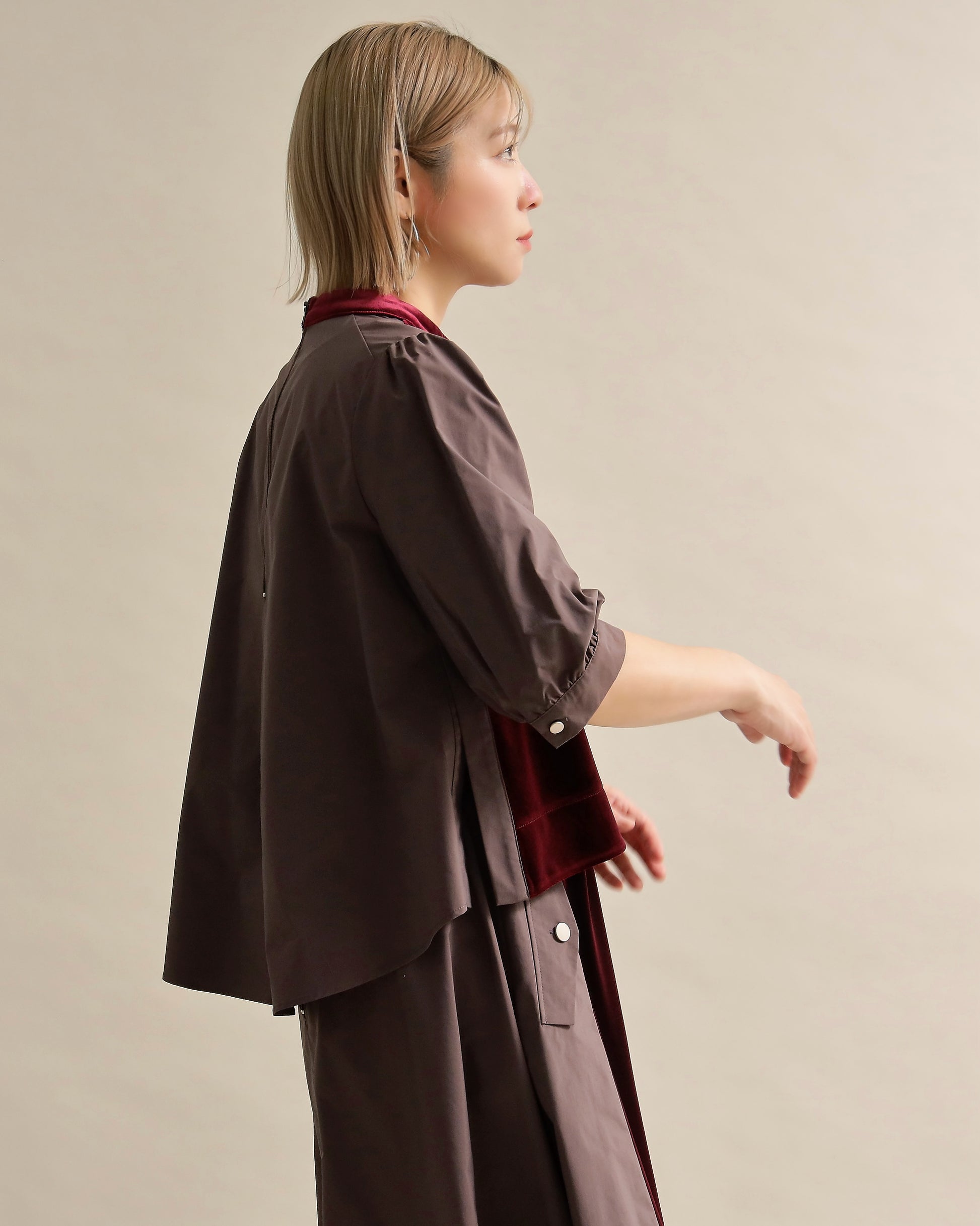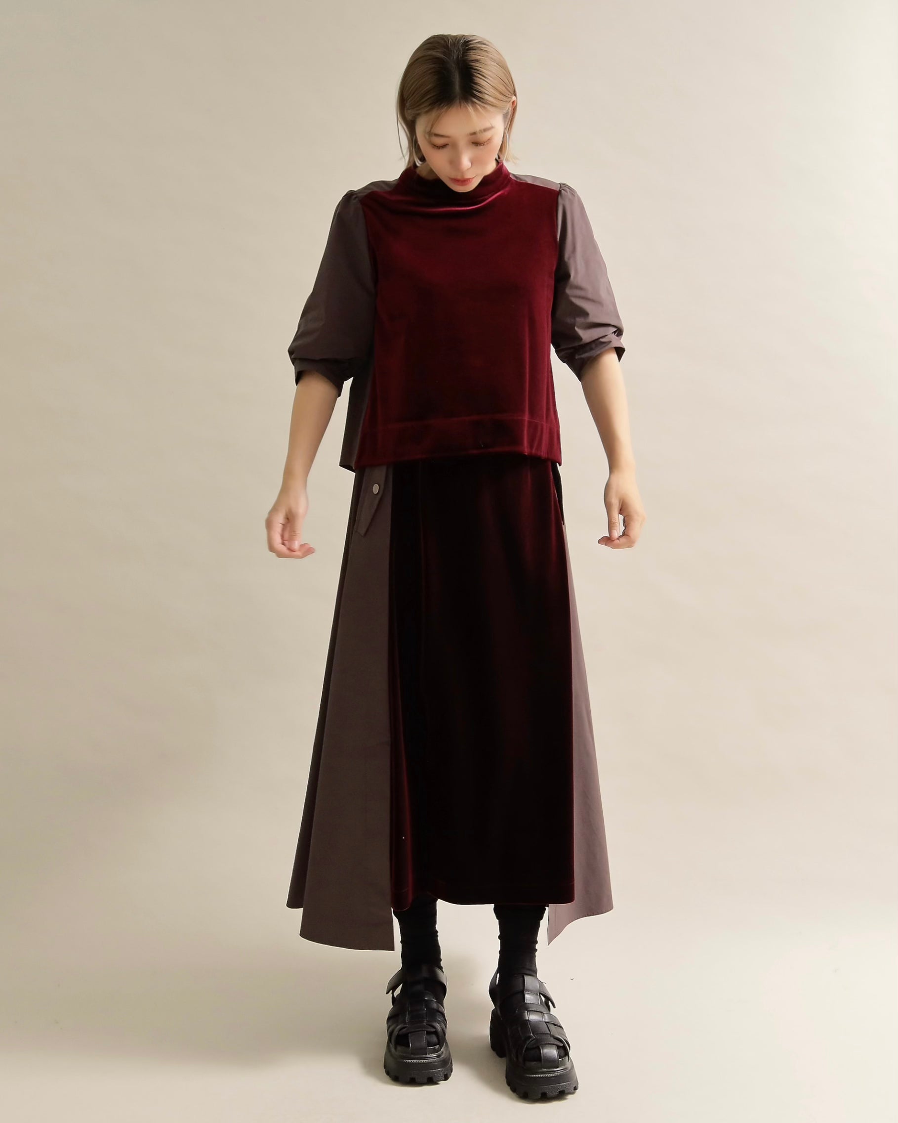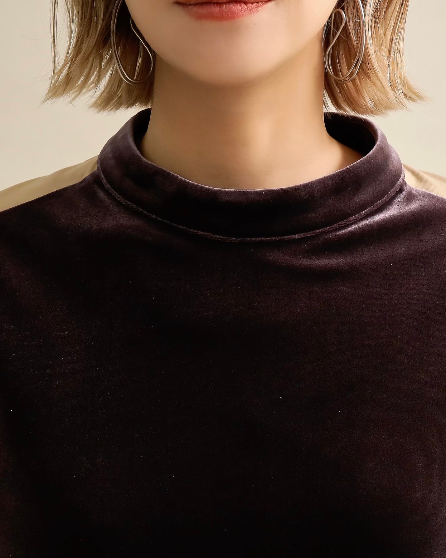 光沢のあるベロアと、ハリのある布帛スリーブを組み合わせた異素材トップス。