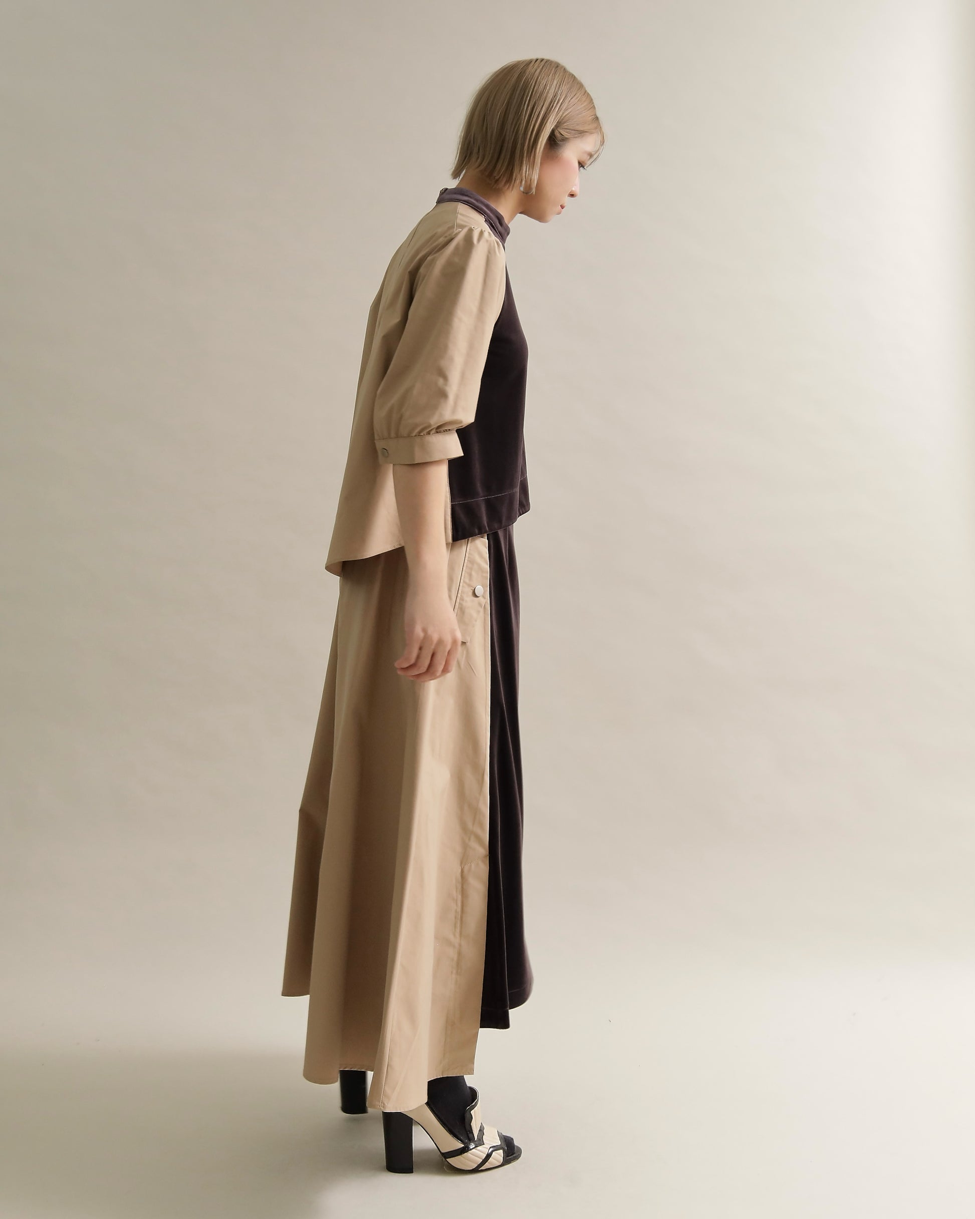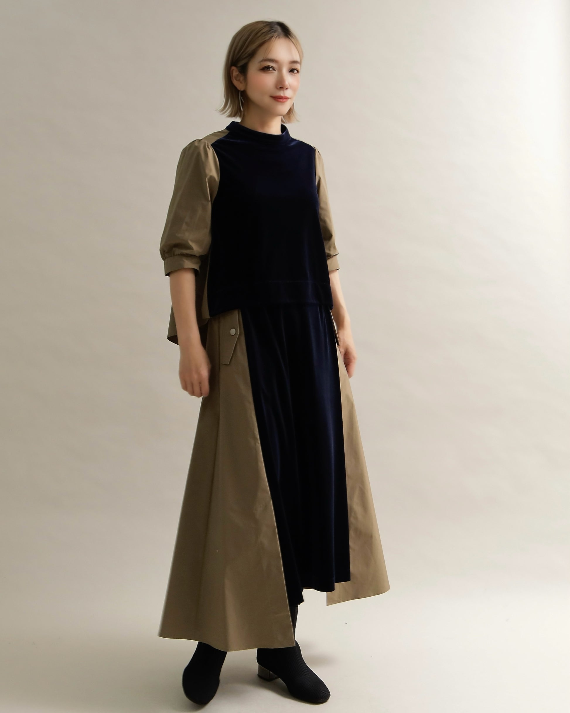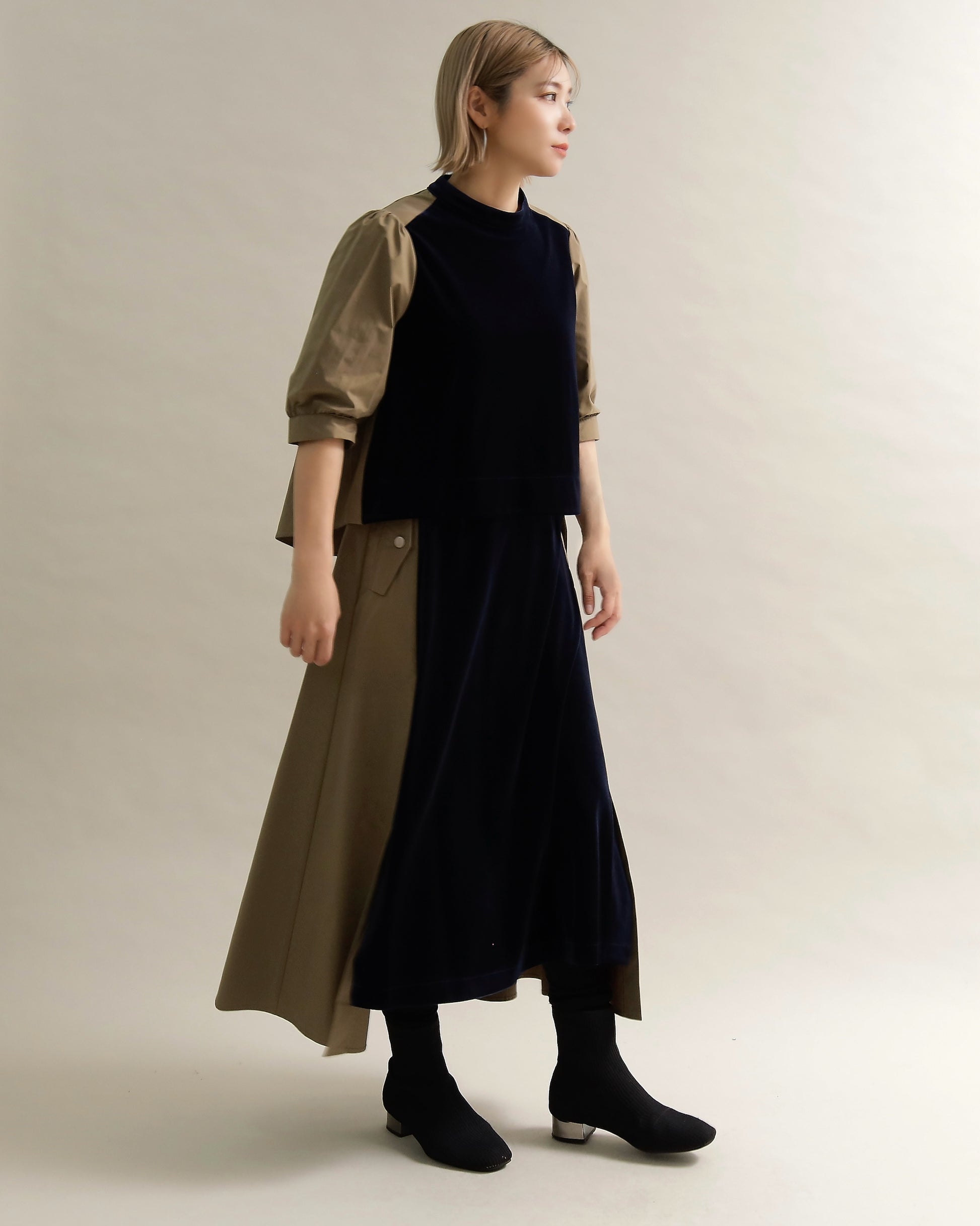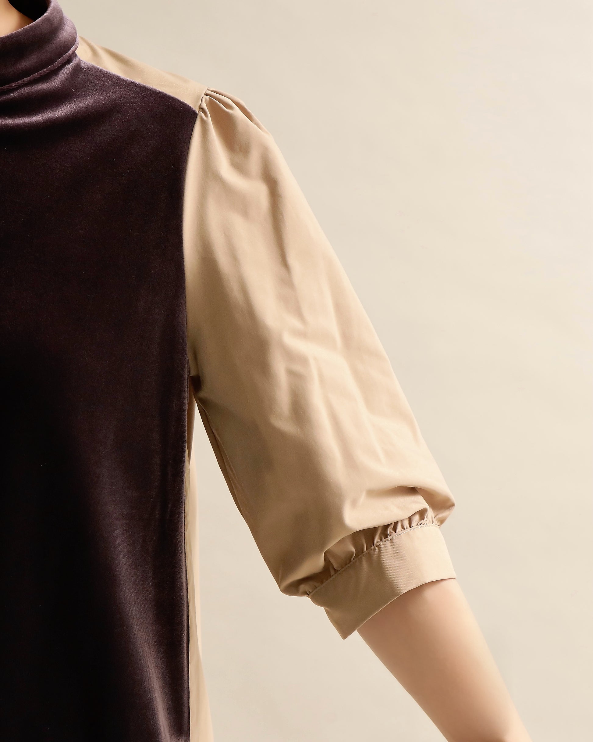光沢のあるベロアと、ハリのある布帛スリーブを組み合わせた異素材トップス。