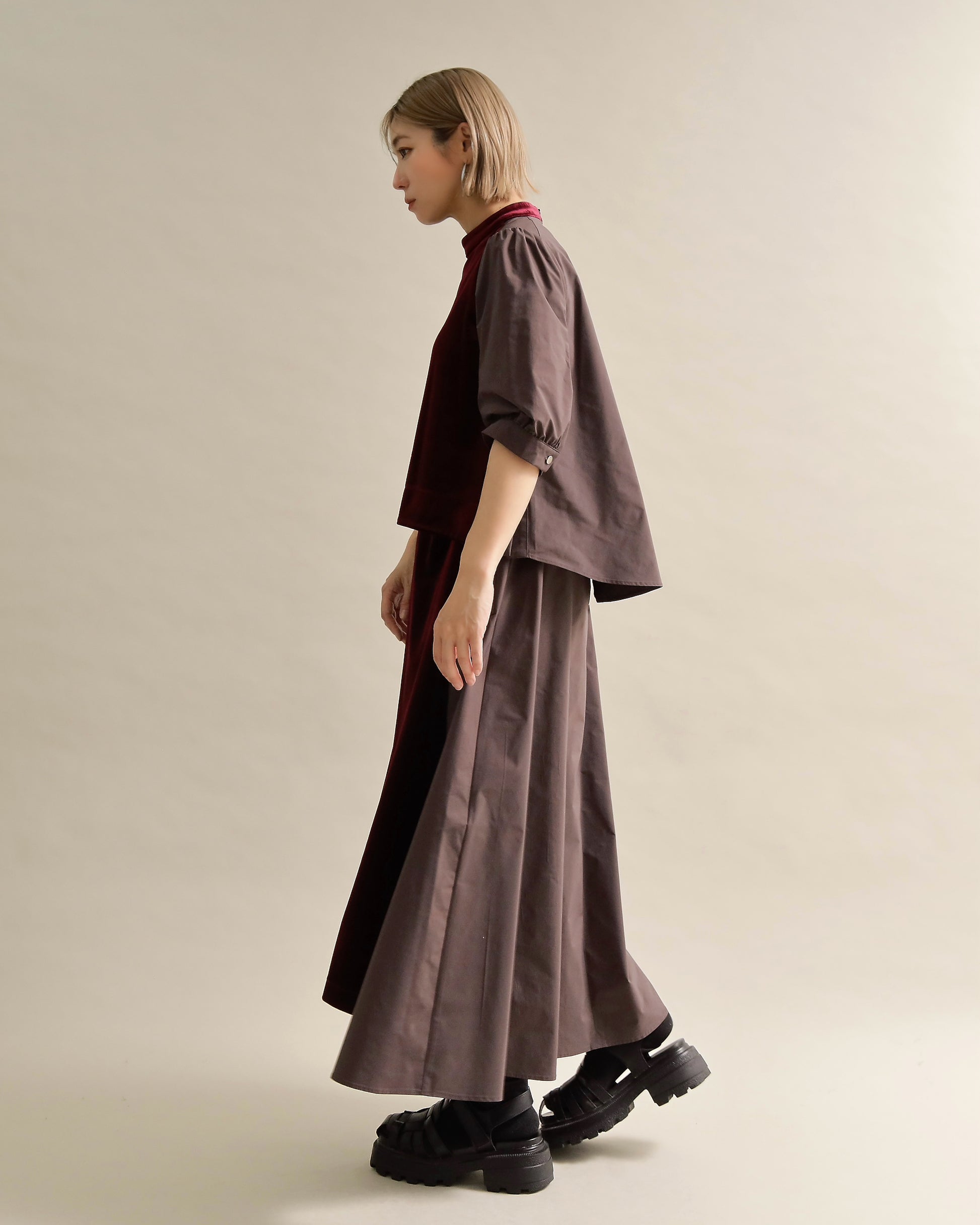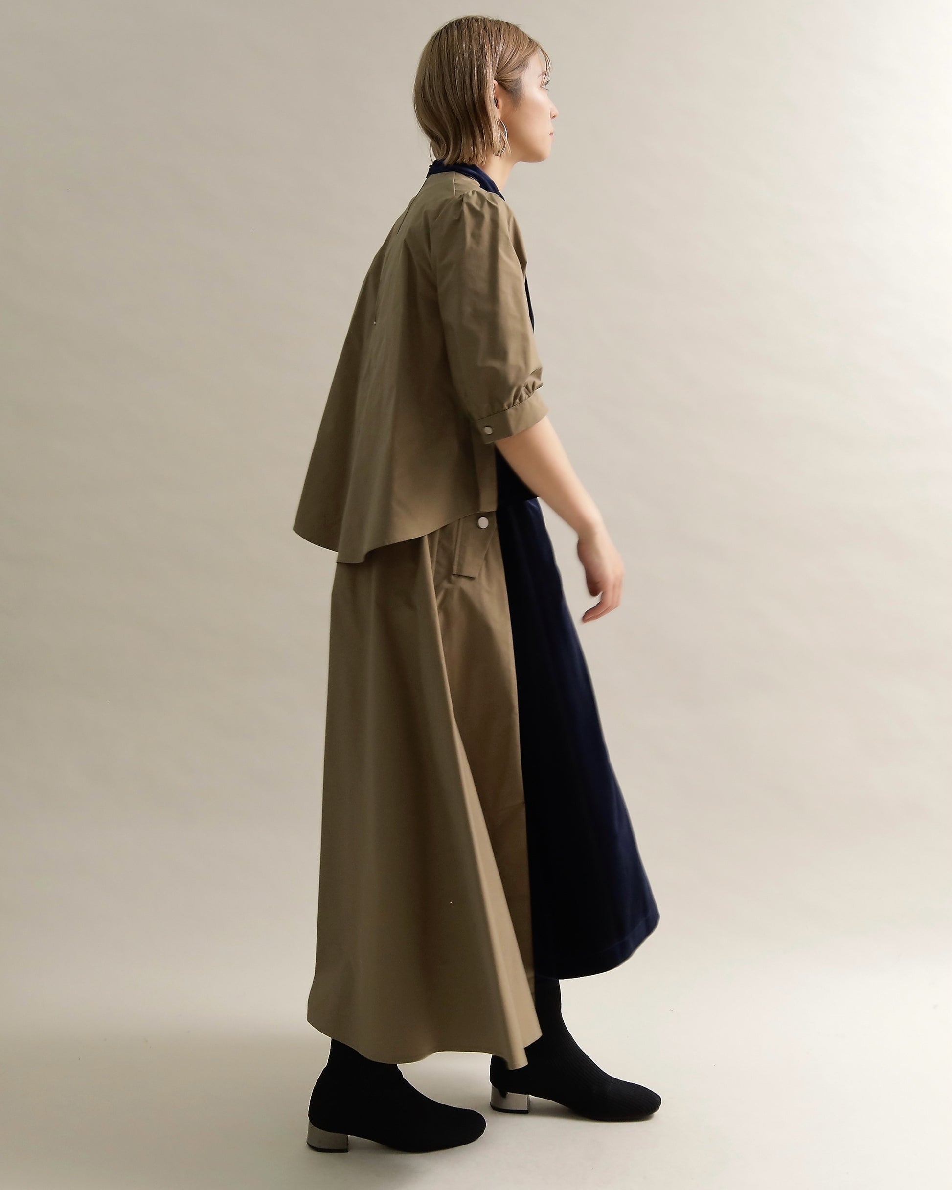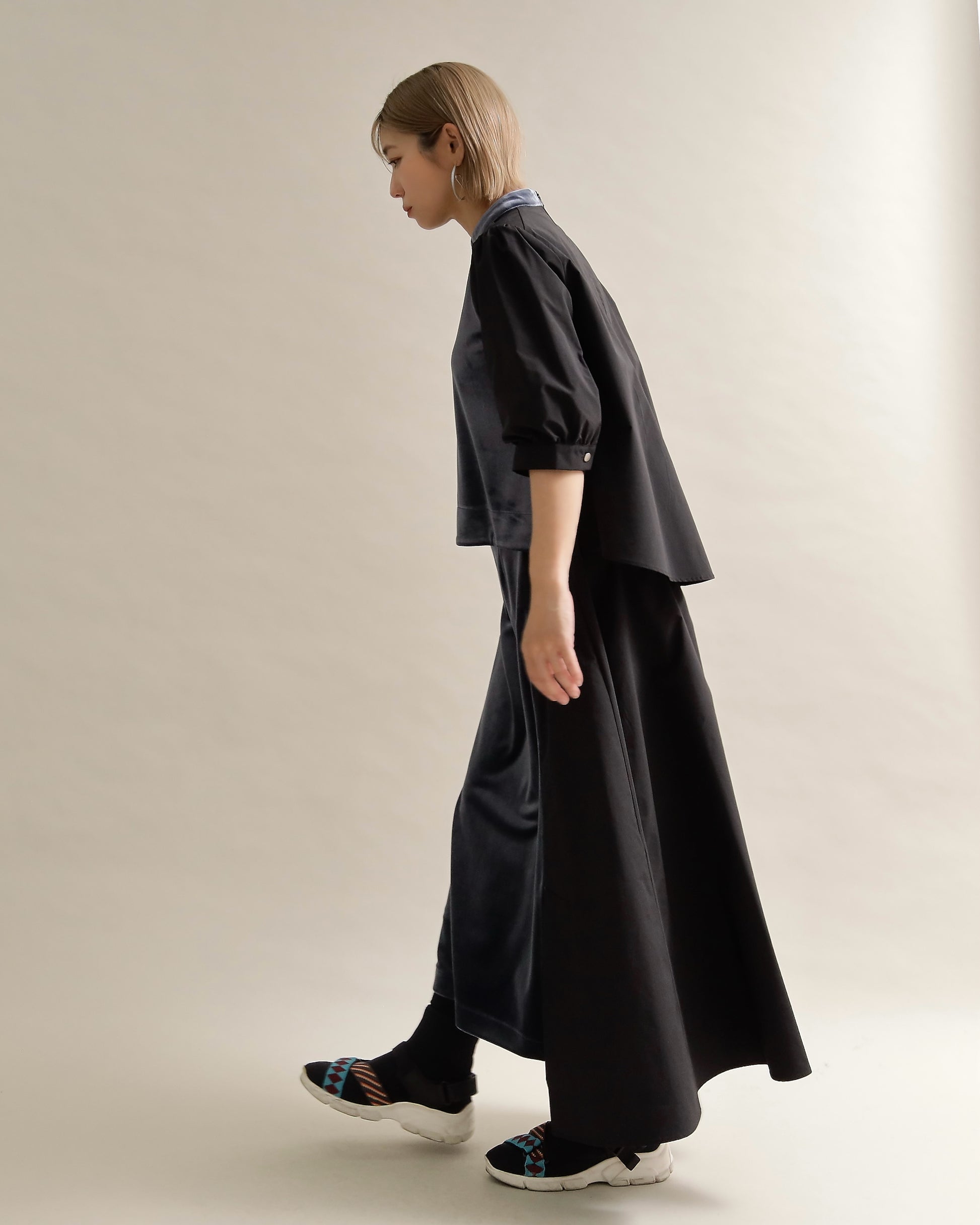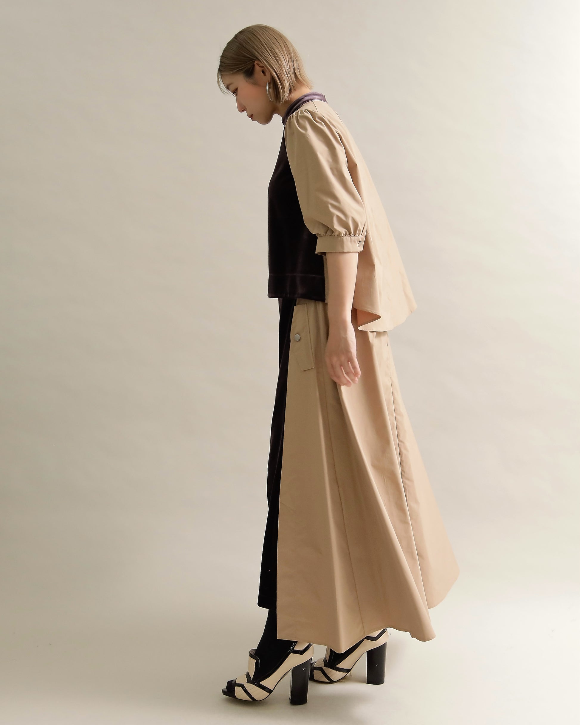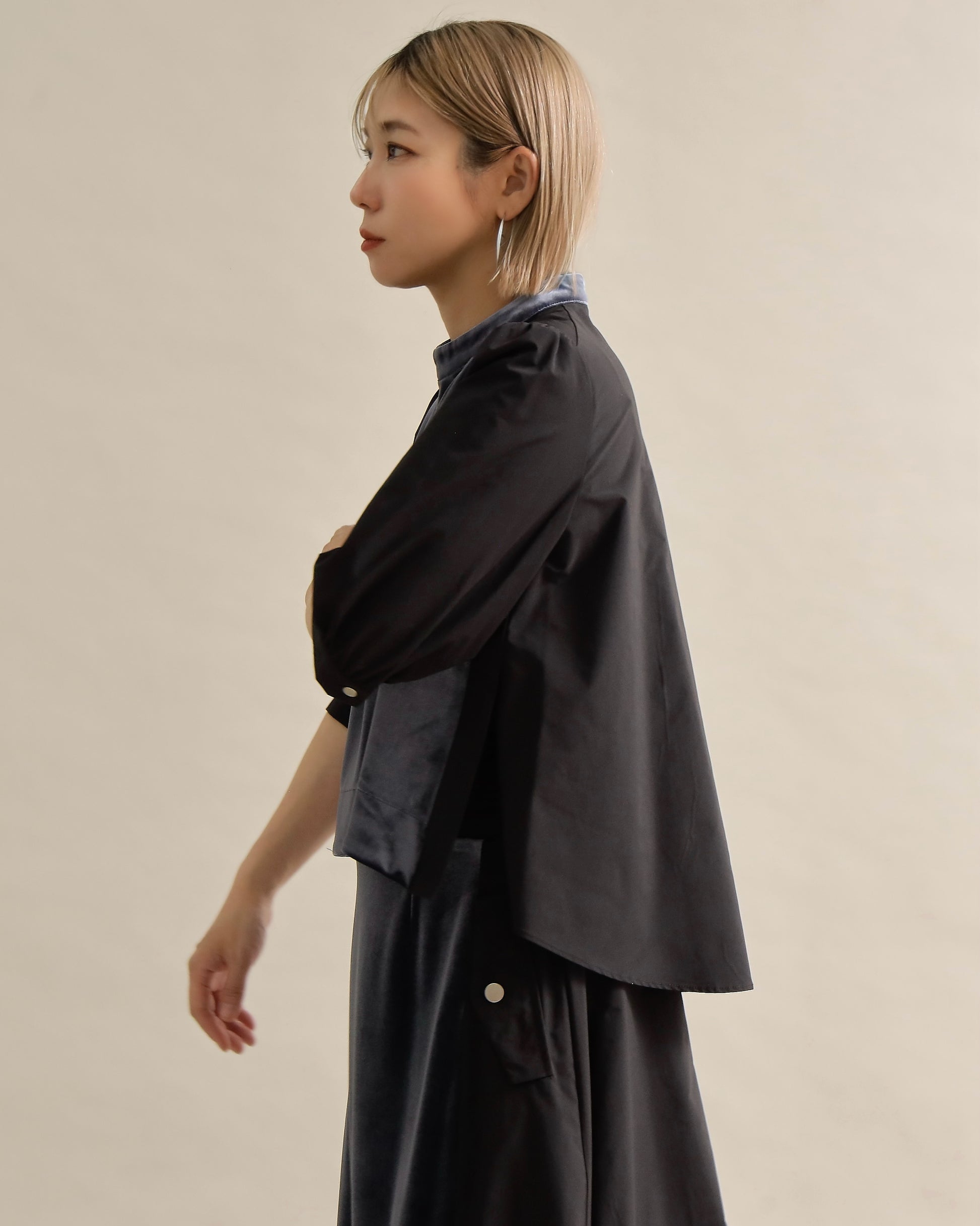 光沢のあるベロアと、ハリのある布帛スリーブを組み合わせた異素材トップス。