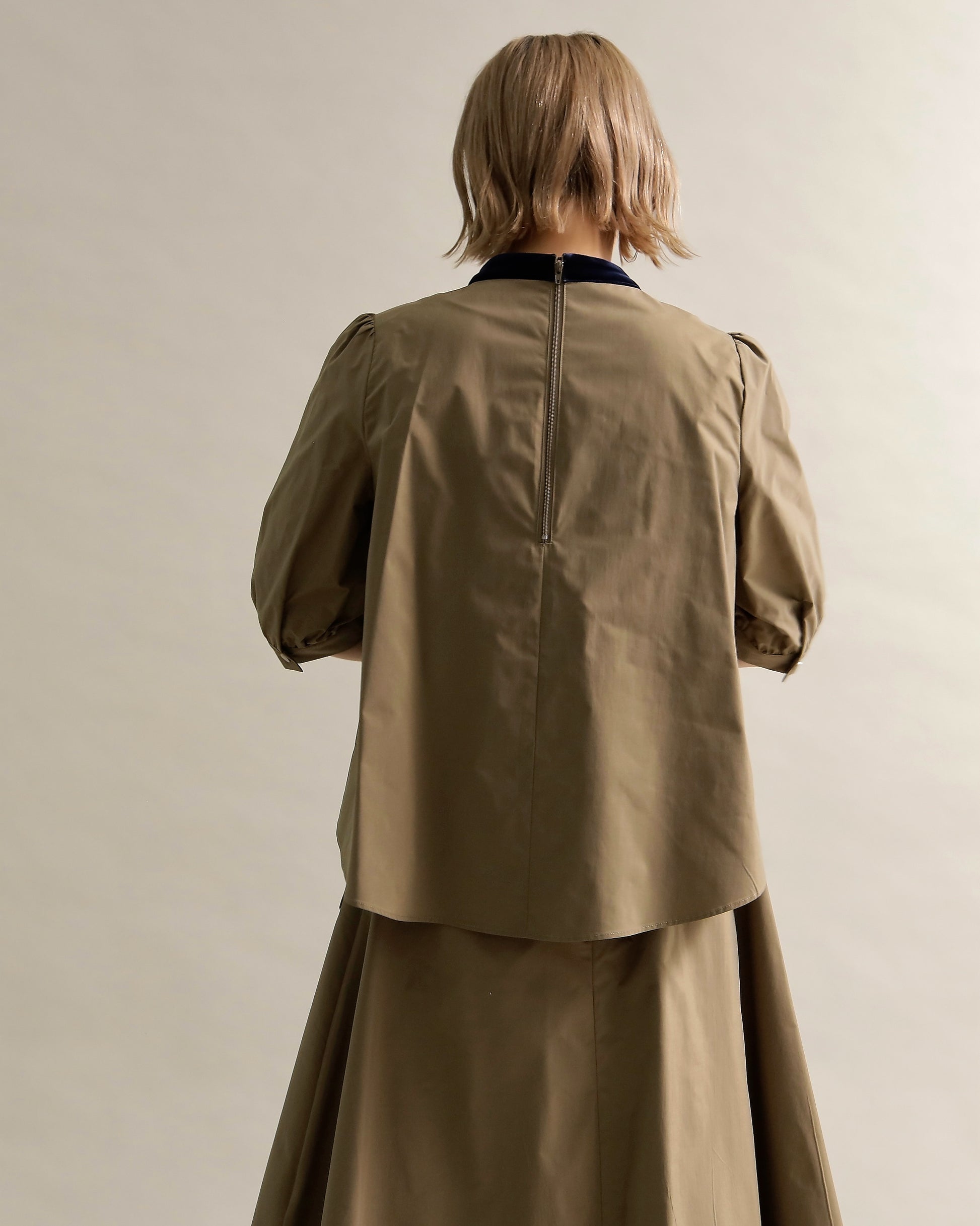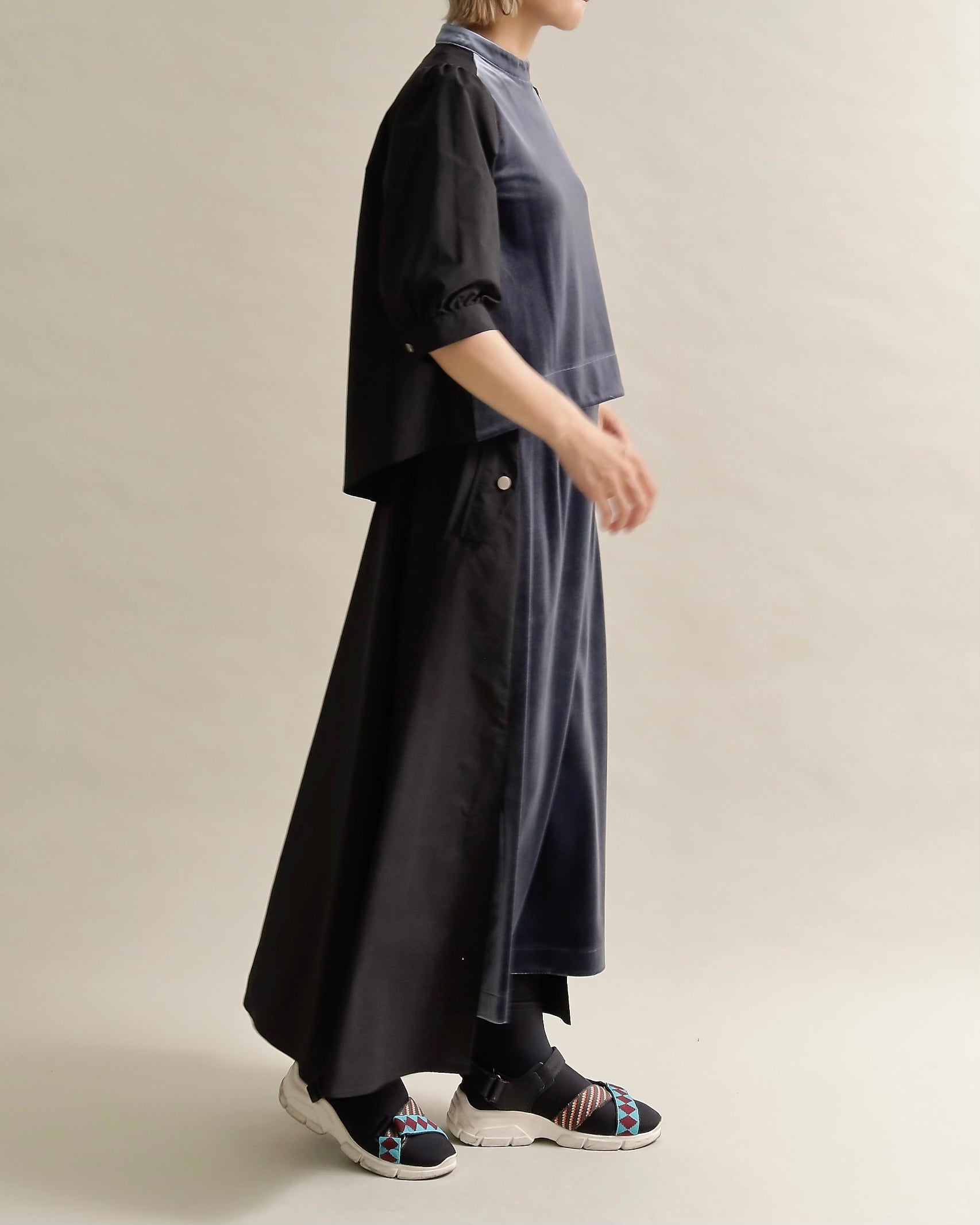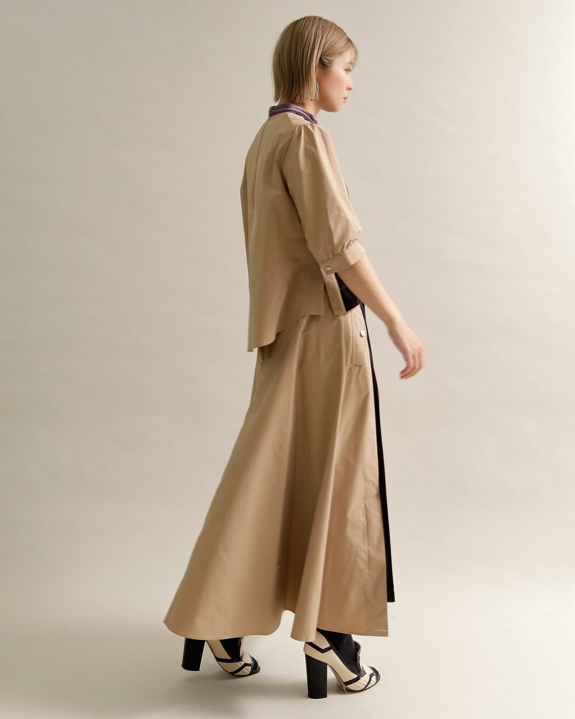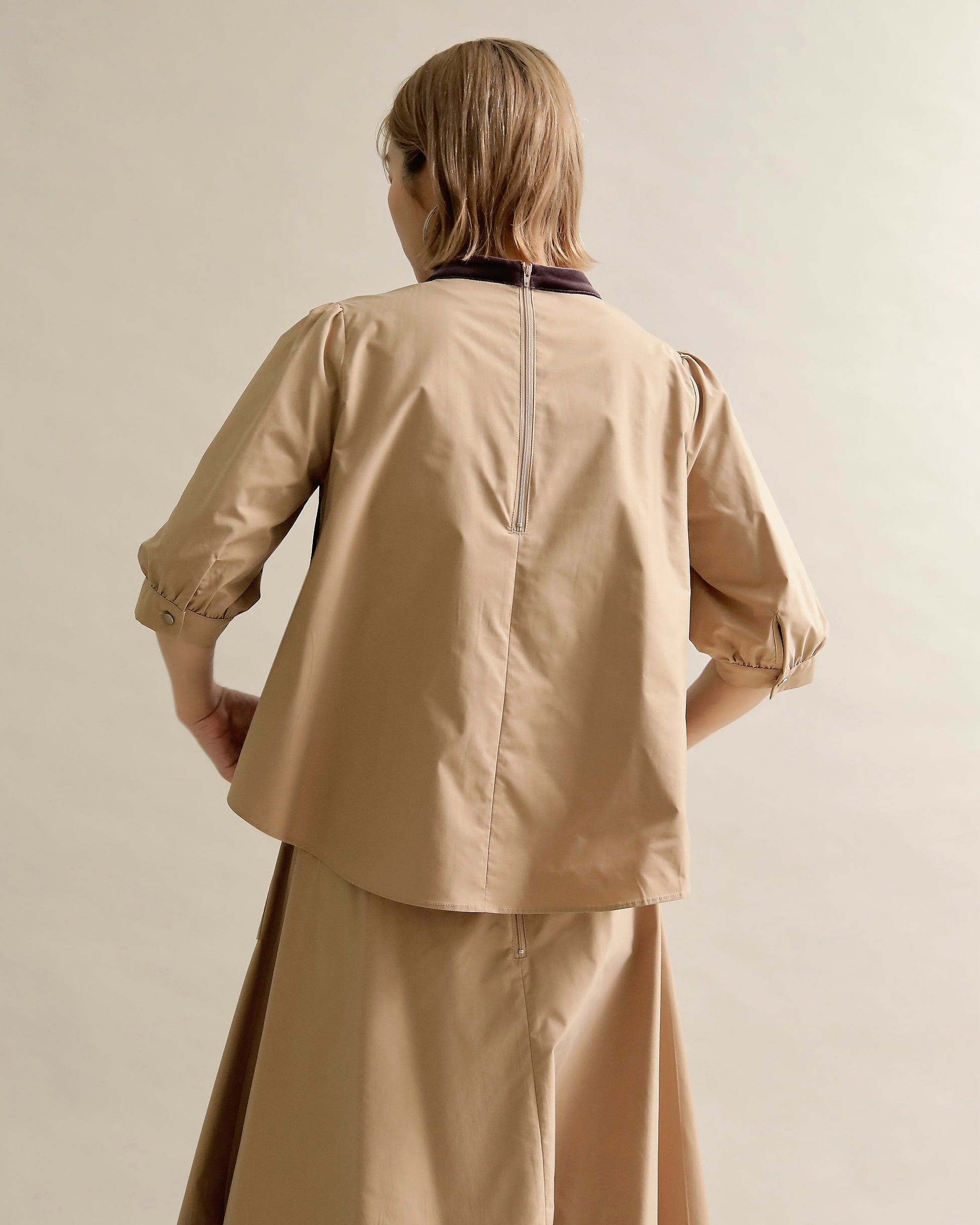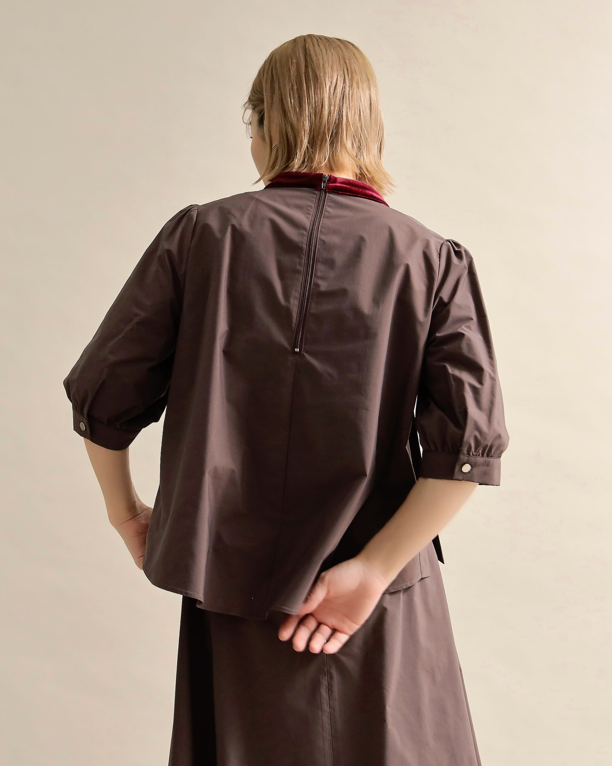 光沢のあるベロアと、ハリのある布帛スリーブを組み合わせた異素材トップス。