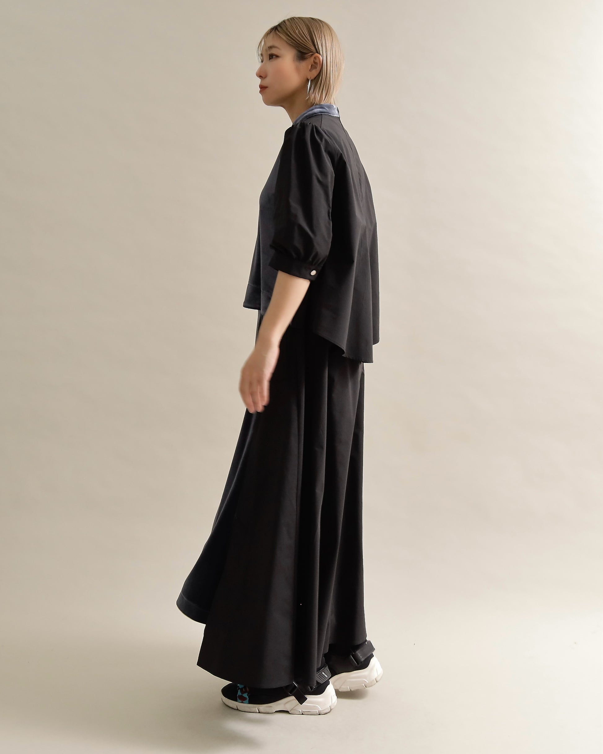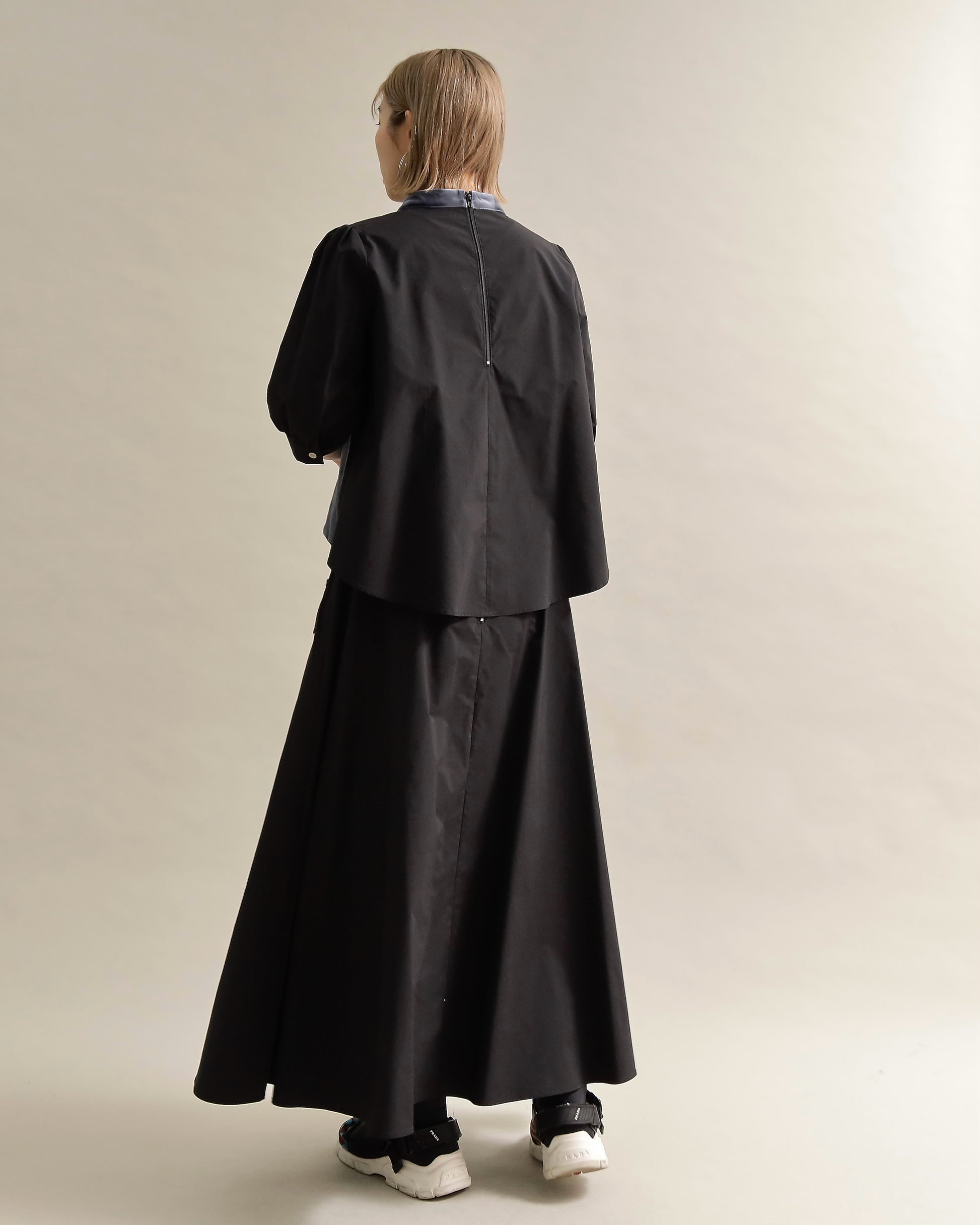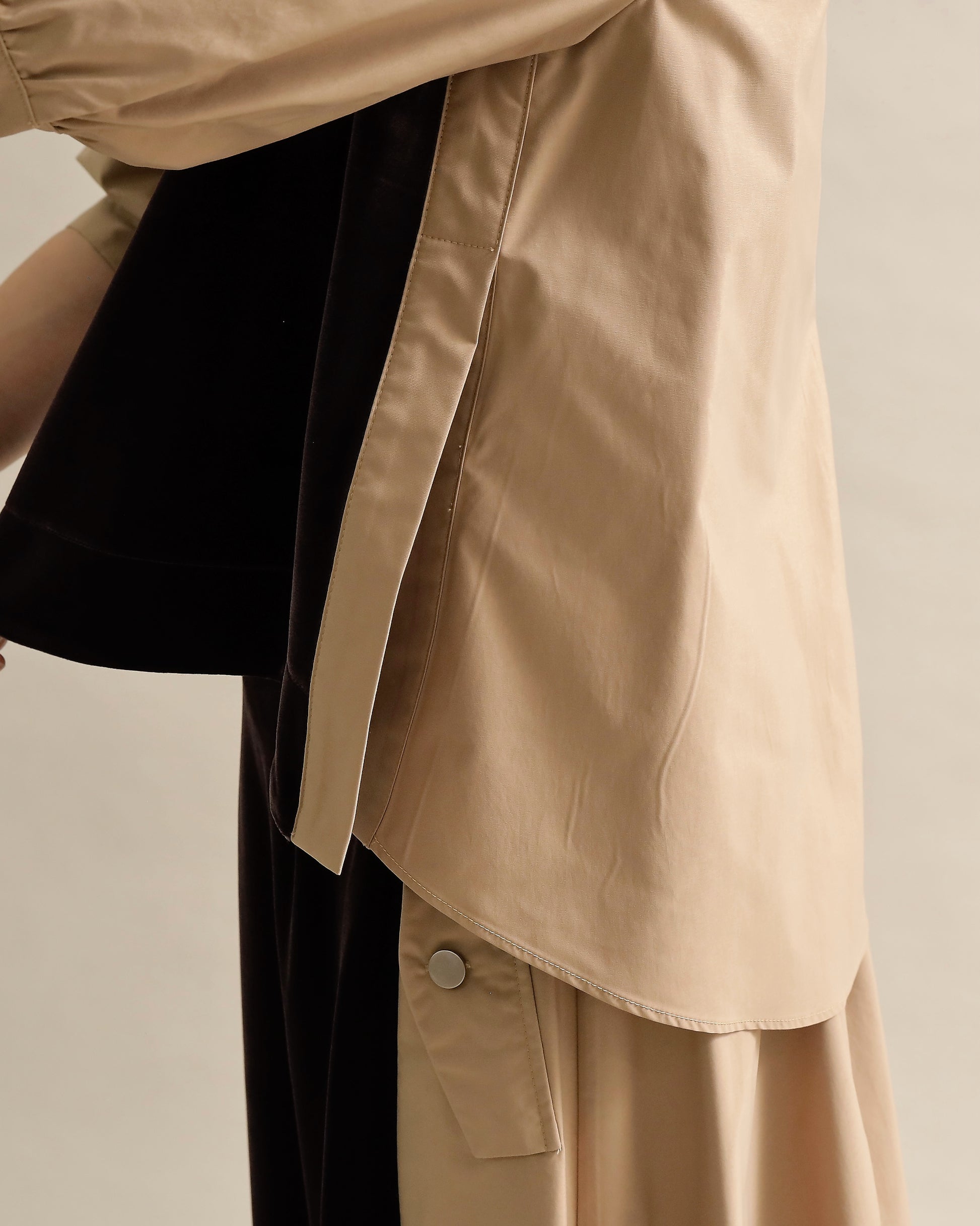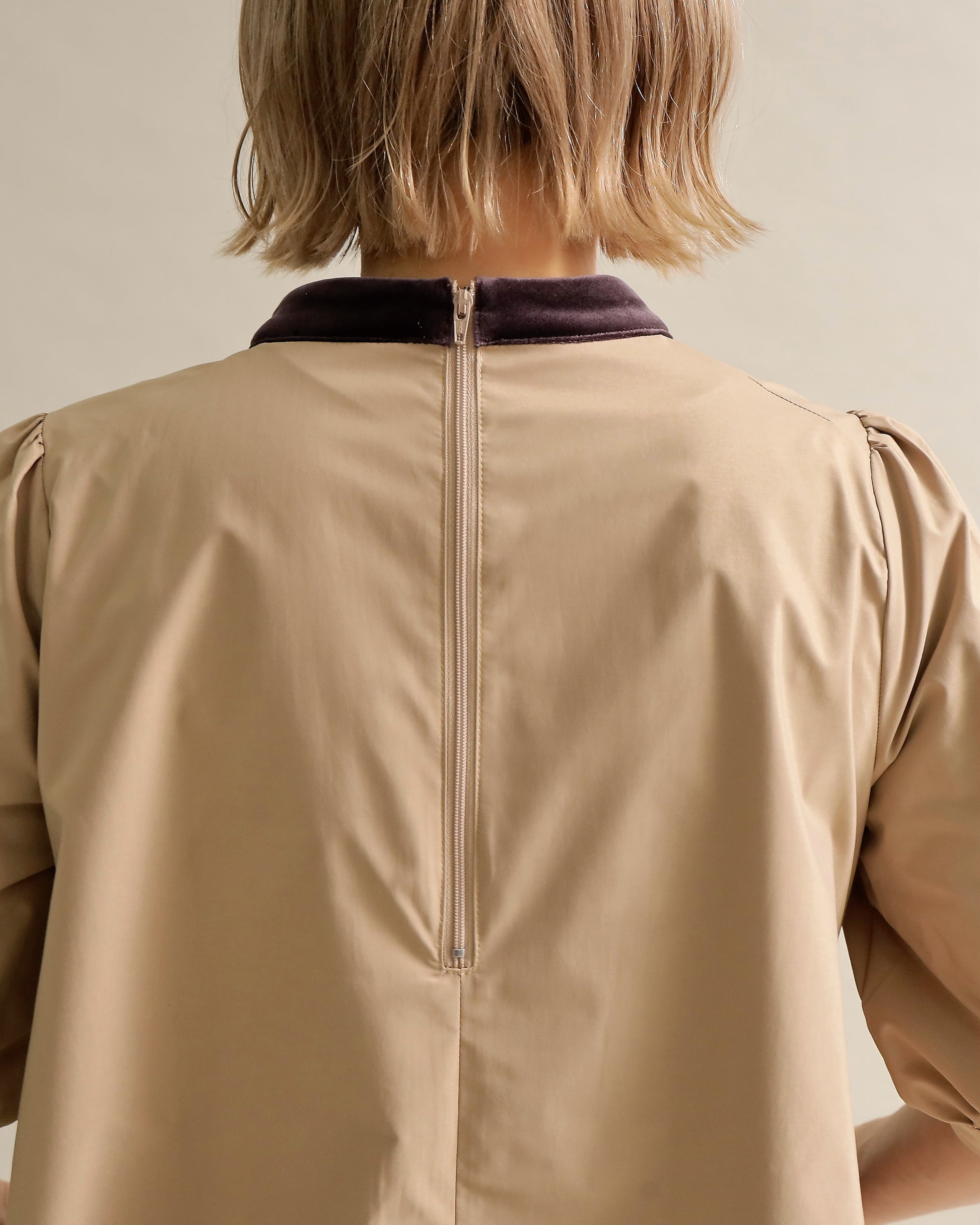 光沢のあるベロアと、ハリのある布帛スリーブを組み合わせた異素材トップス。