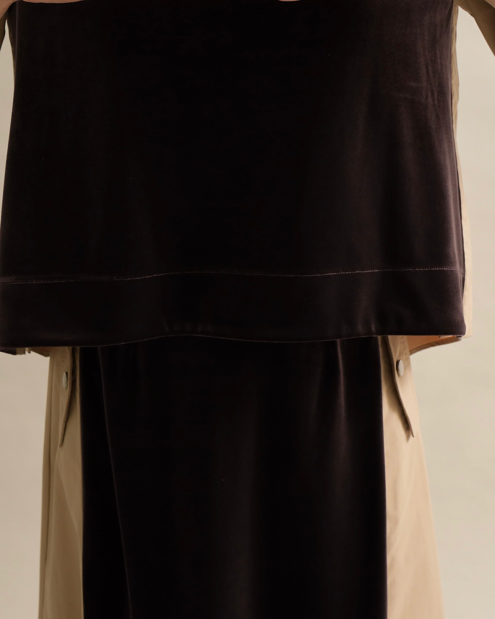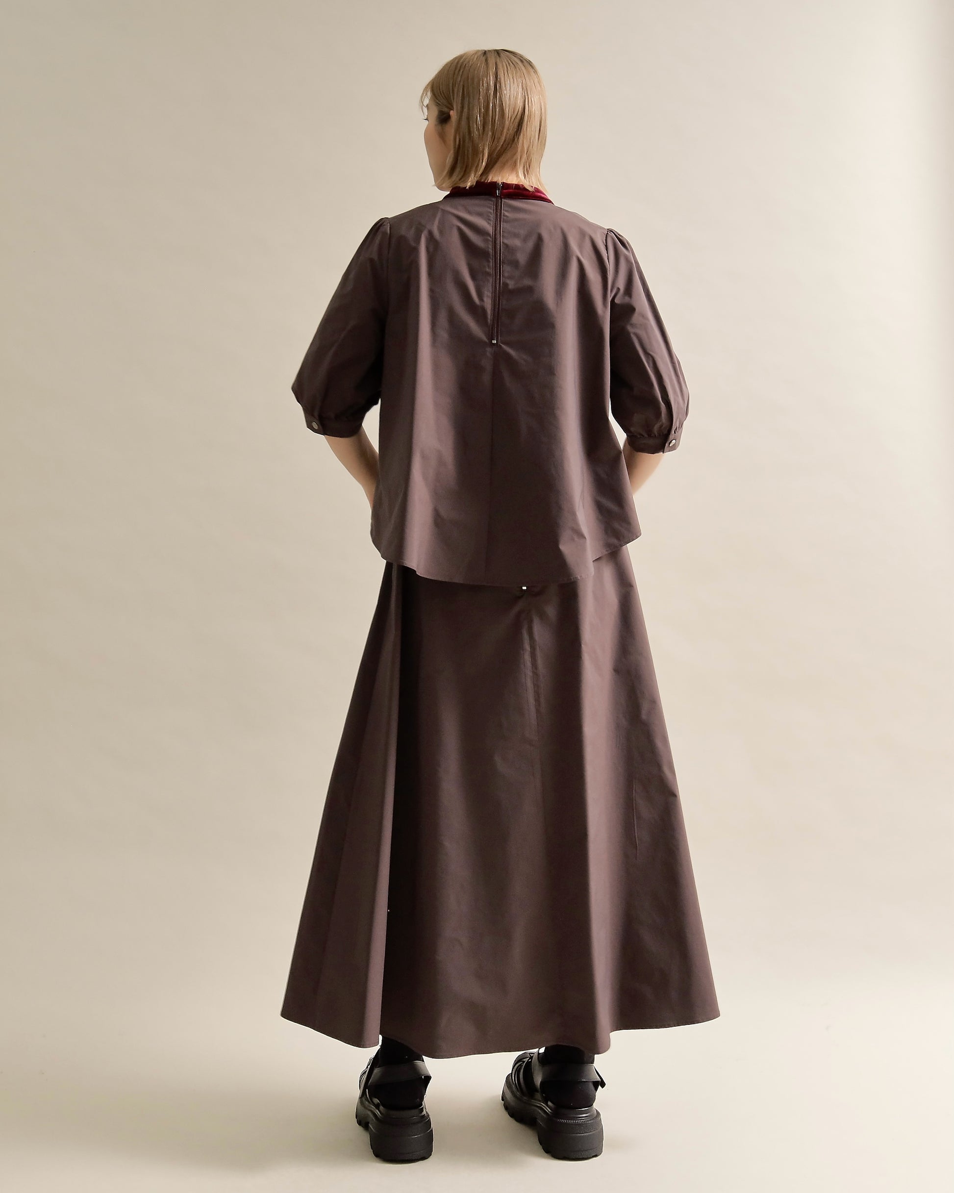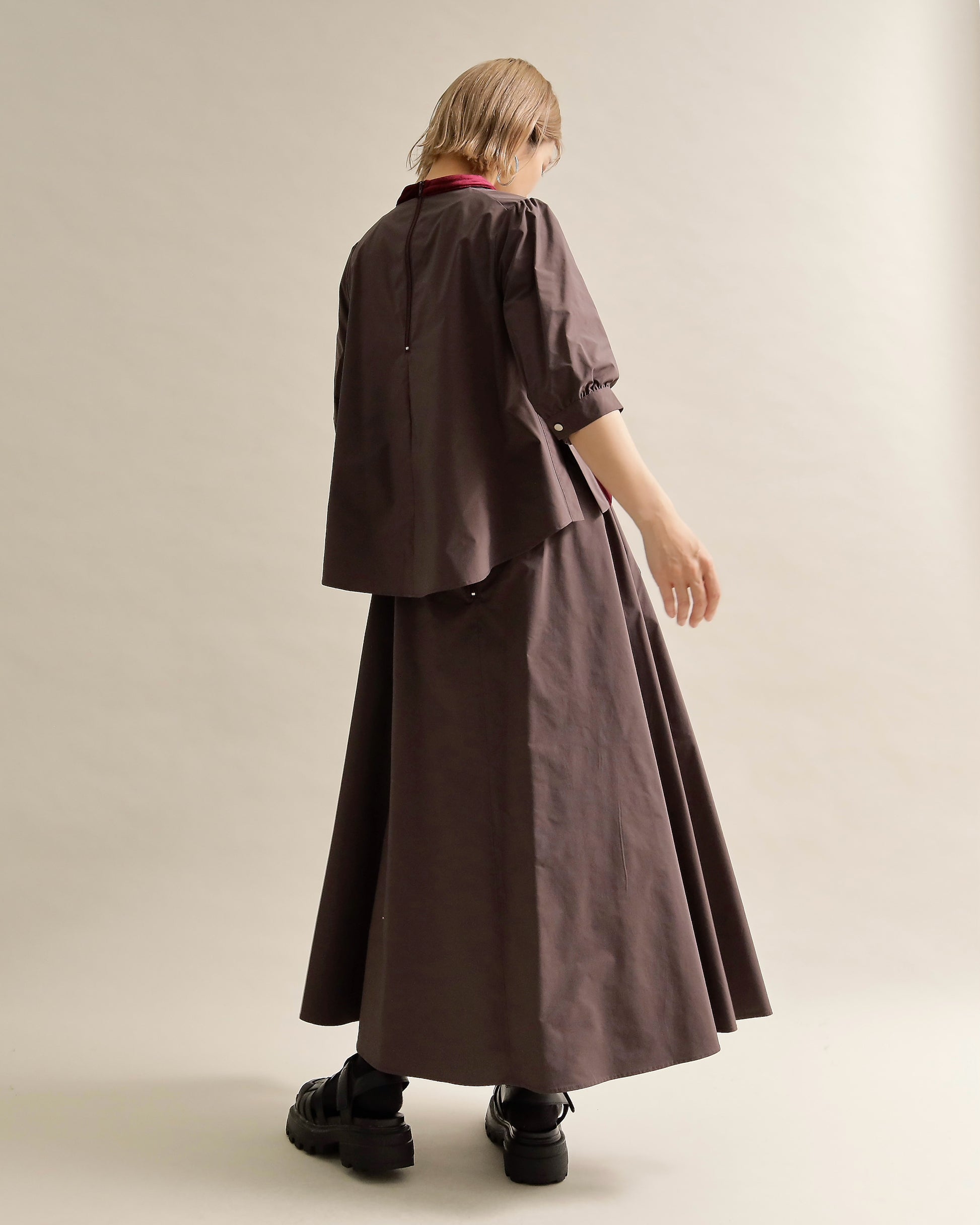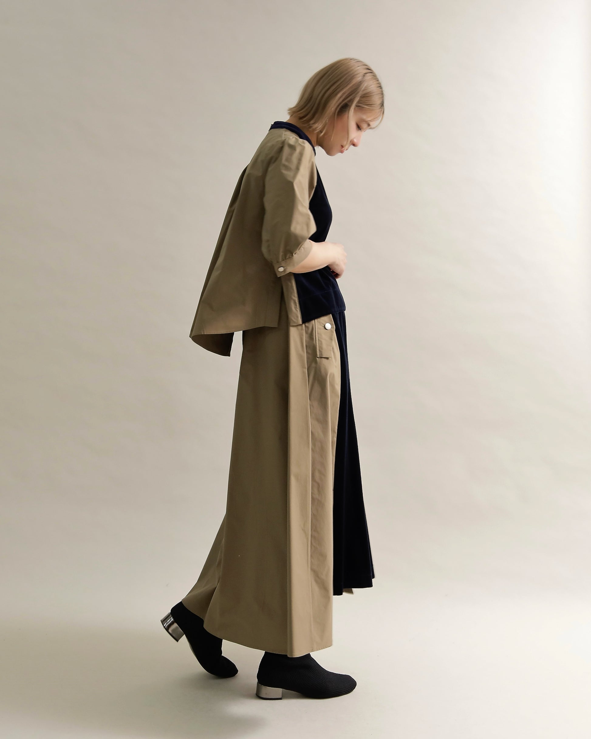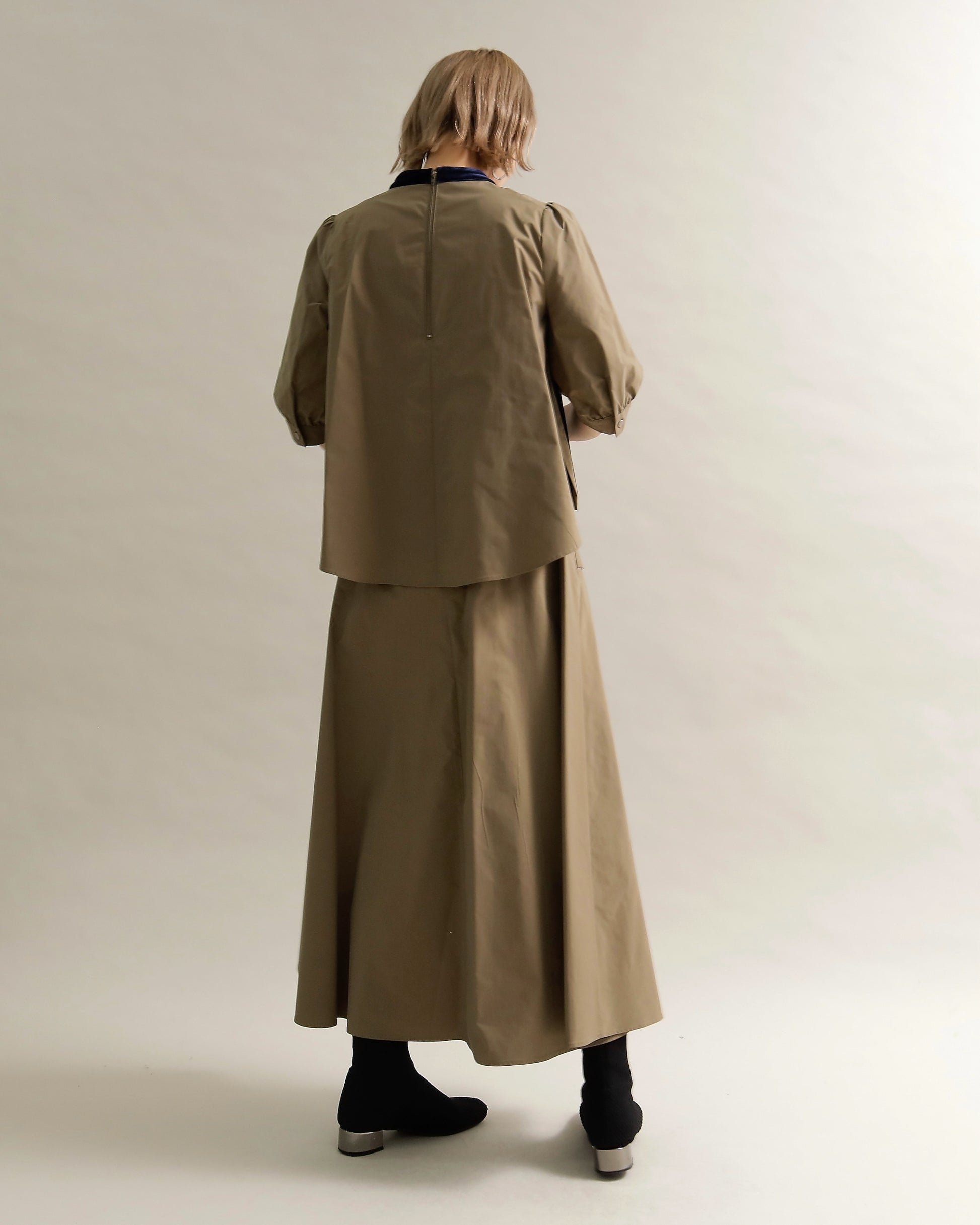 光沢のあるベロアと、ハリのある布帛スリーブを組み合わせた異素材トップス。
