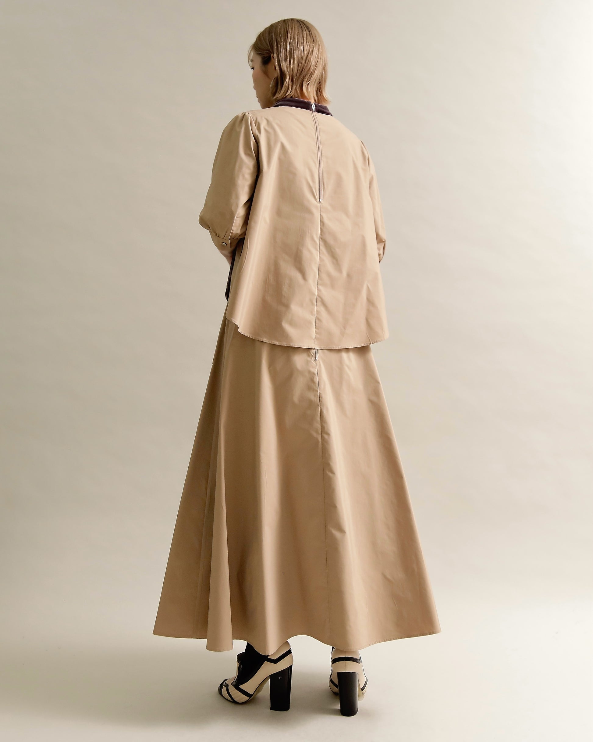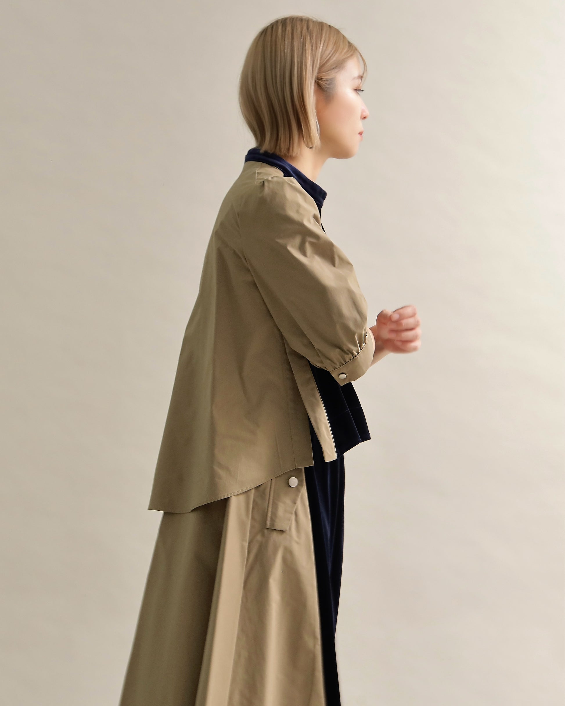 程よい立ち上がりのモックネックが、首元をすっきりと上品に見せてくれます。