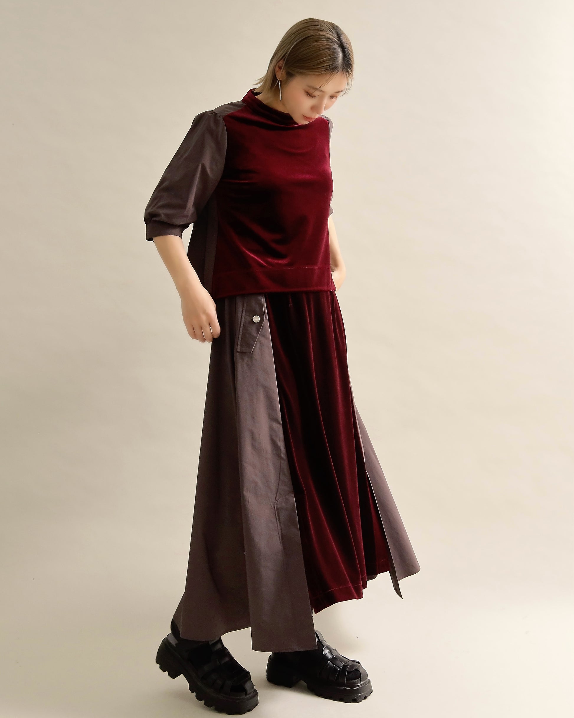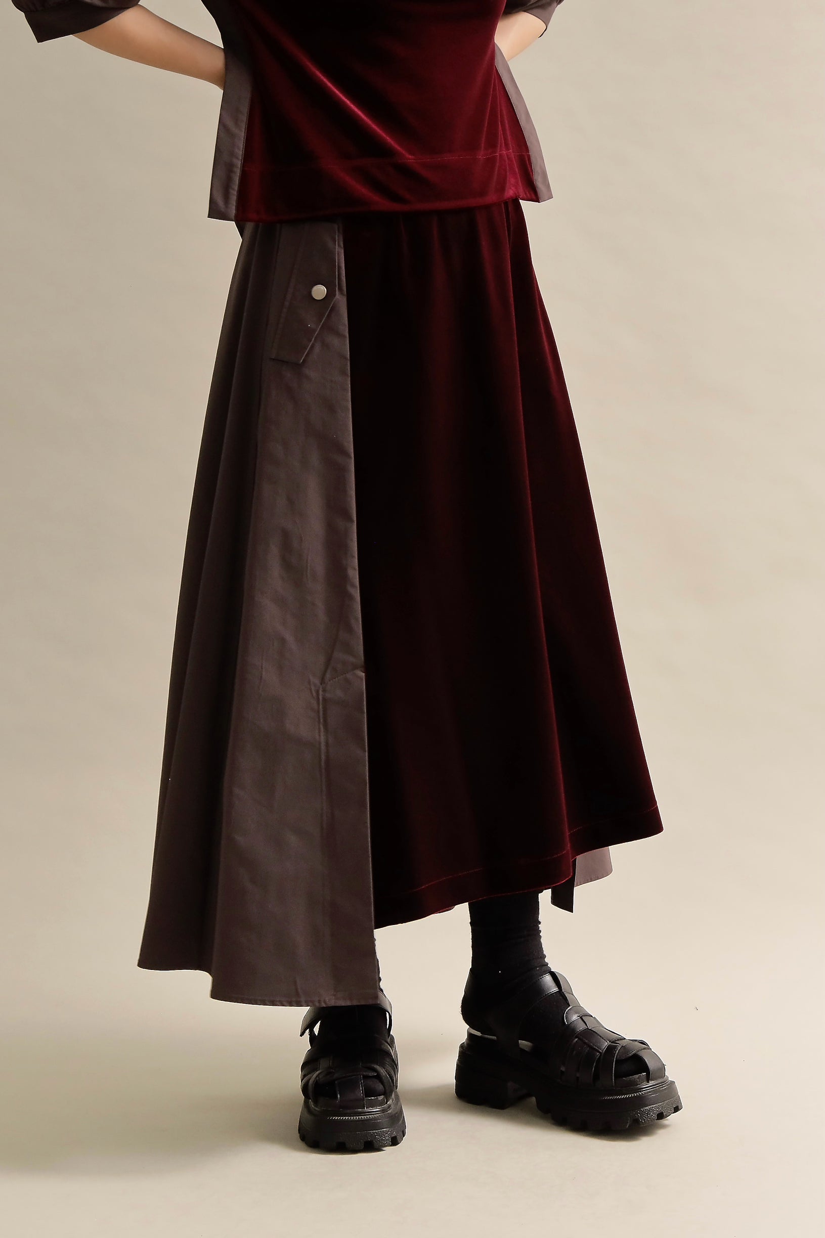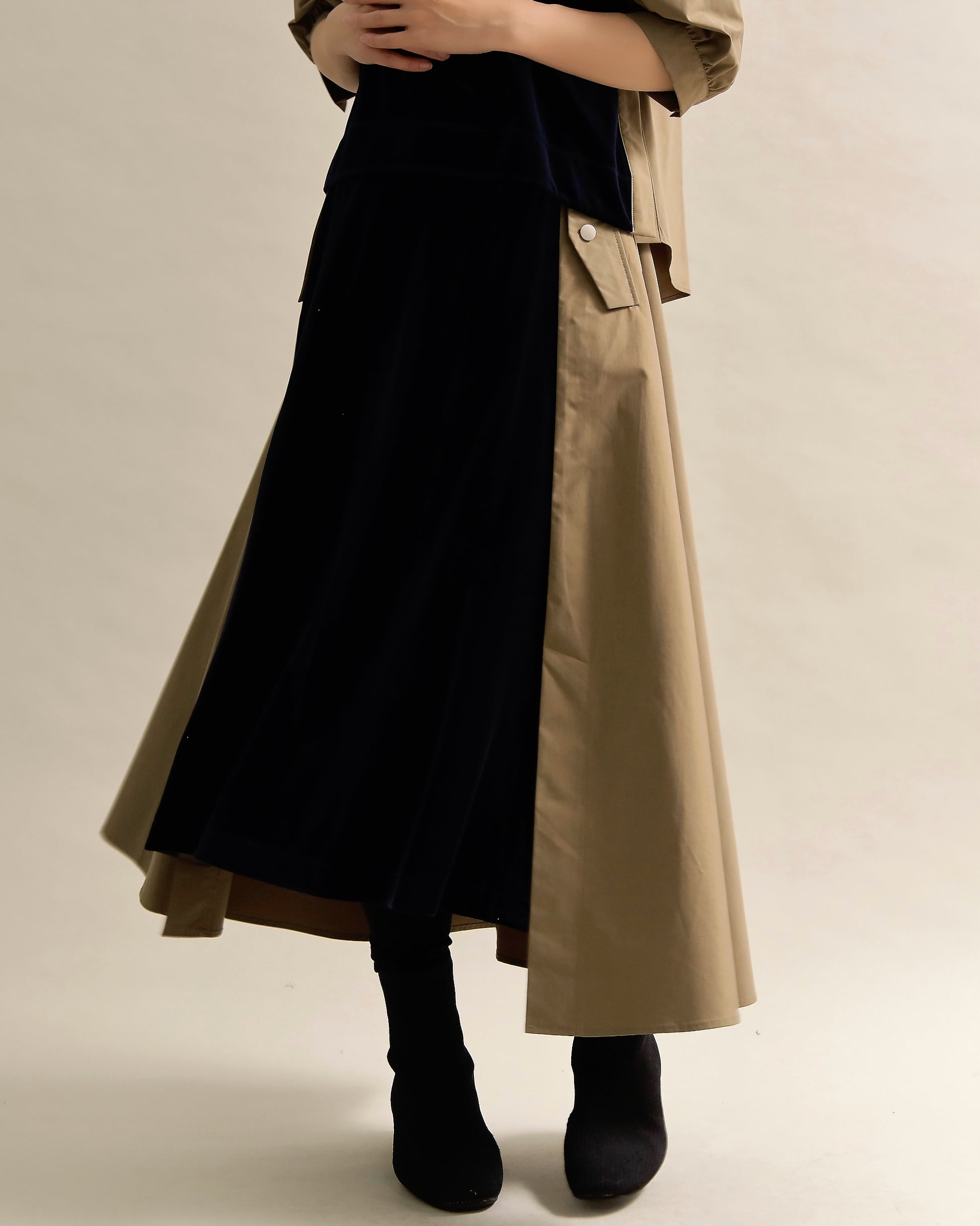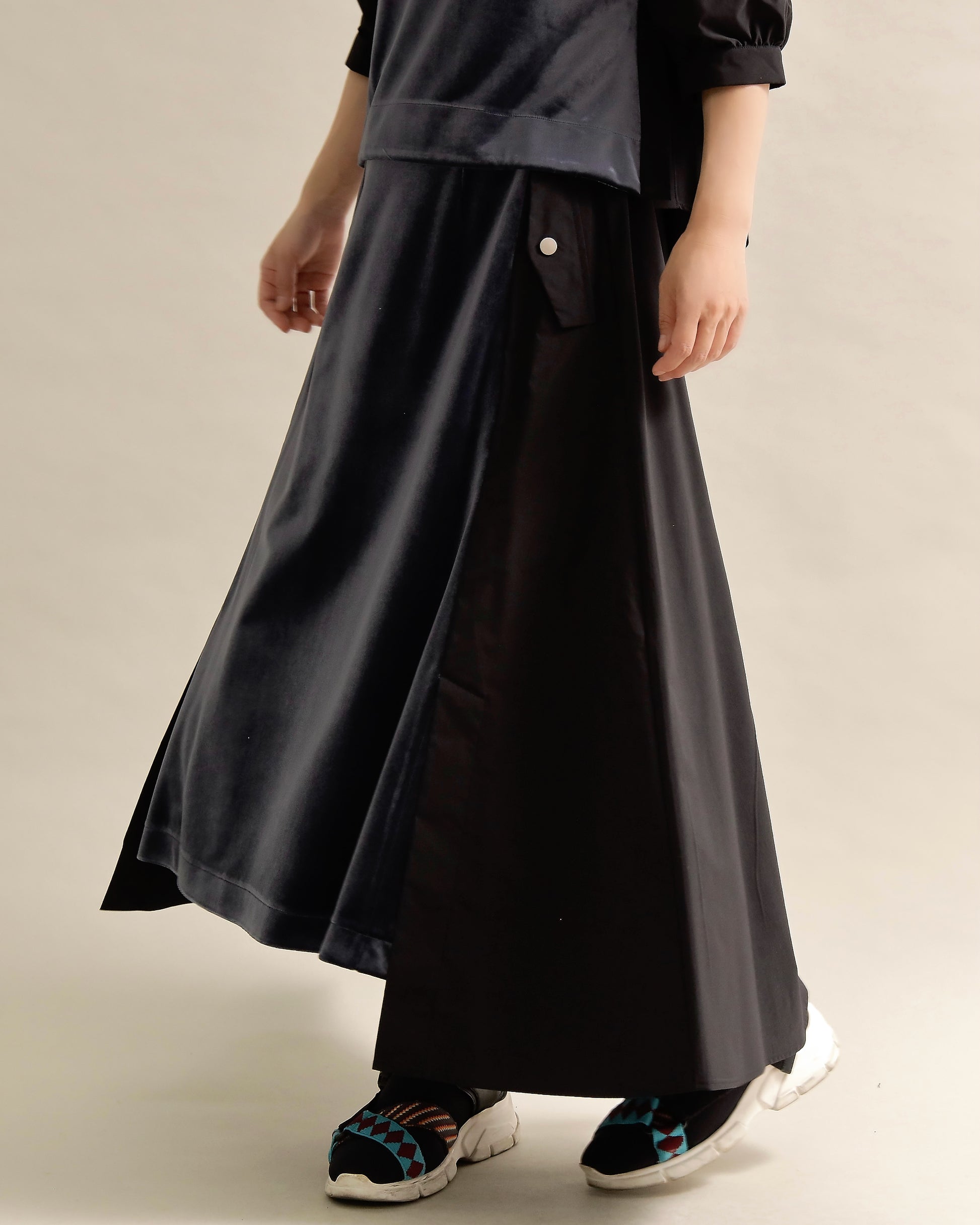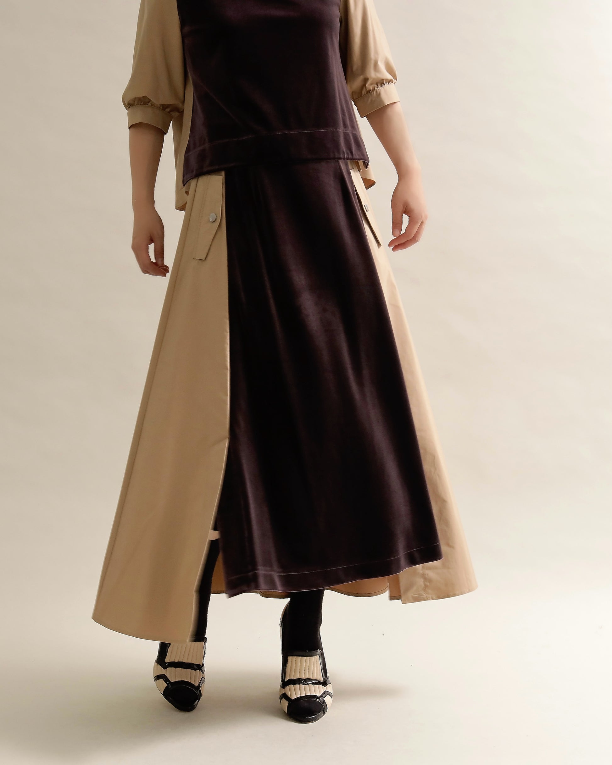 ベロアの深い艶と、ハリのある布帛素材を組み合わせた異素材スカート。