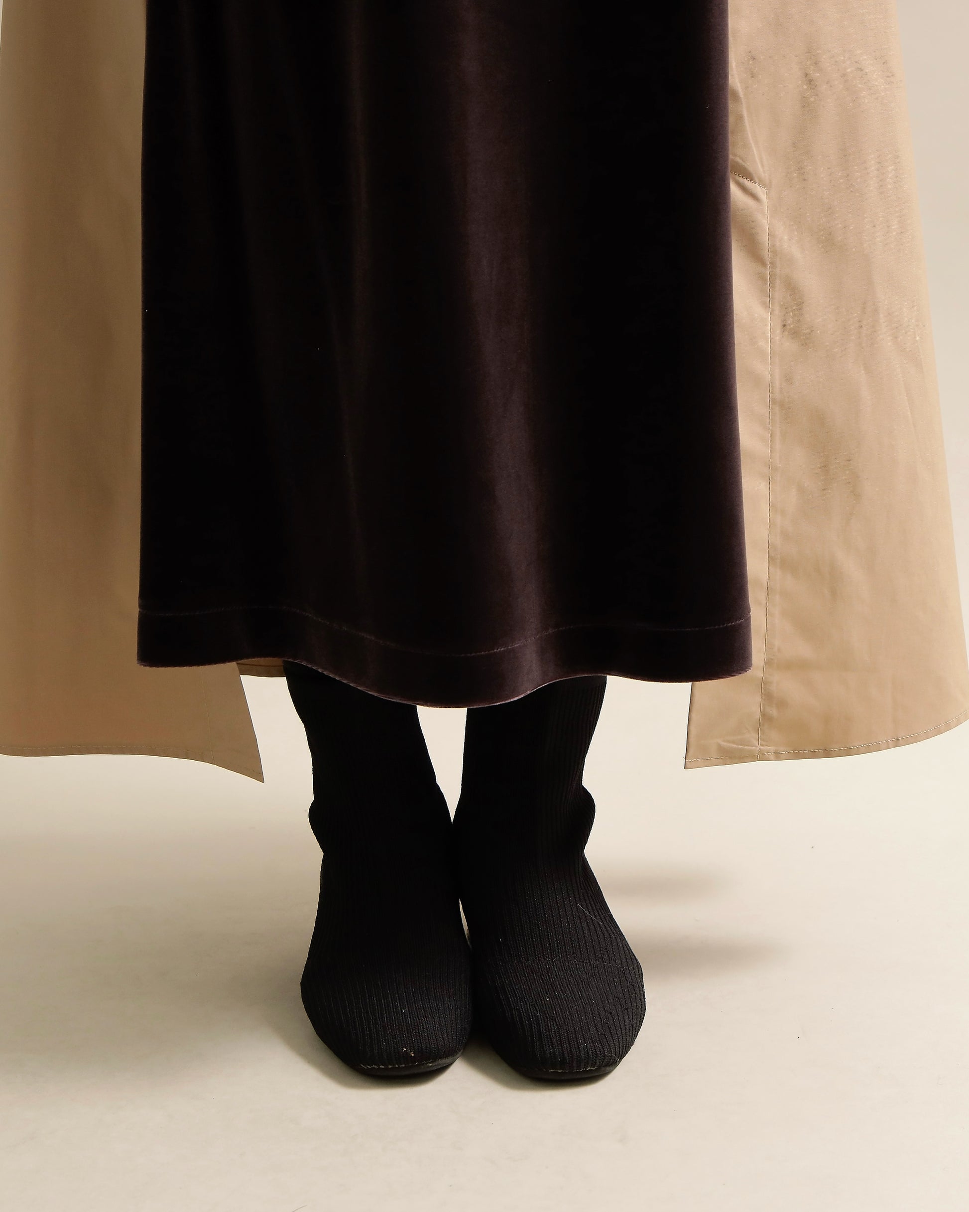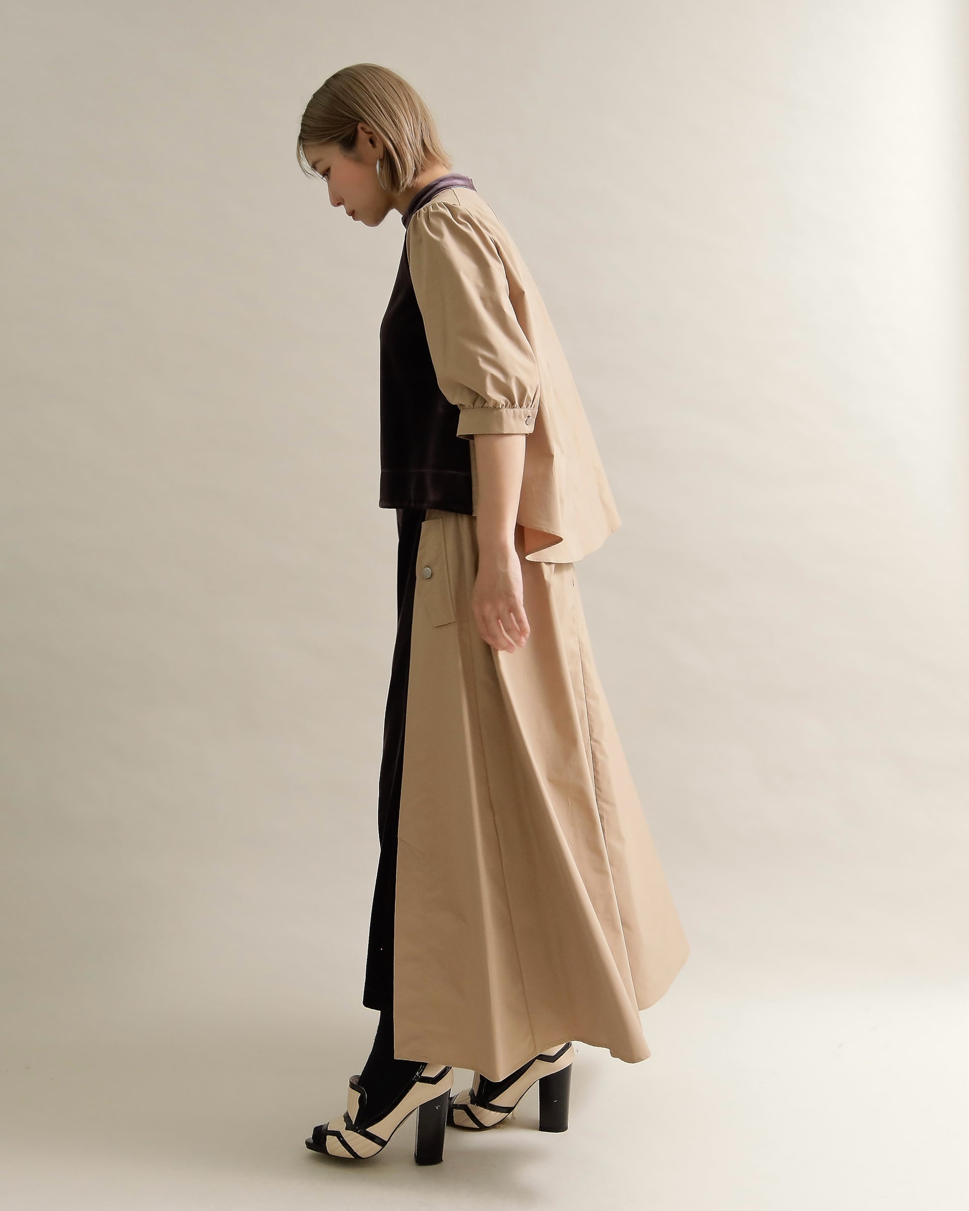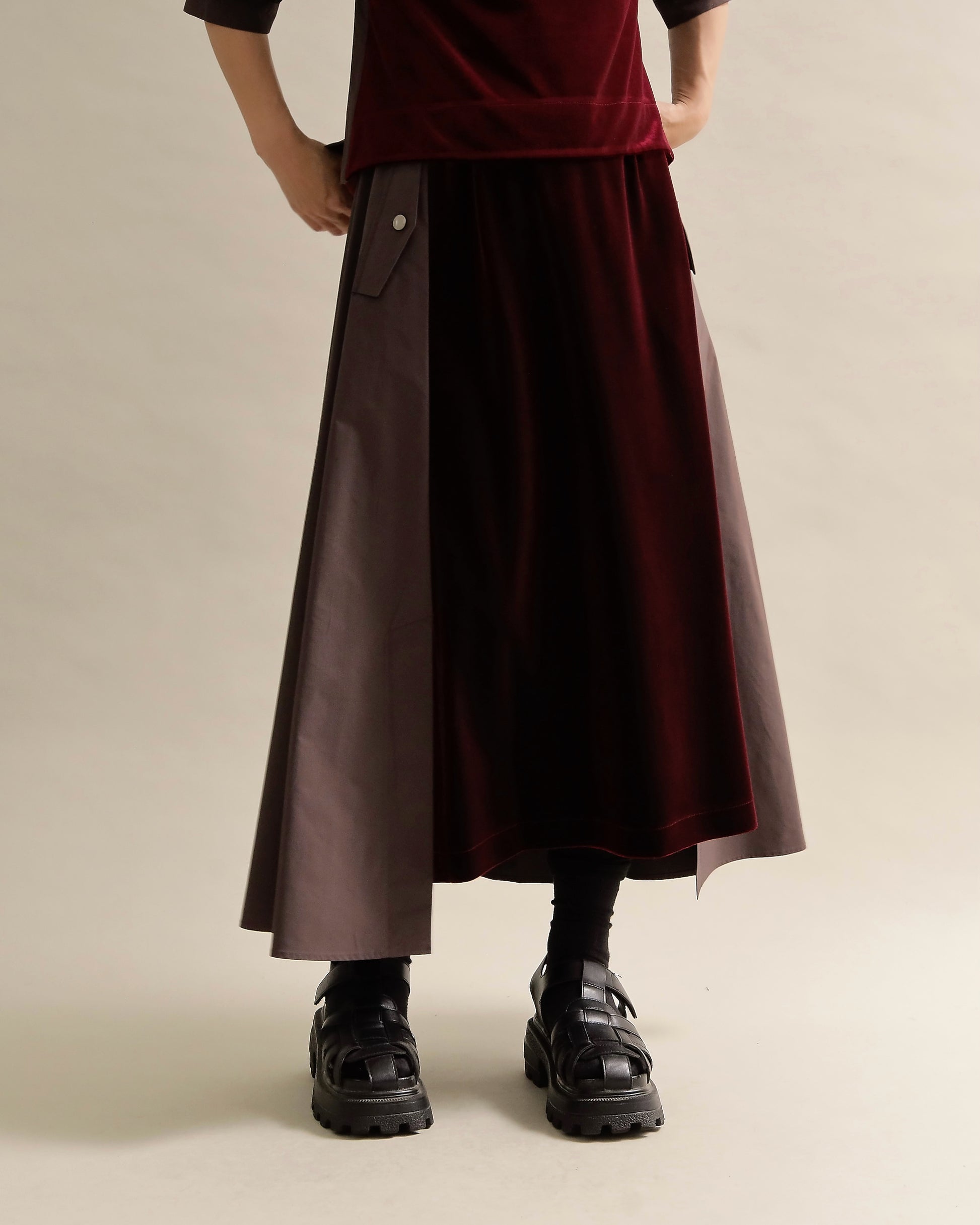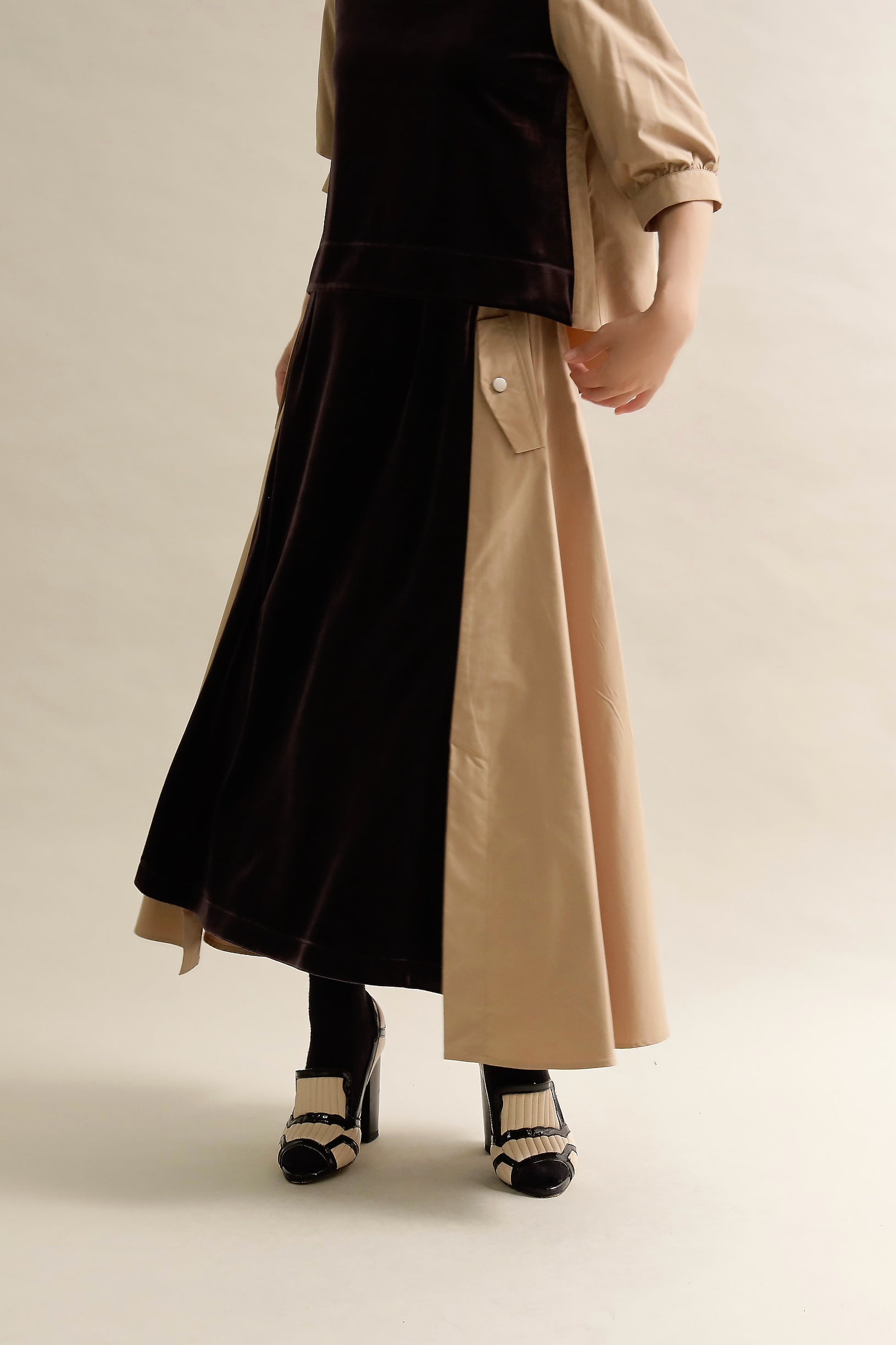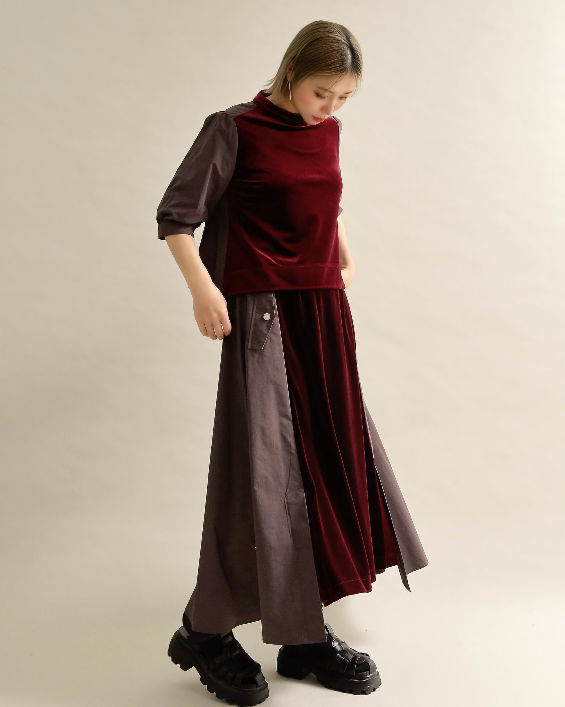 ベロアの深い艶と、ハリのある布帛素材を組み合わせた異素材スカート。