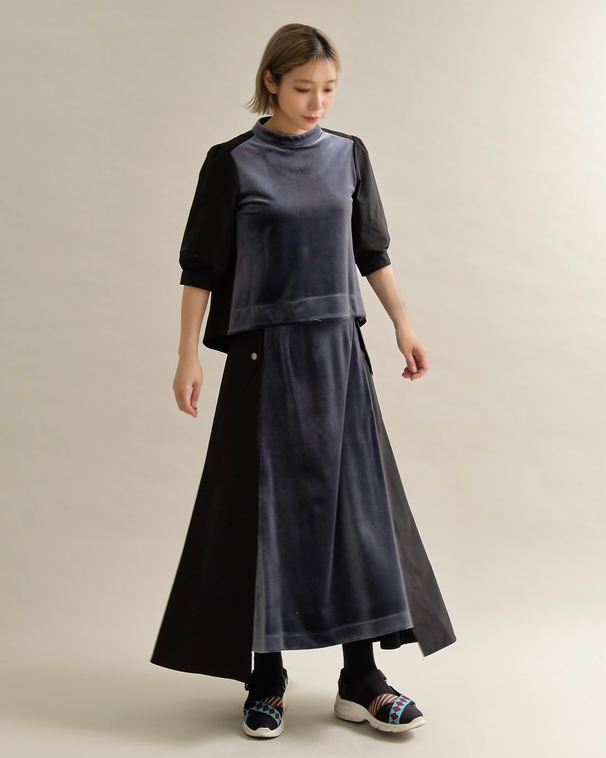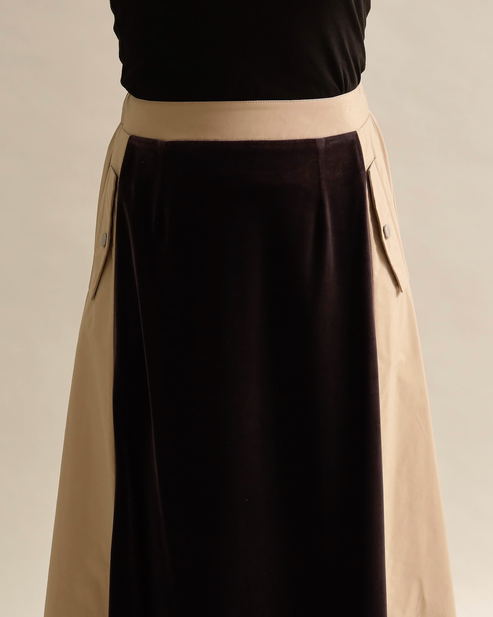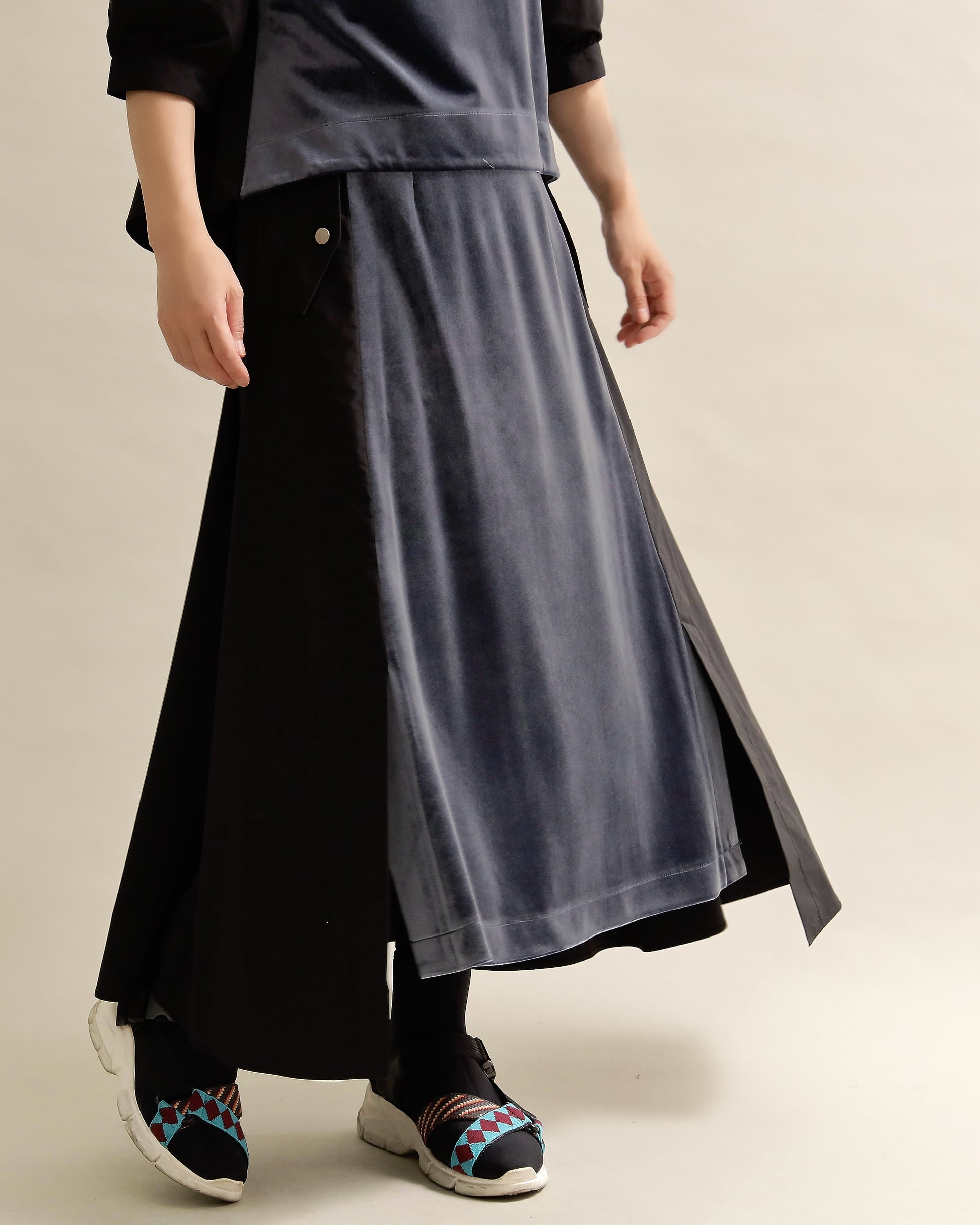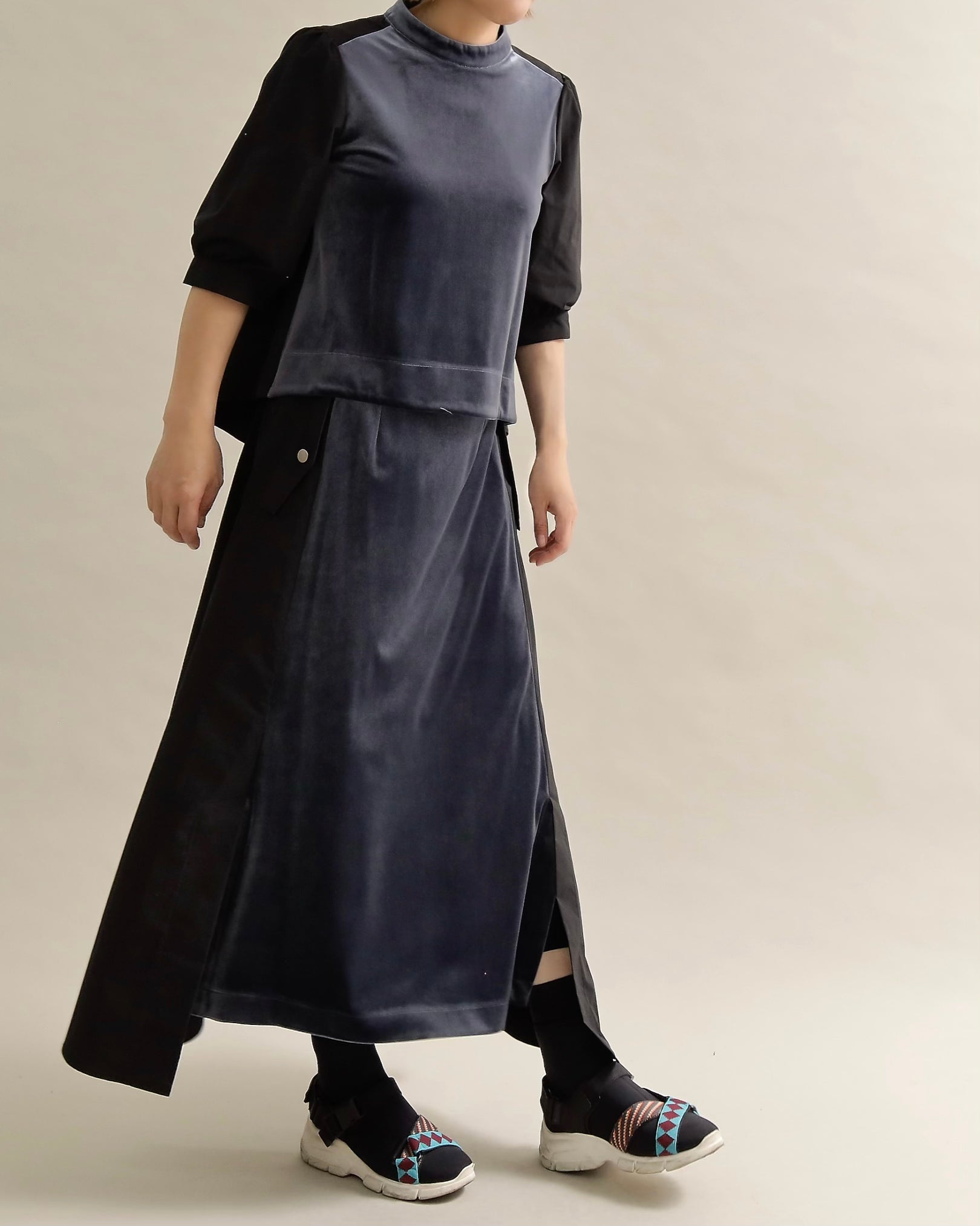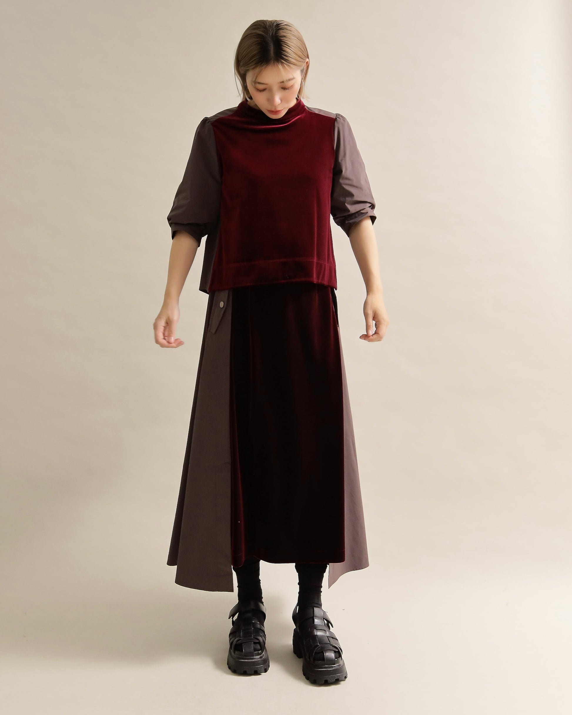 ベロアの深い艶と、ハリのある布帛素材を組み合わせた異素材スカート。