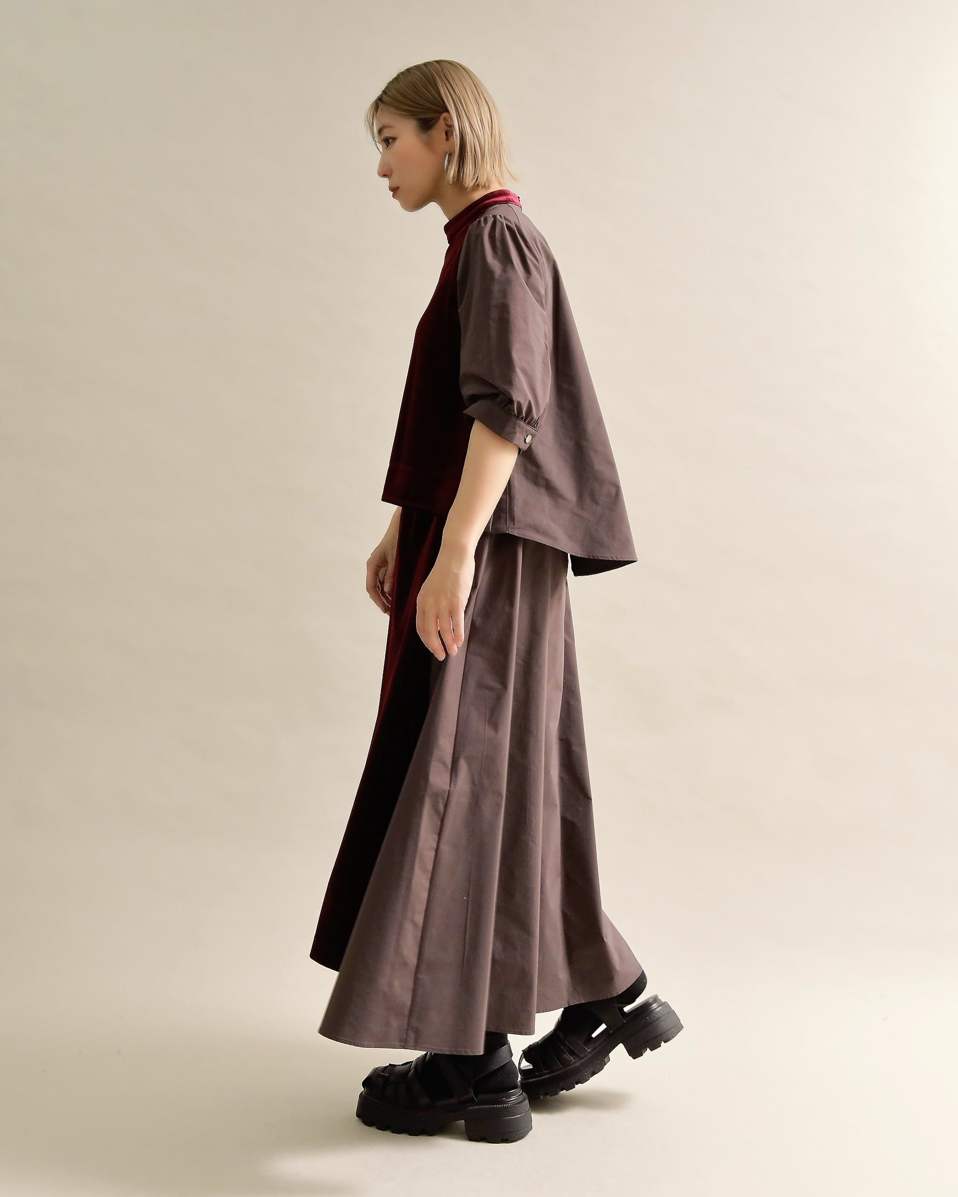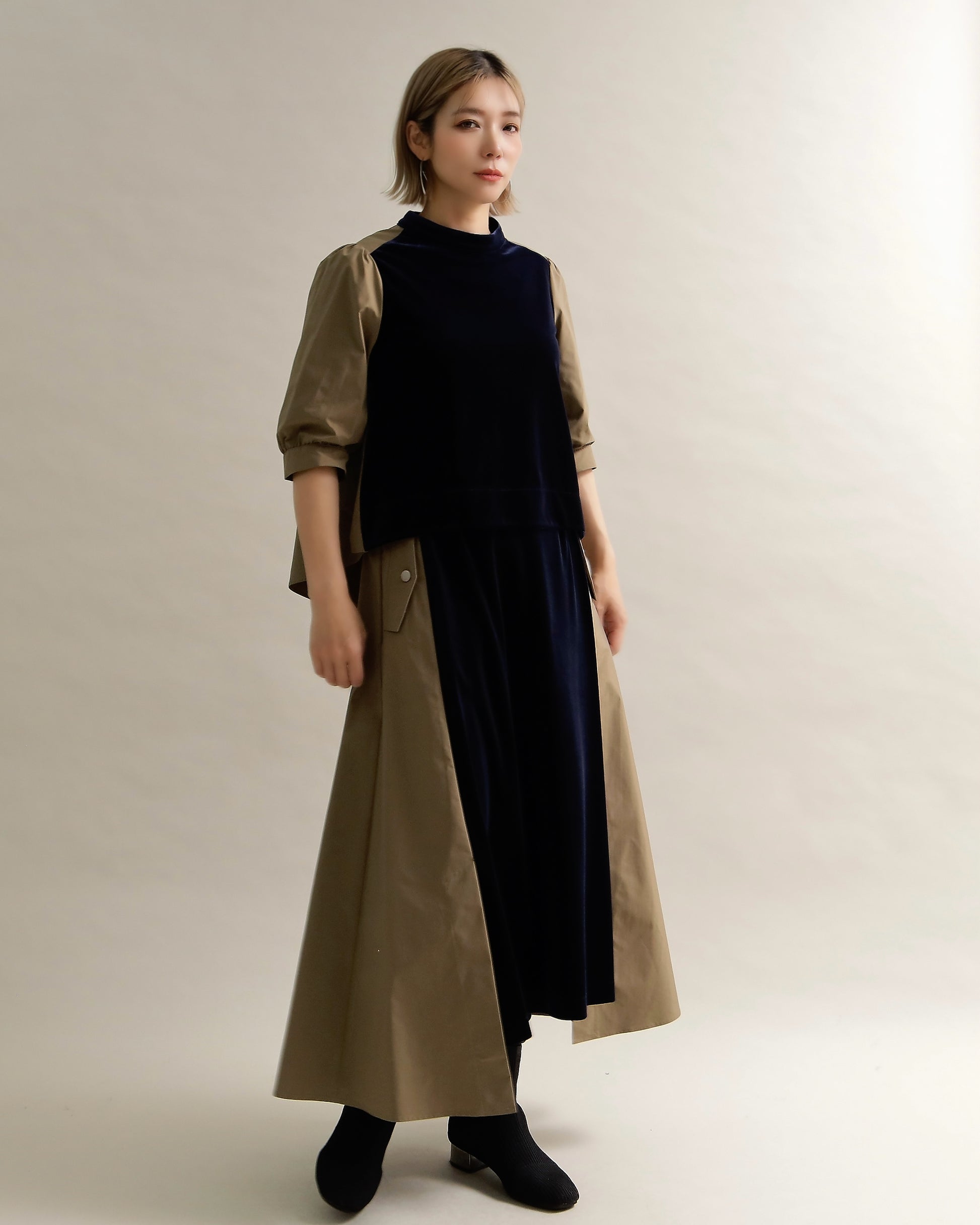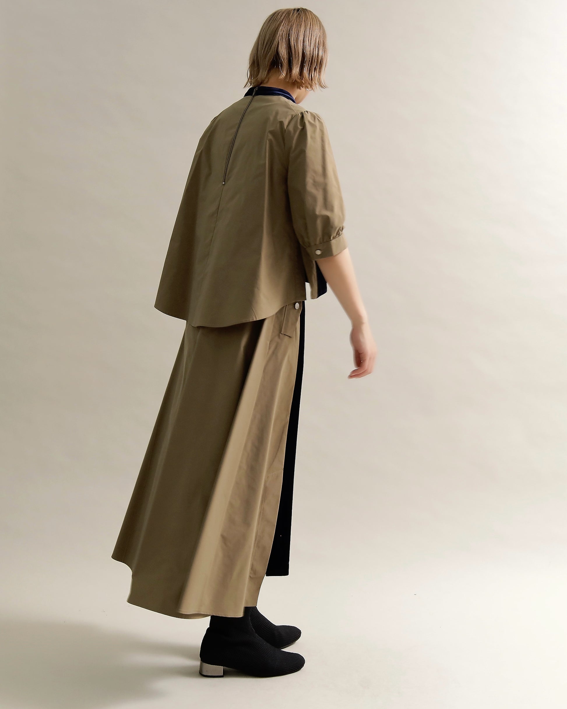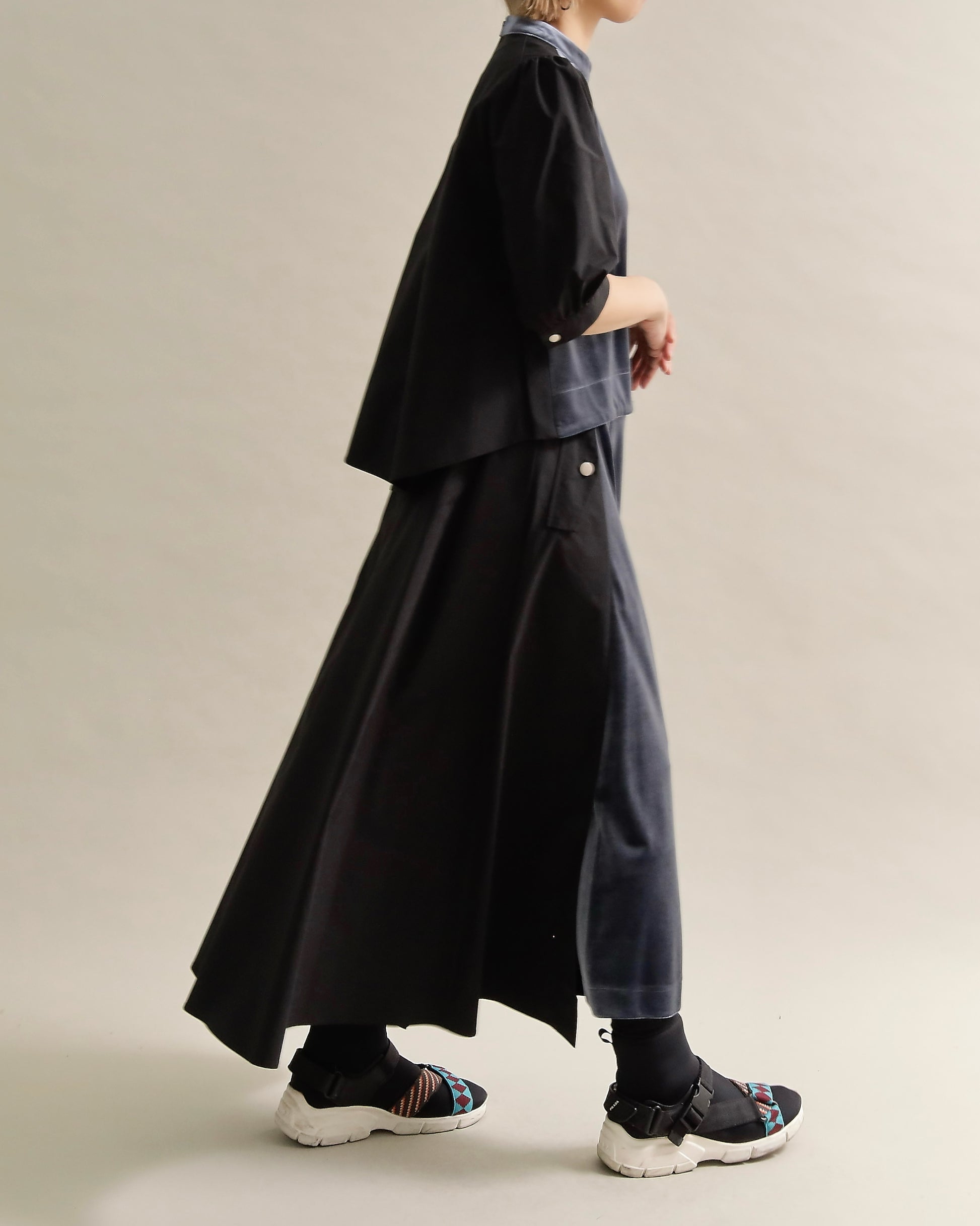 ベロアの深い艶と、ハリのある布帛素材を組み合わせた異素材スカート。