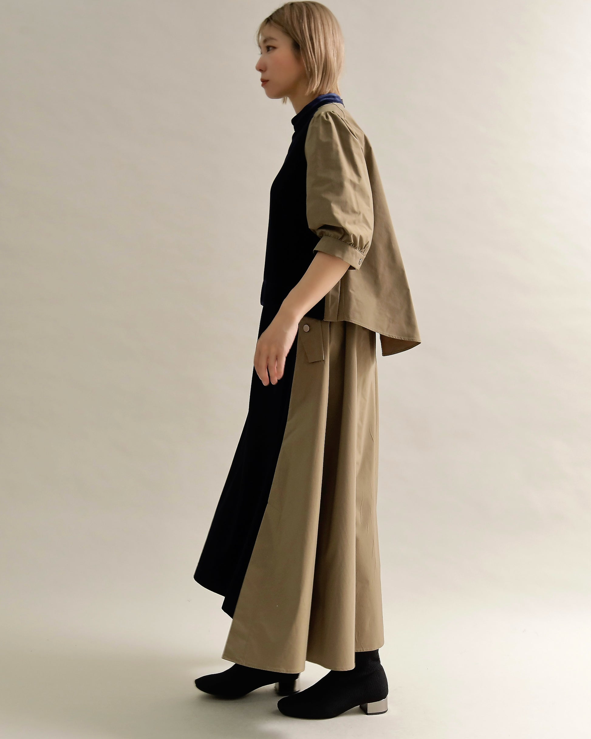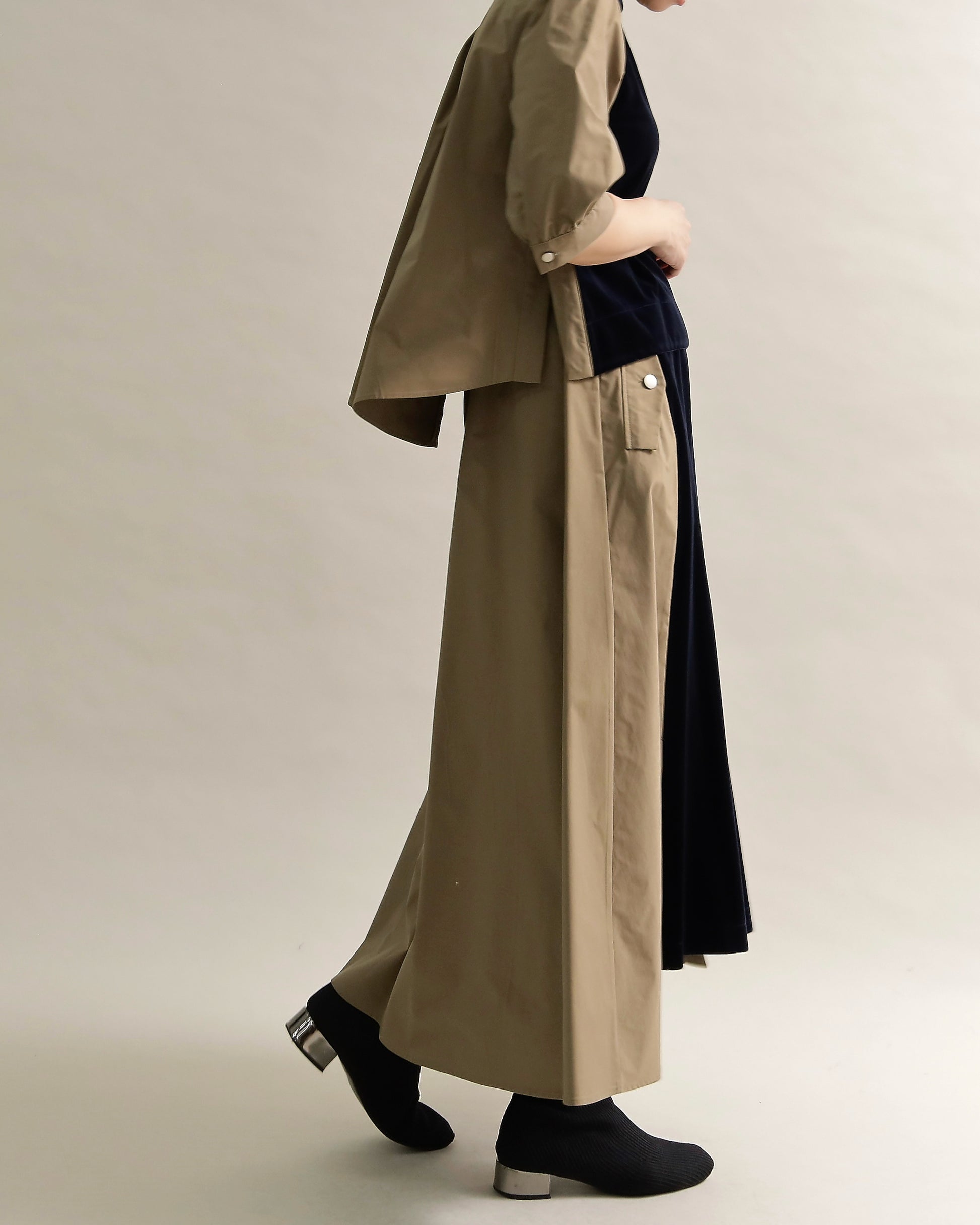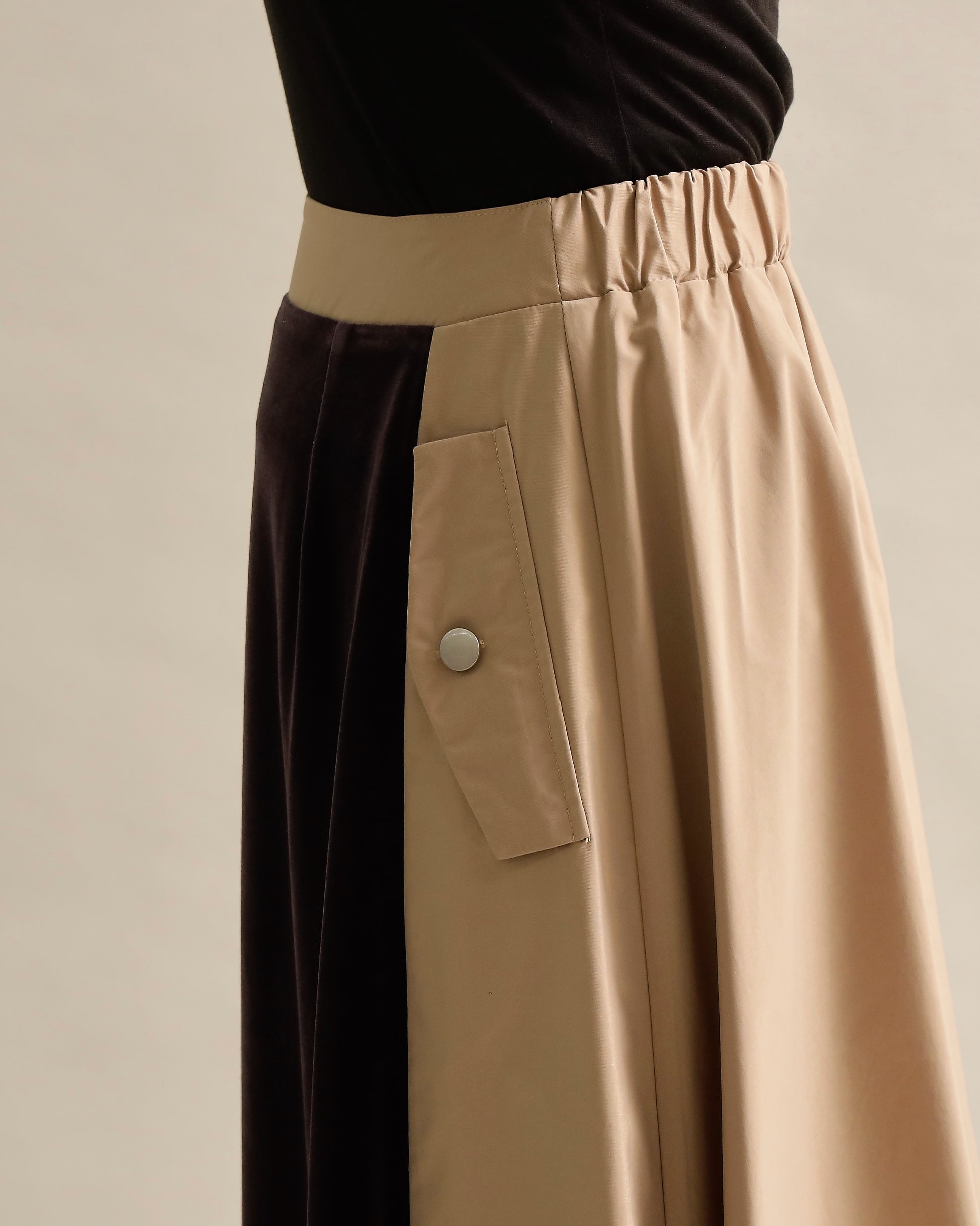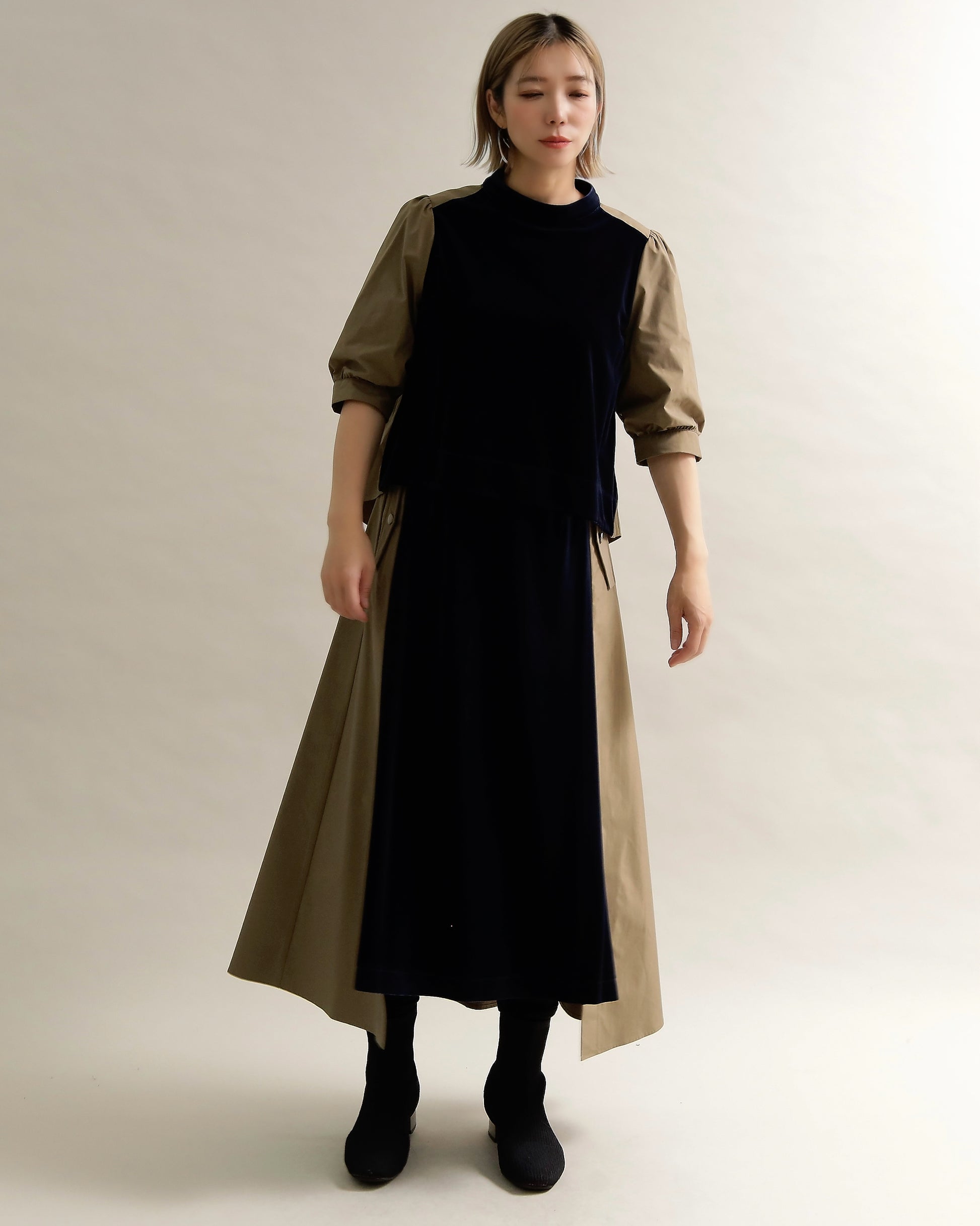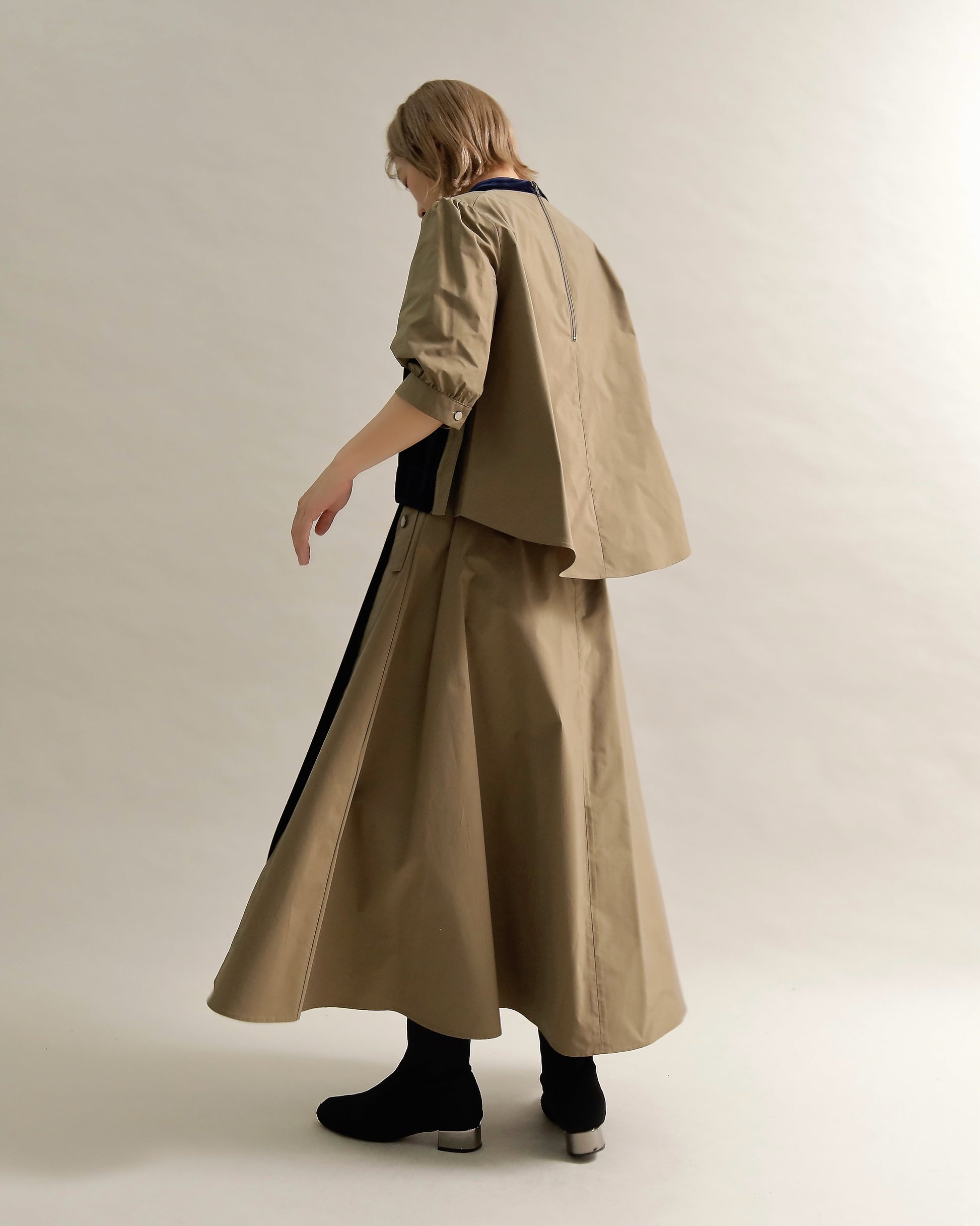 ベロアの深い艶と、ハリのある布帛素材を組み合わせた異素材スカート。