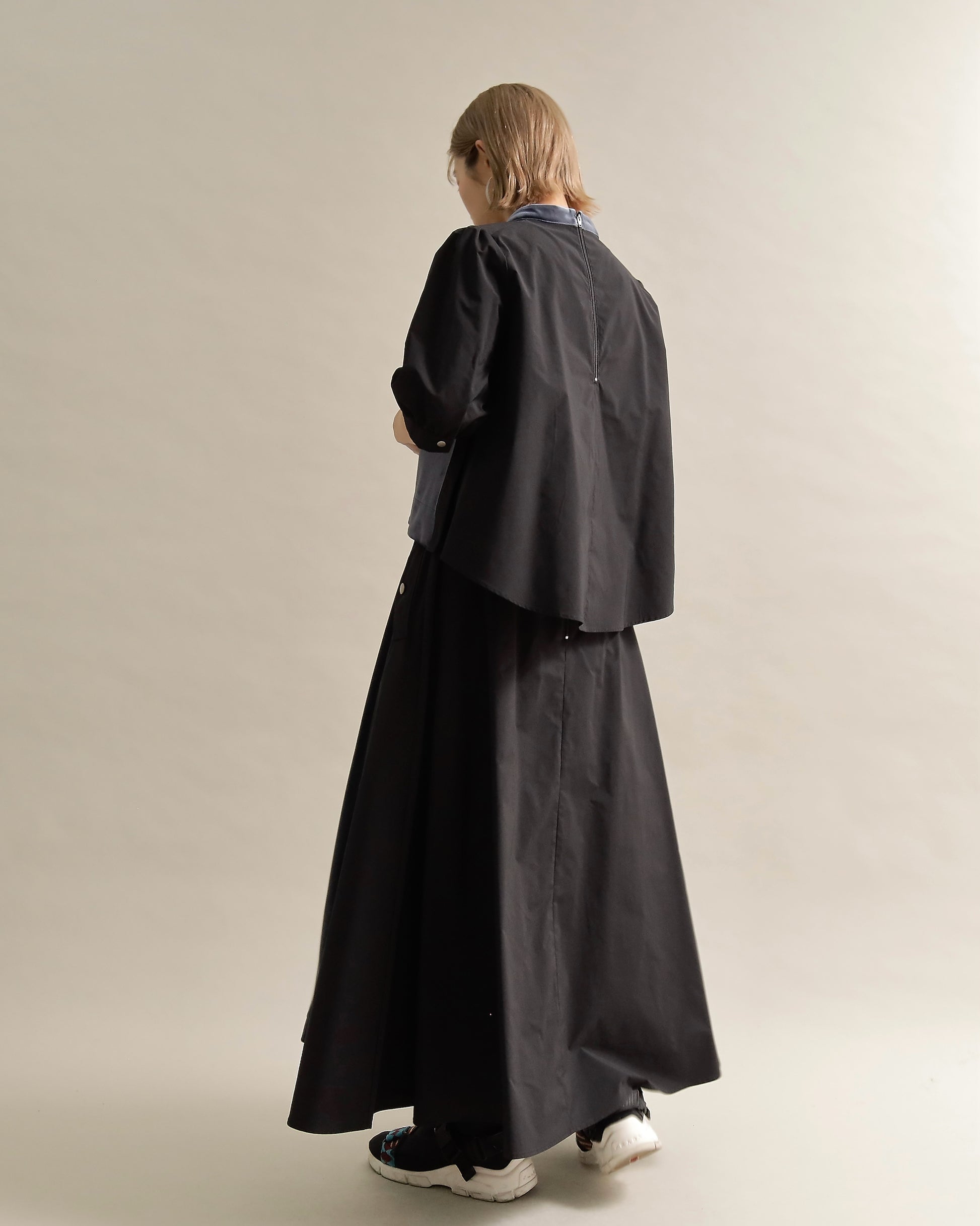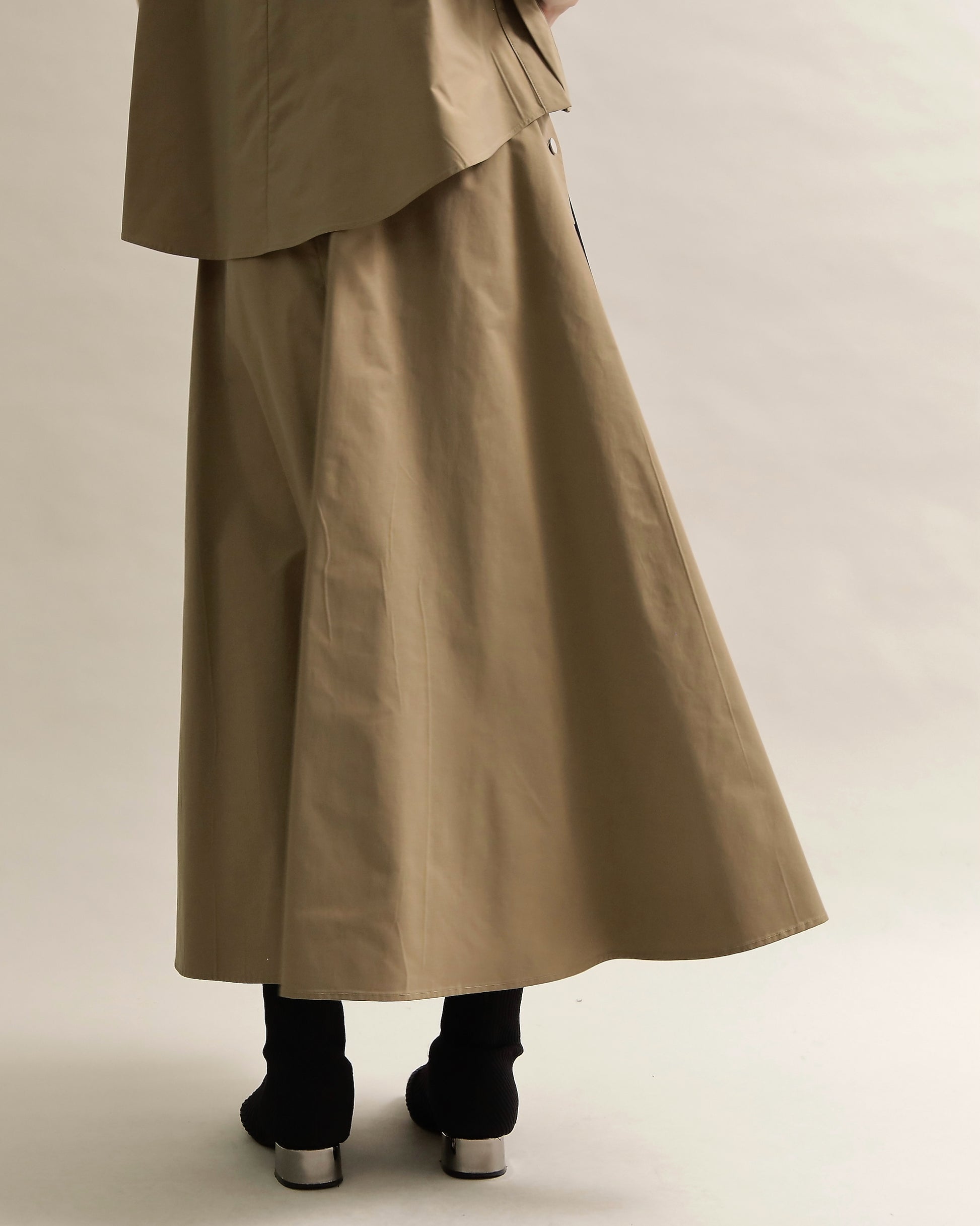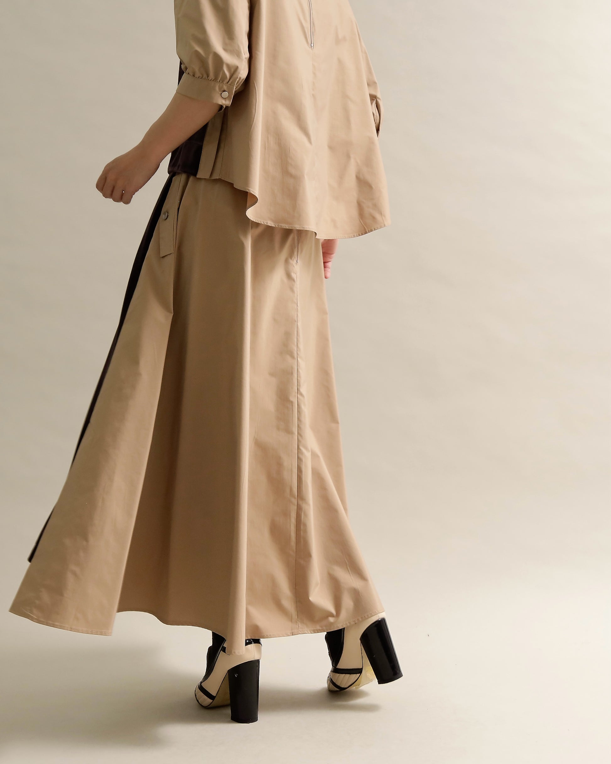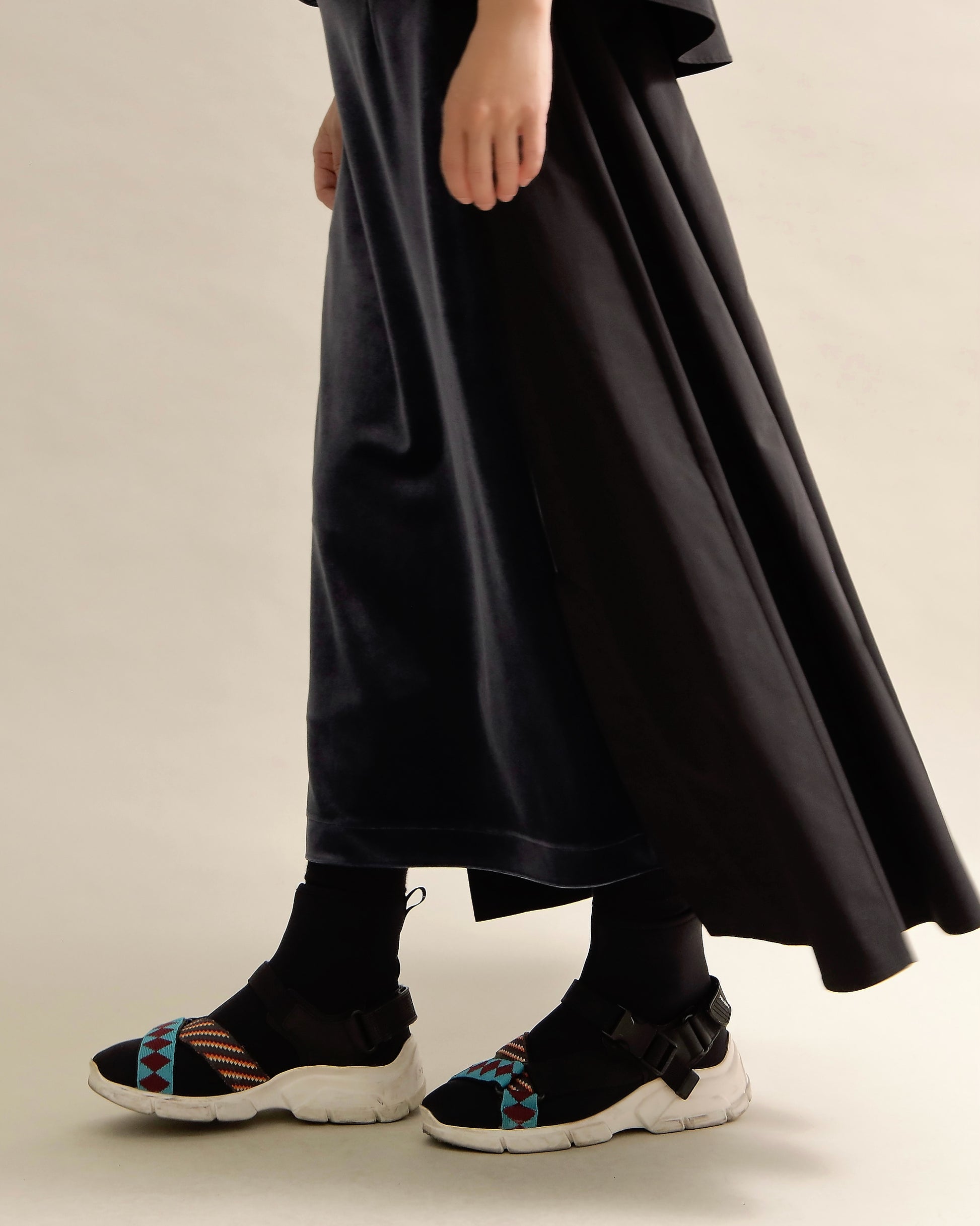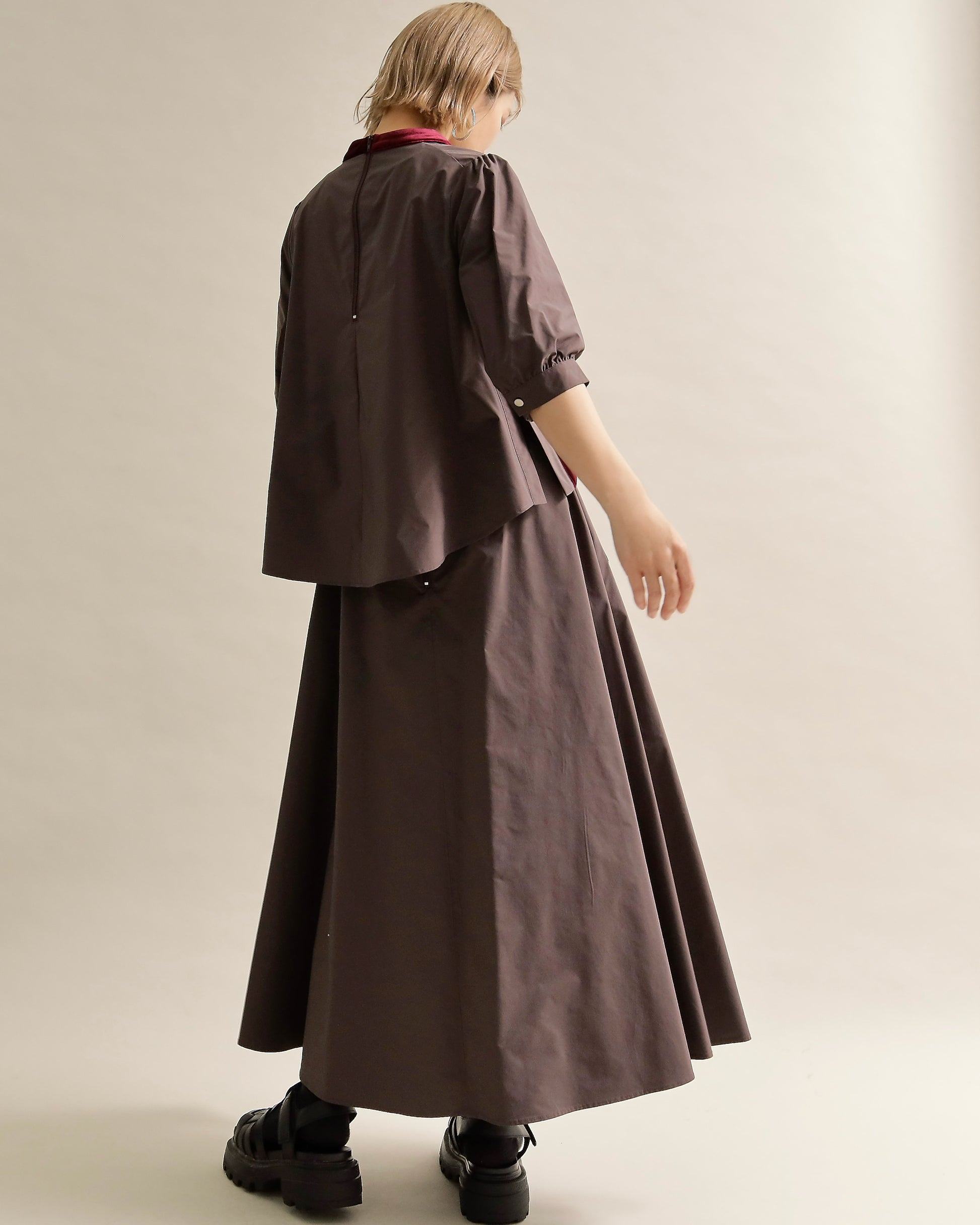 ベロアの深い艶と、ハリのある布帛素材を組み合わせた異素材スカート。