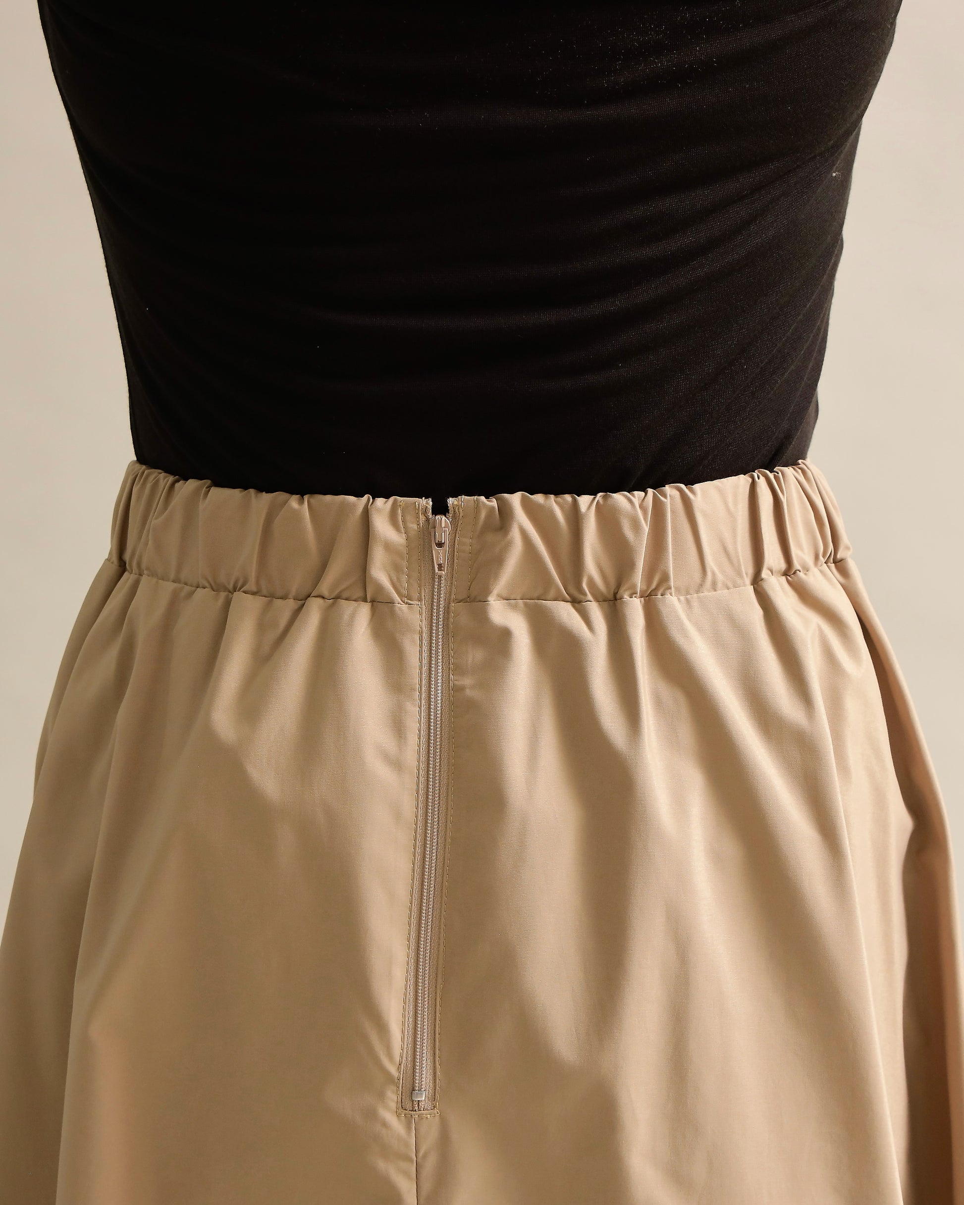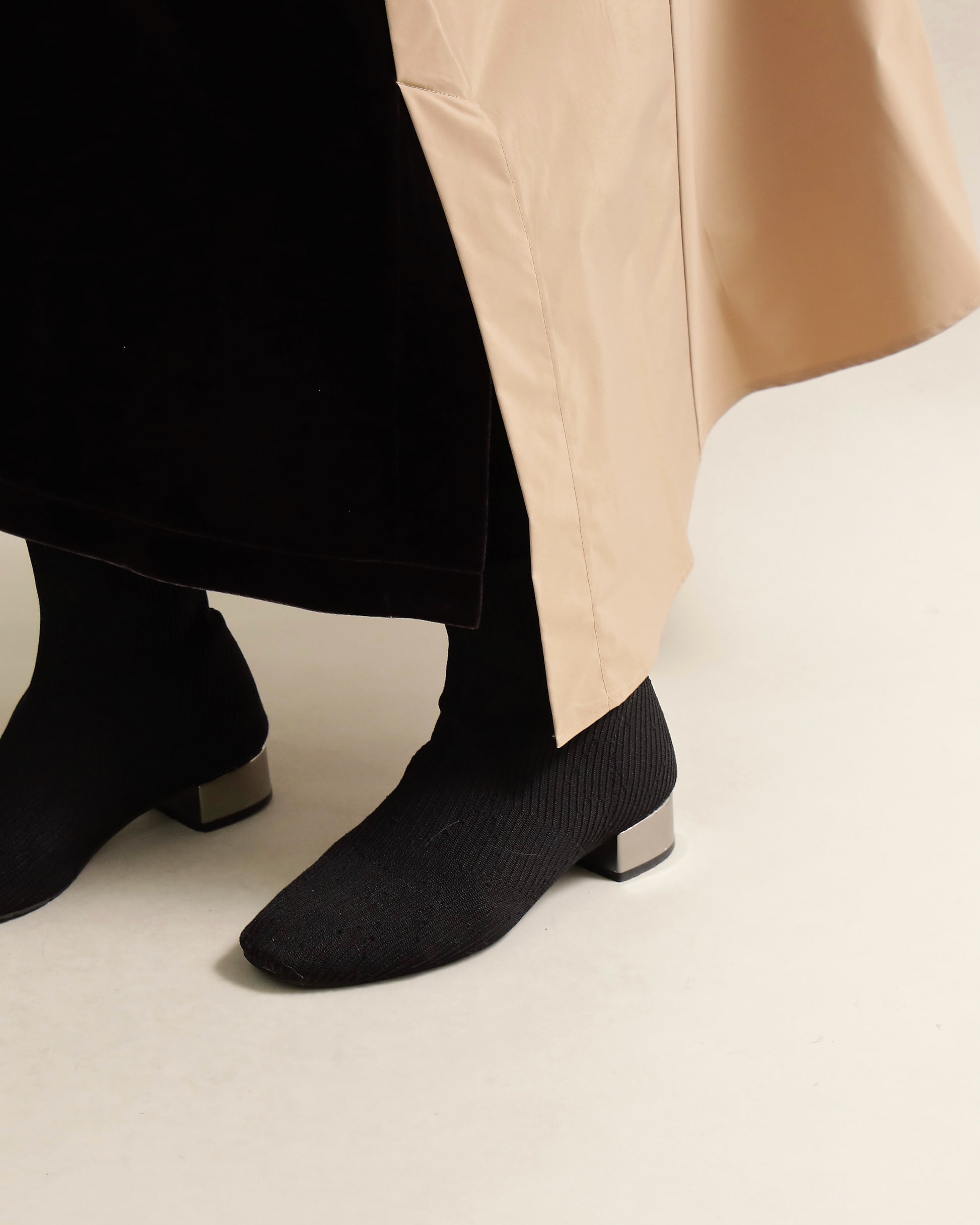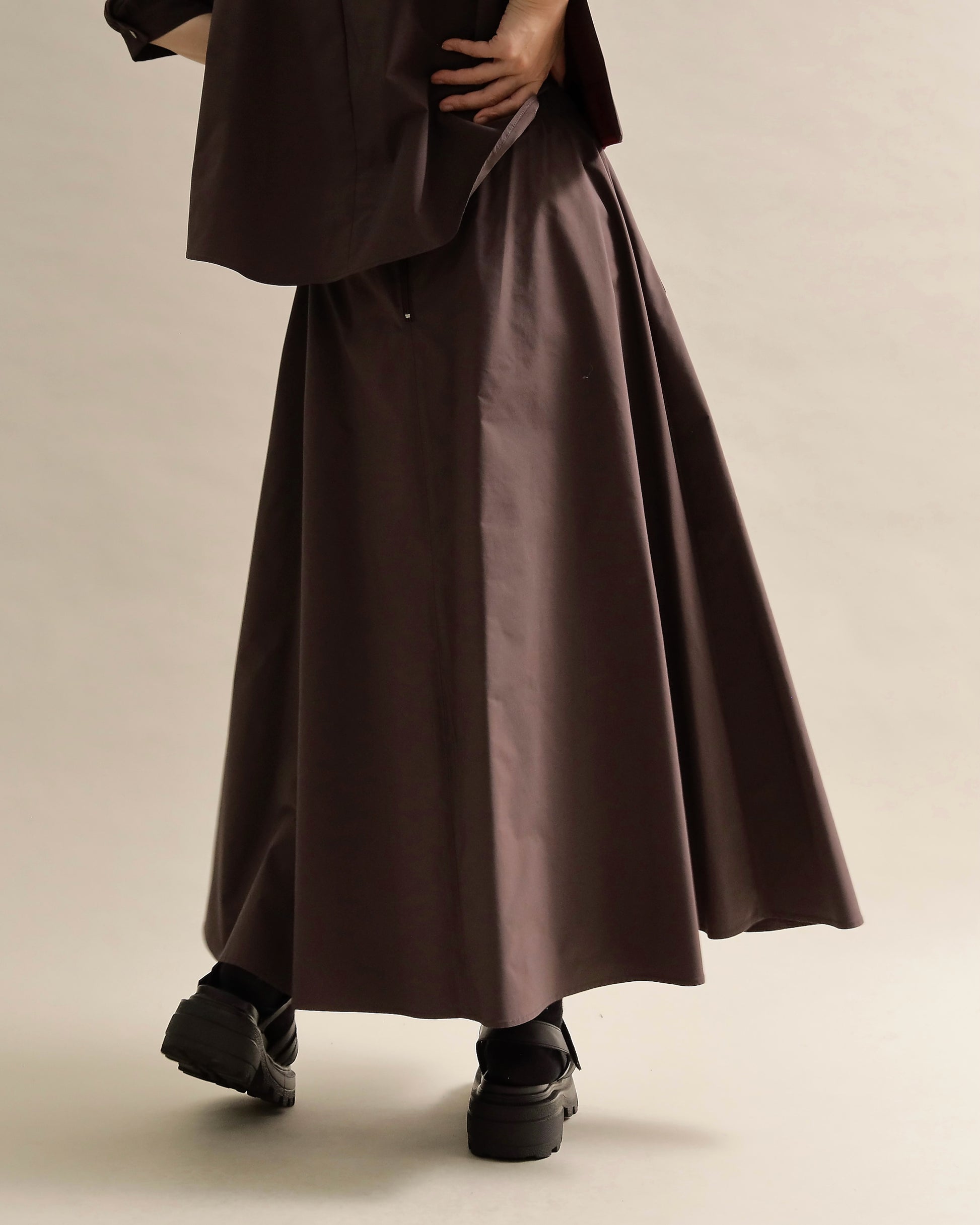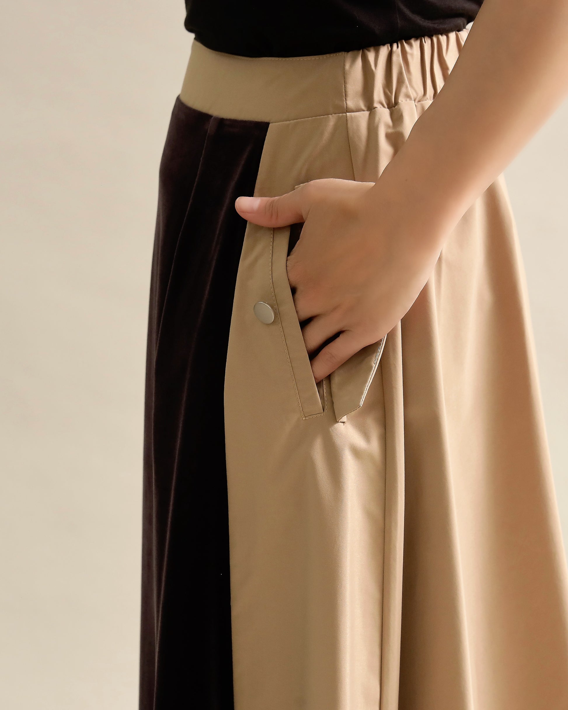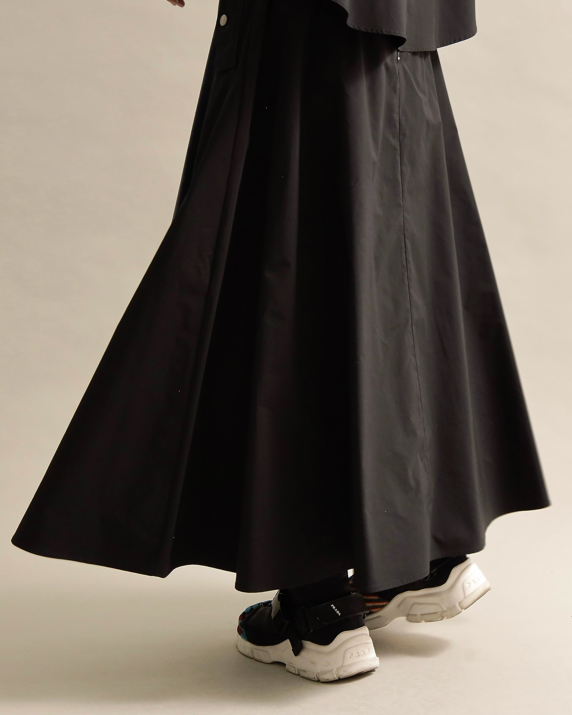 ベロアの深い艶と、ハリのある布帛素材を組み合わせた異素材スカート。