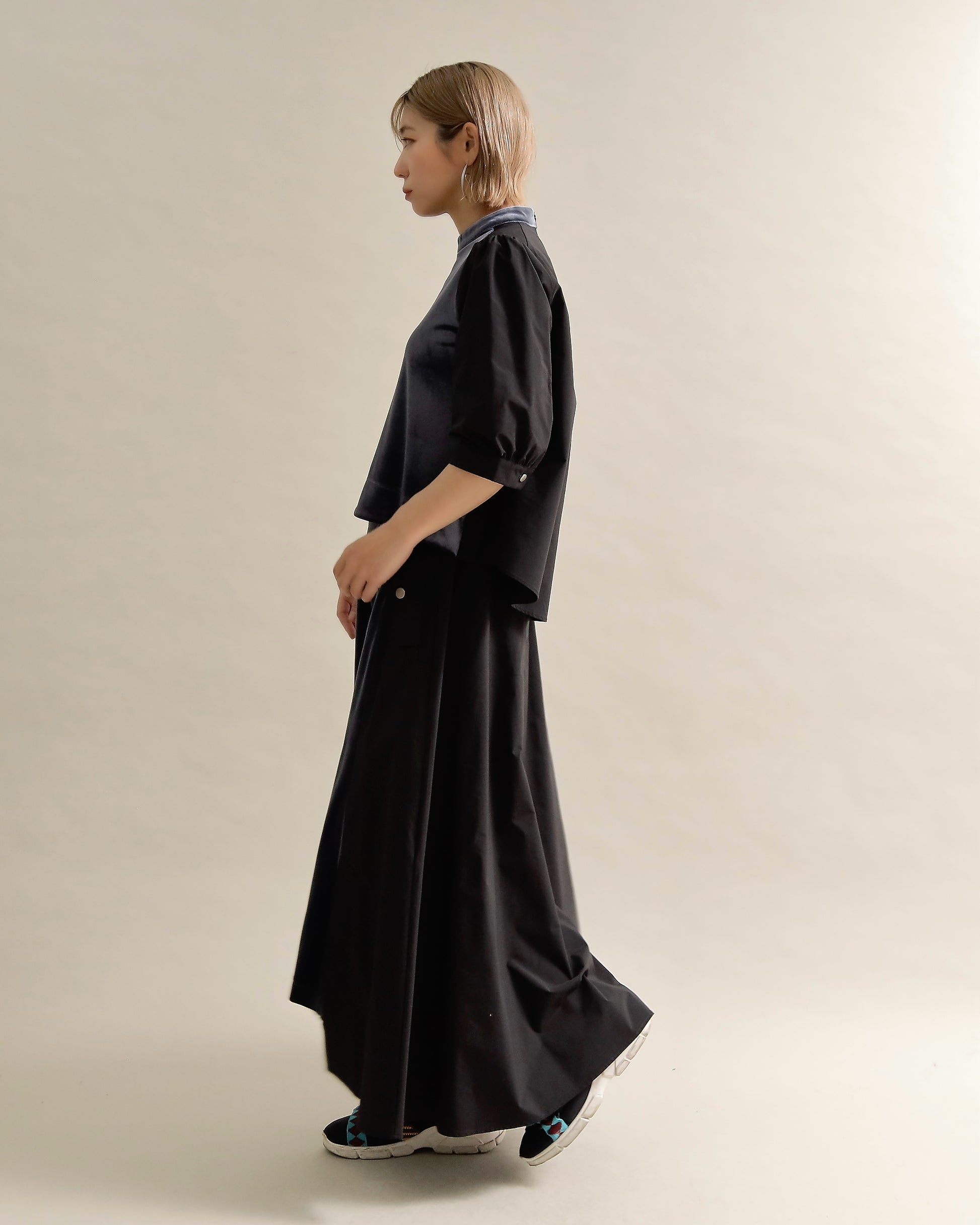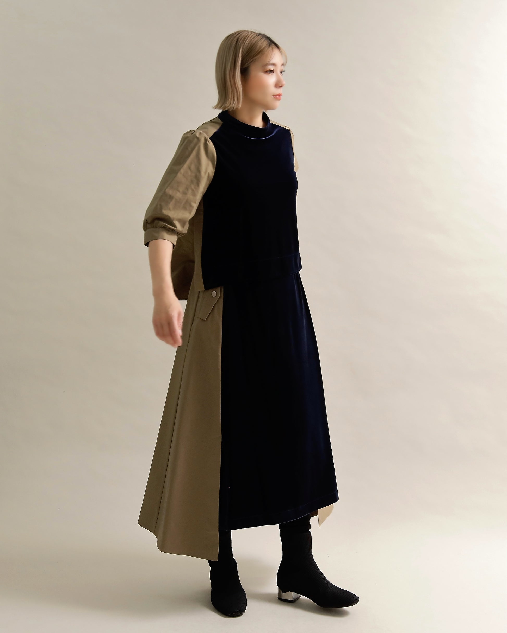 動くたびに揺れる柔らかなドレープと、サイドの布帛パネルが立体的な表情をつくり出します。