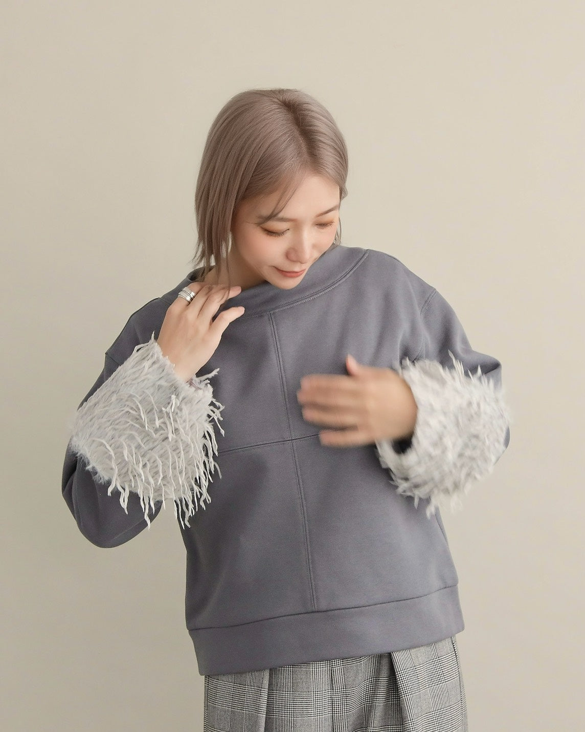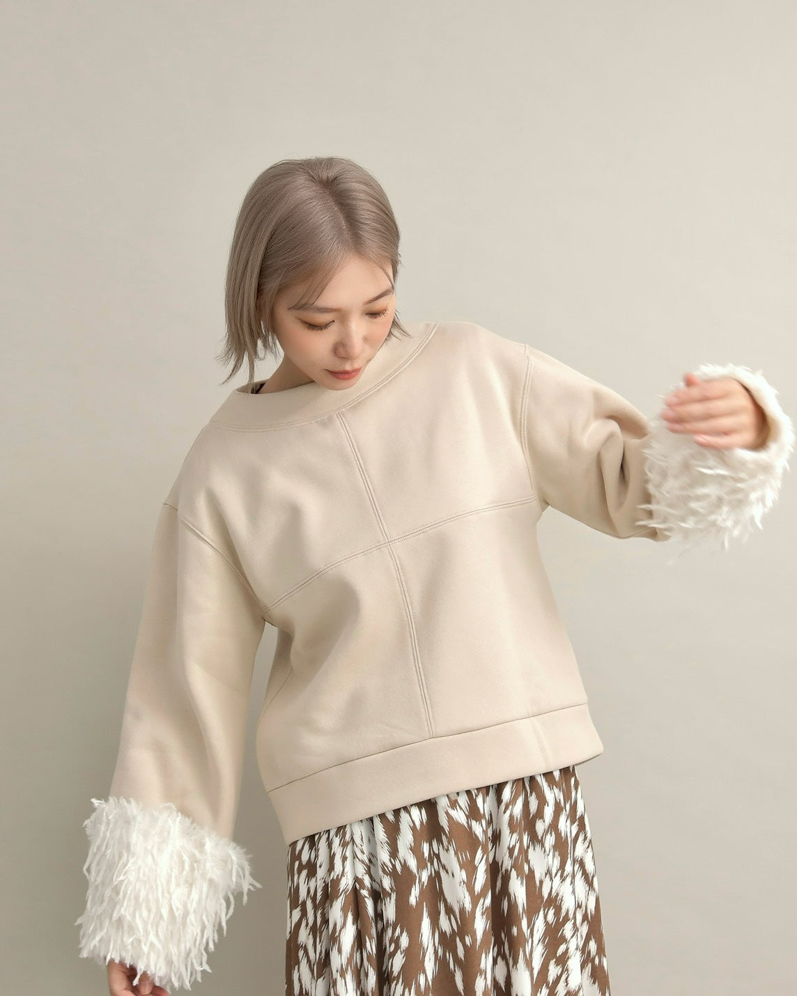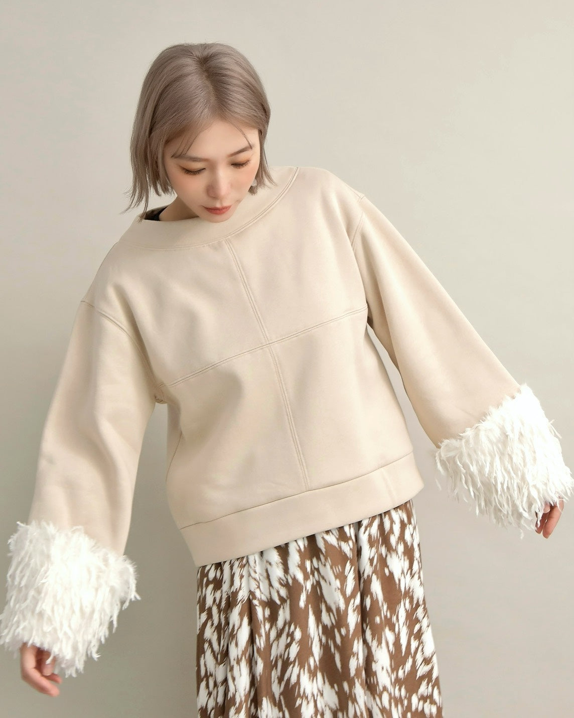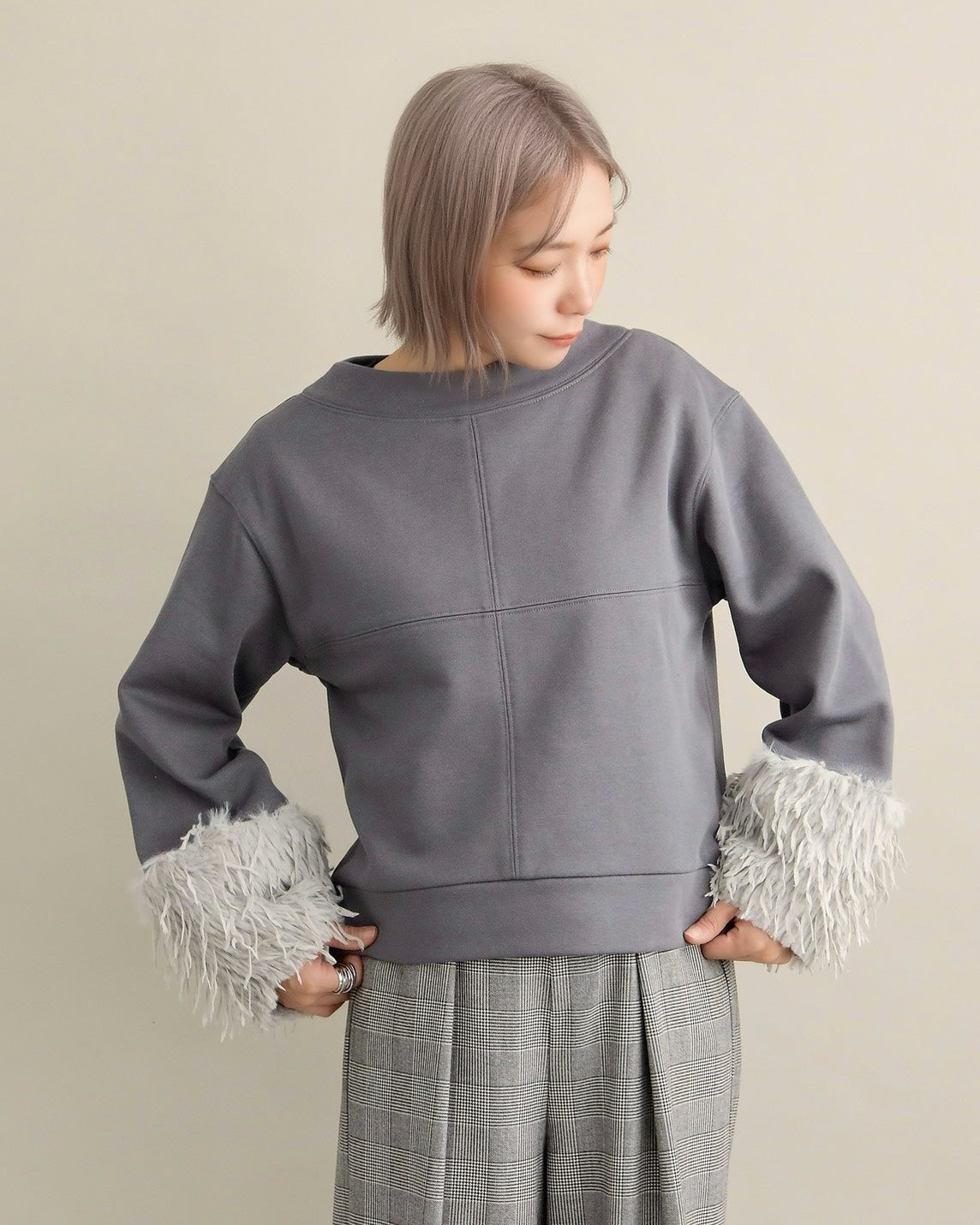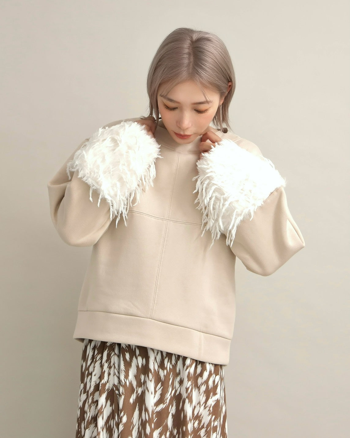 袖口にあしらったフリンジファーが、存在感を放つデザインスウェット。
