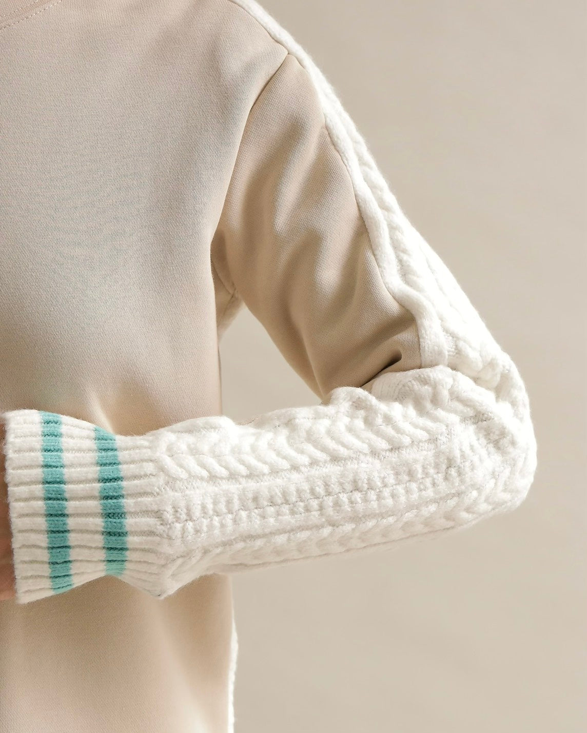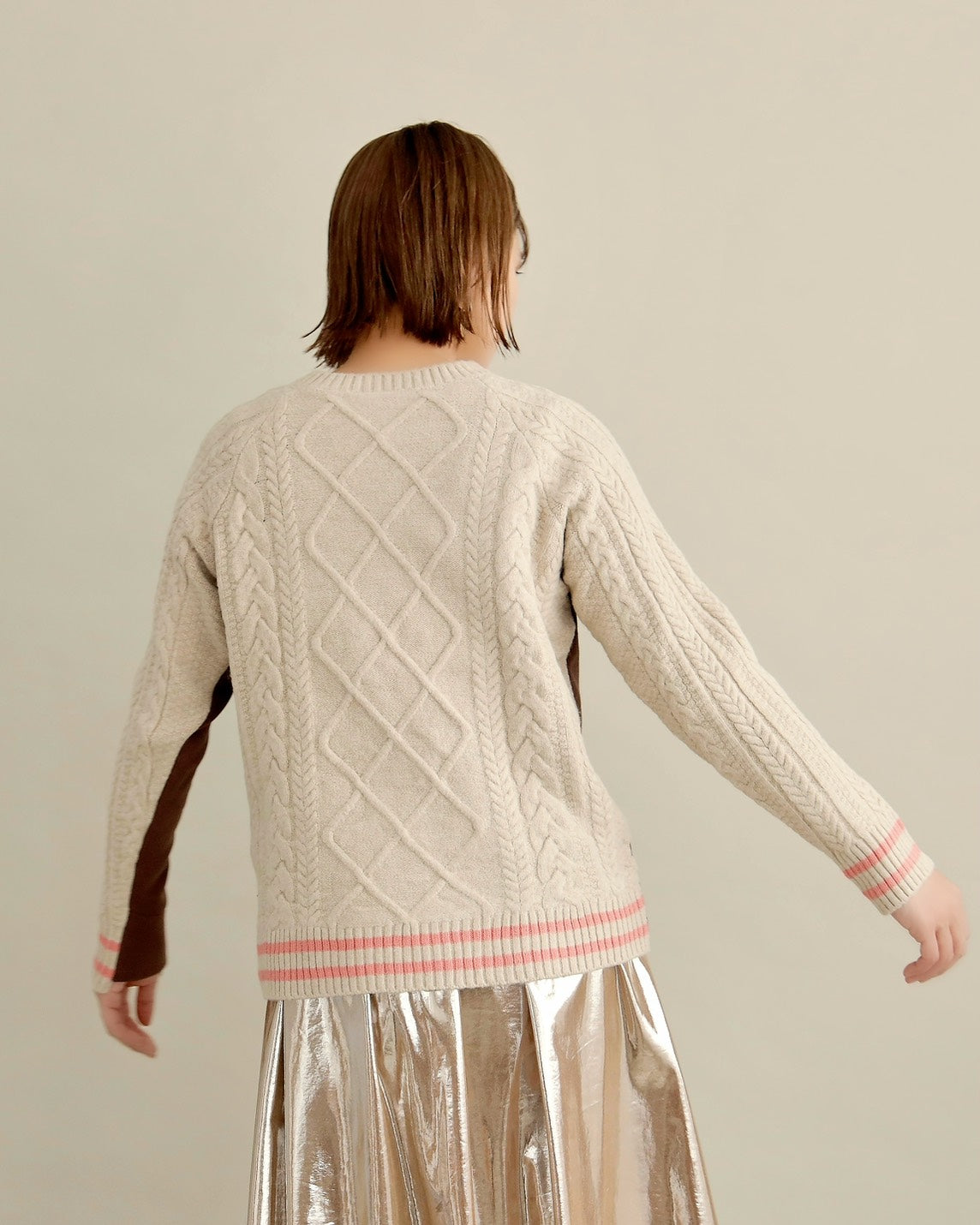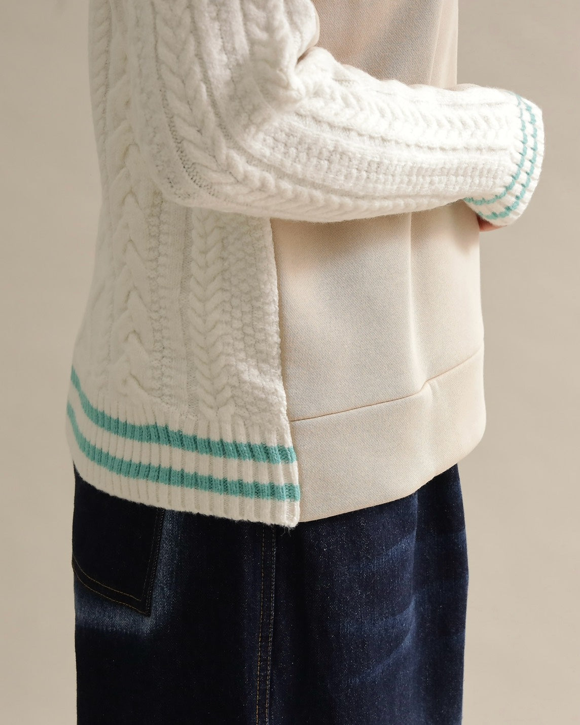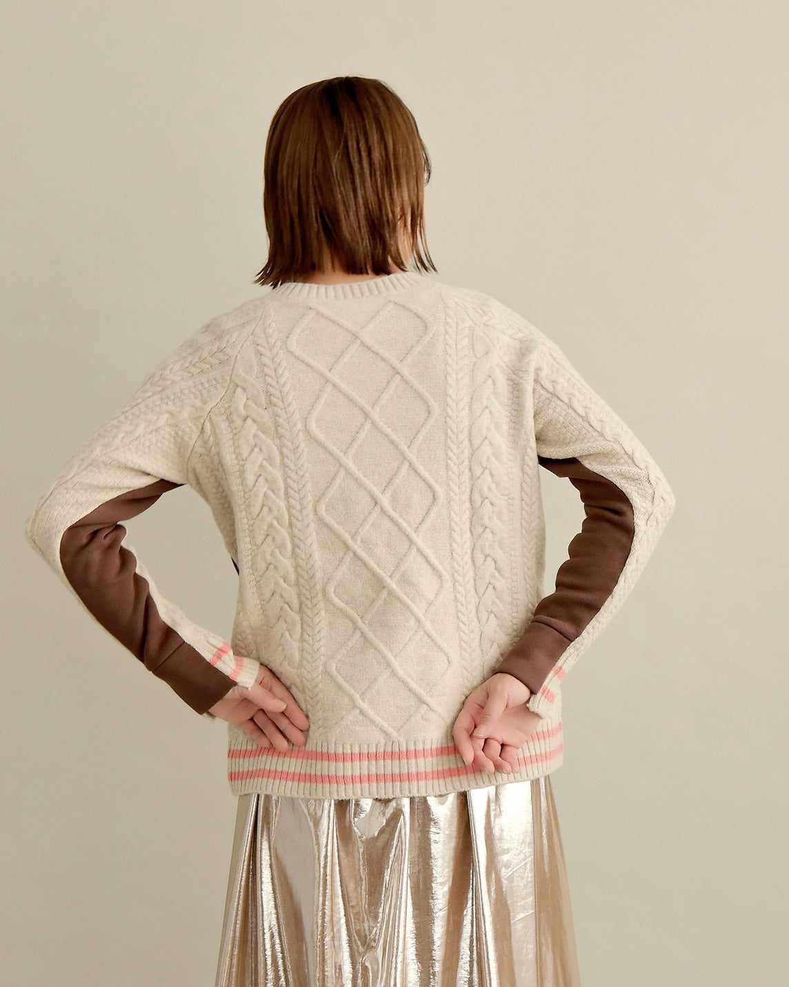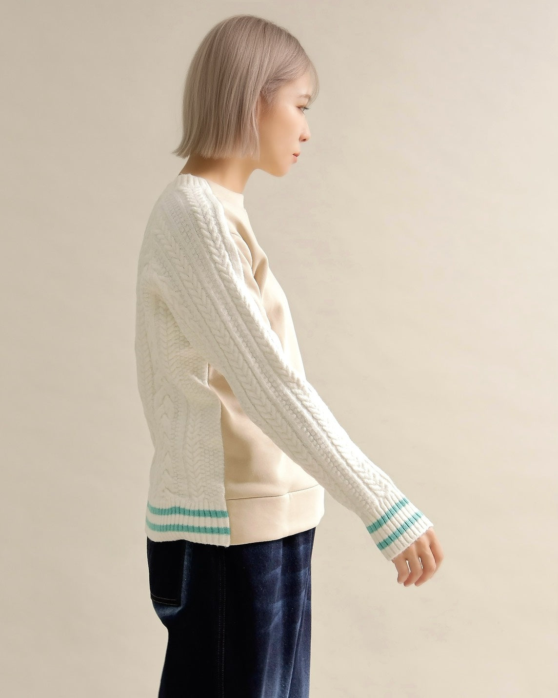 フロントはすっきりとしたスウェット地、袖からバックにかけては立体的なケーブル編みニットを組み合わせ、1枚で主役になるバランスに仕上げました。