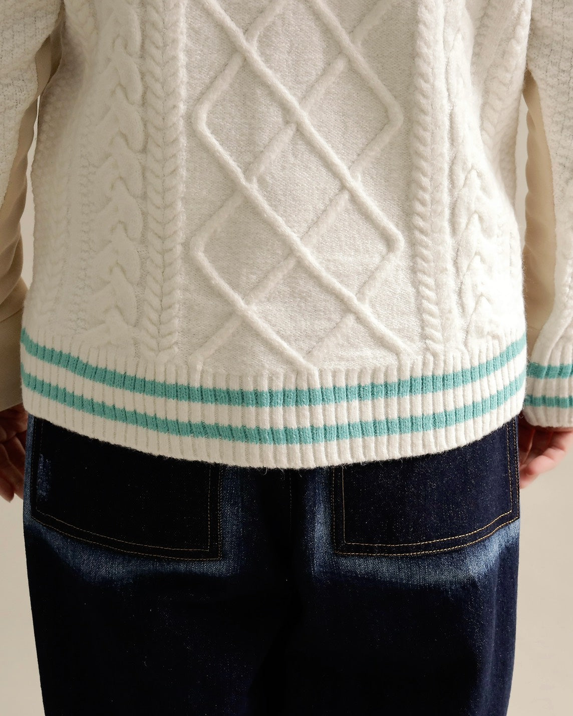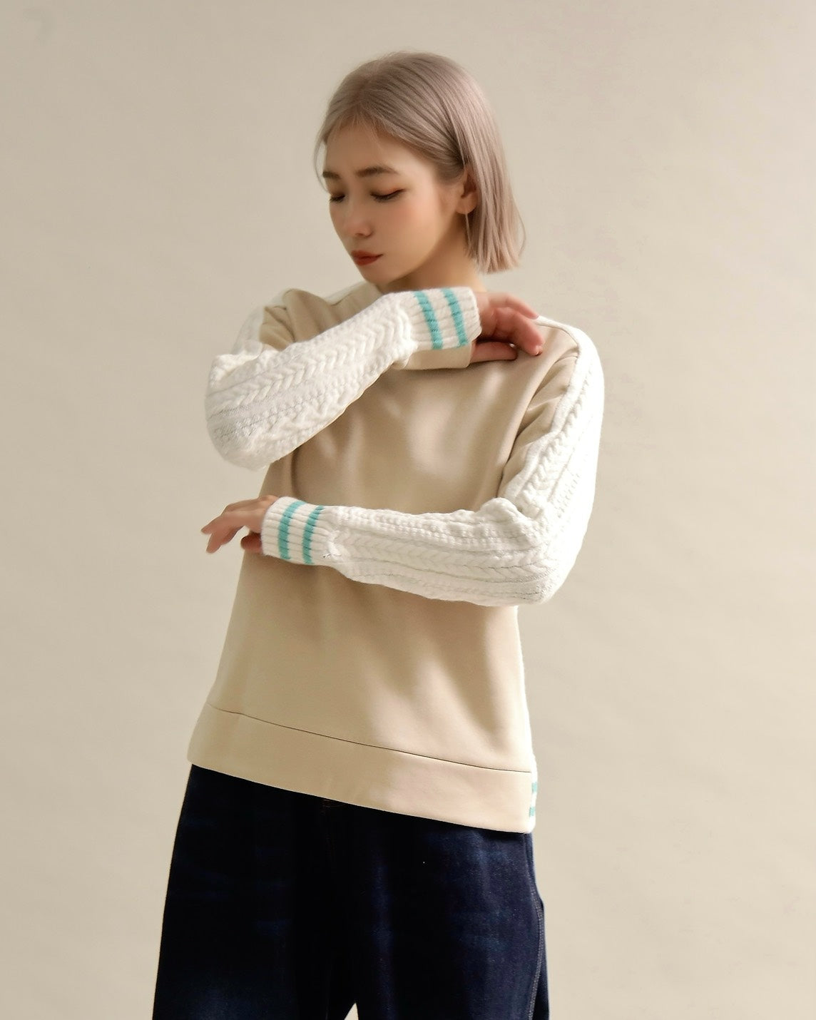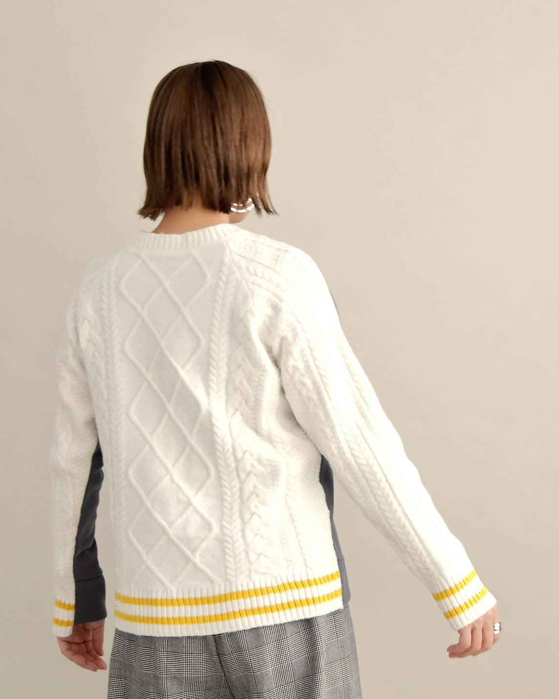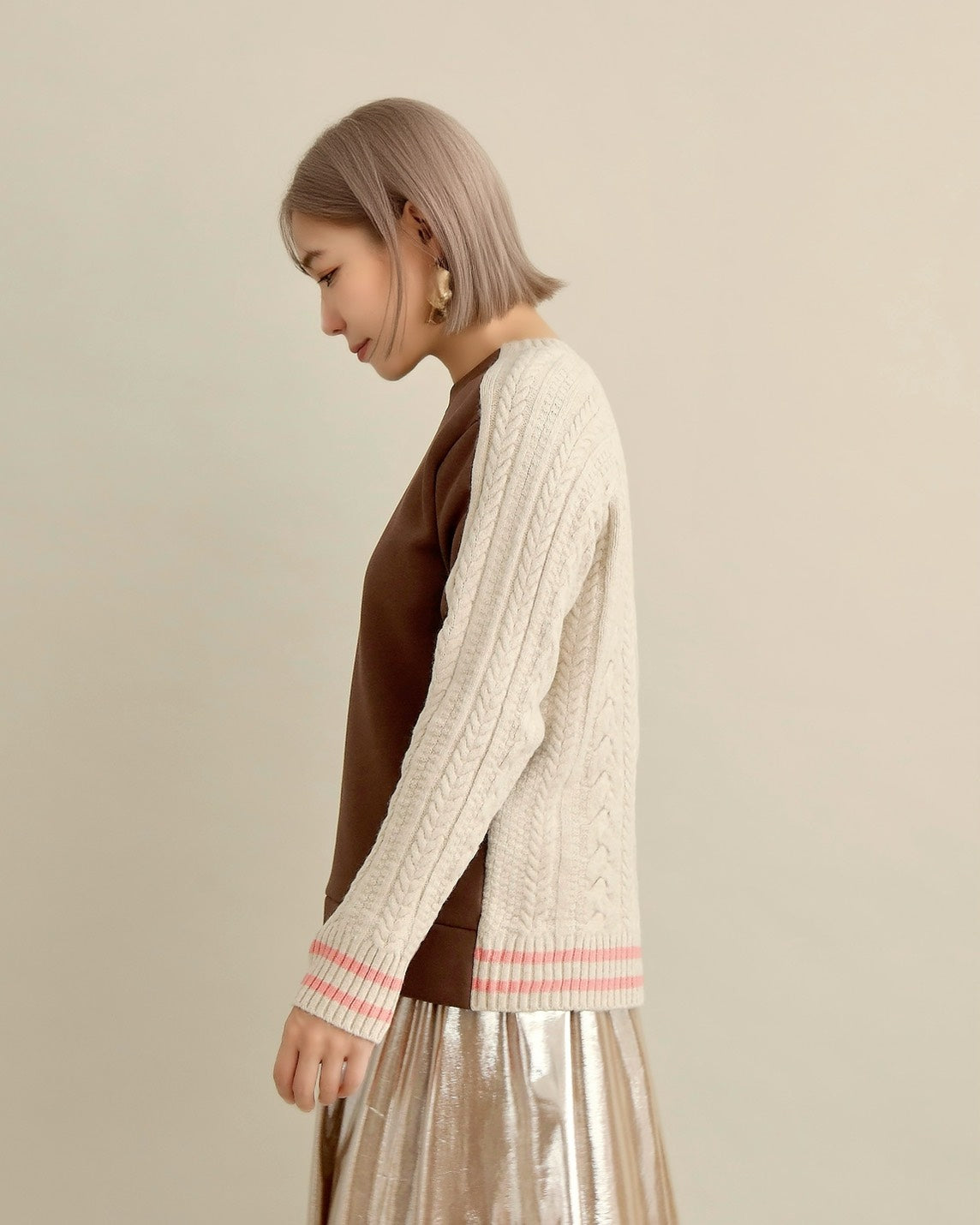 フロントはすっきりとしたスウェット地、袖からバックにかけては立体的なケーブル編みニットを組み合わせ、1枚で主役になるバランスに仕上げました。