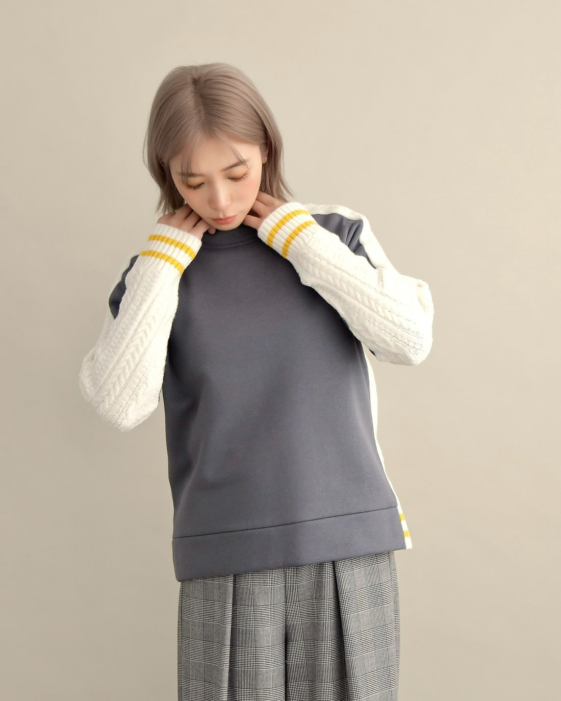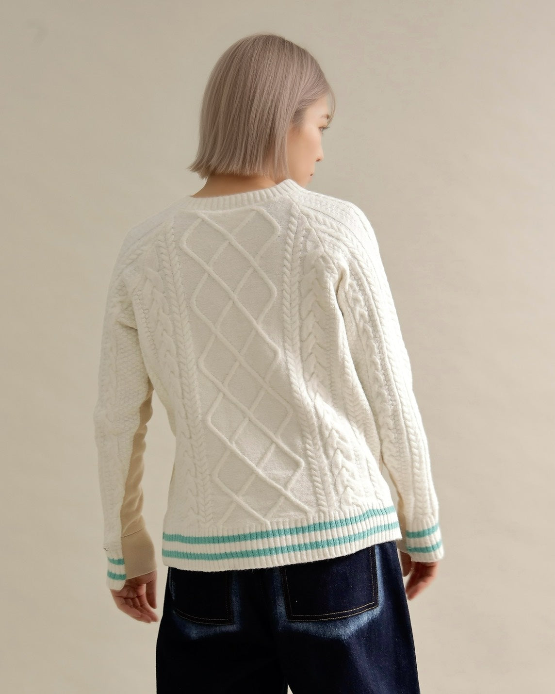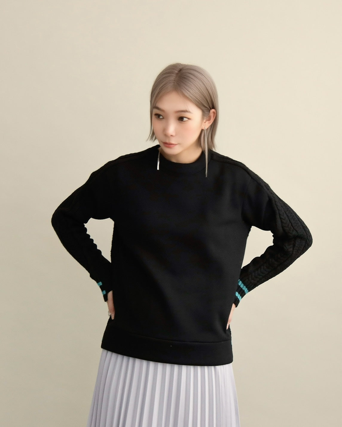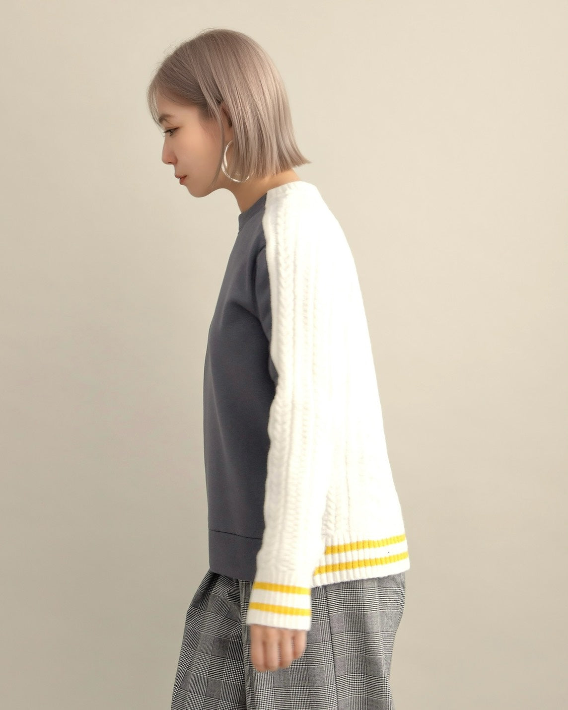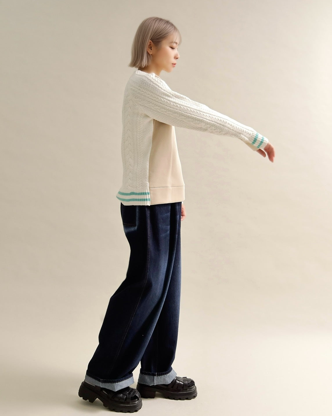 フロントはすっきりとしたスウェット地、袖からバックにかけては立体的なケーブル編みニットを組み合わせ、1枚で主役になるバランスに仕上げました。