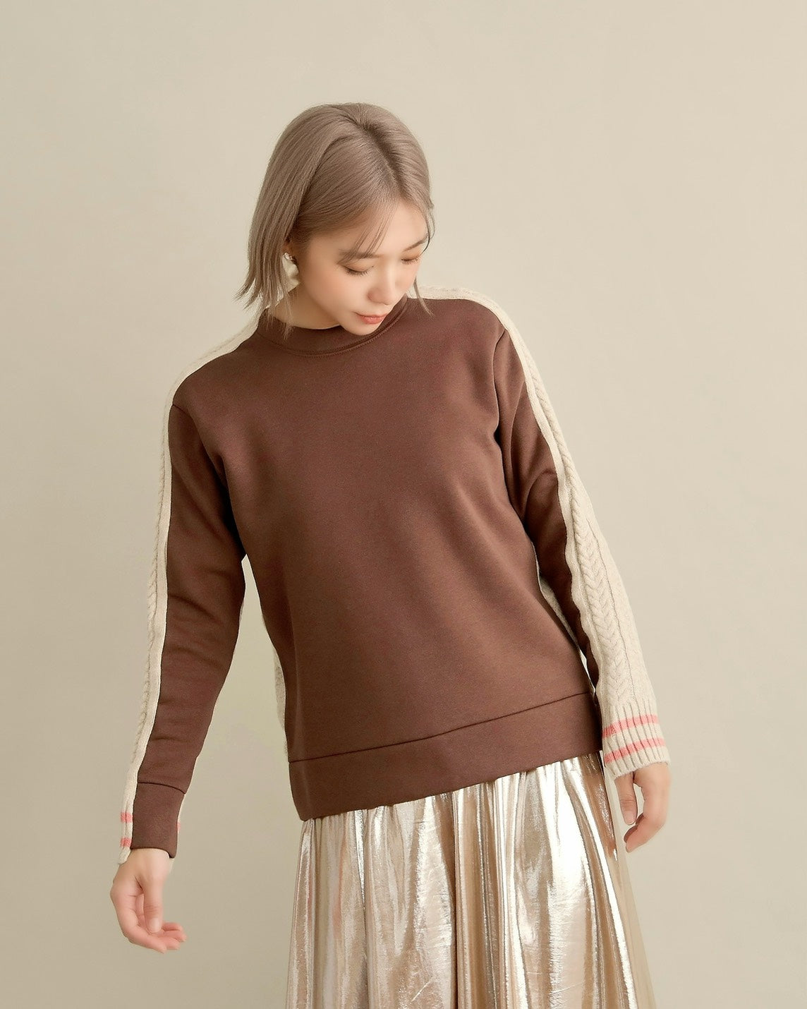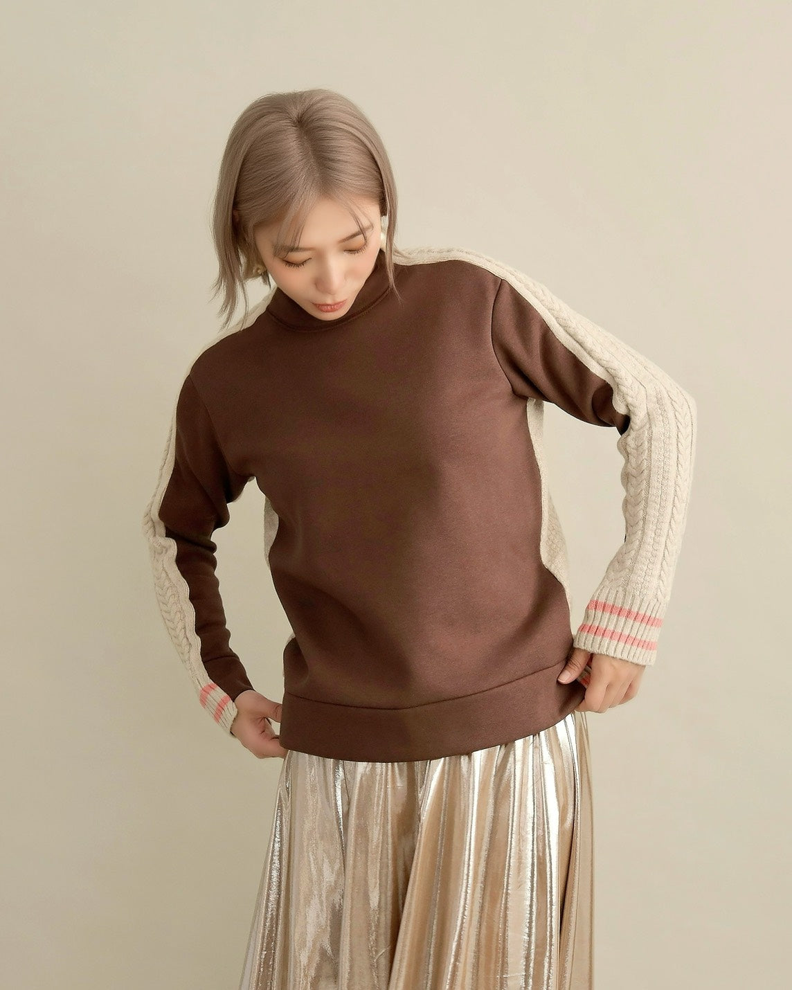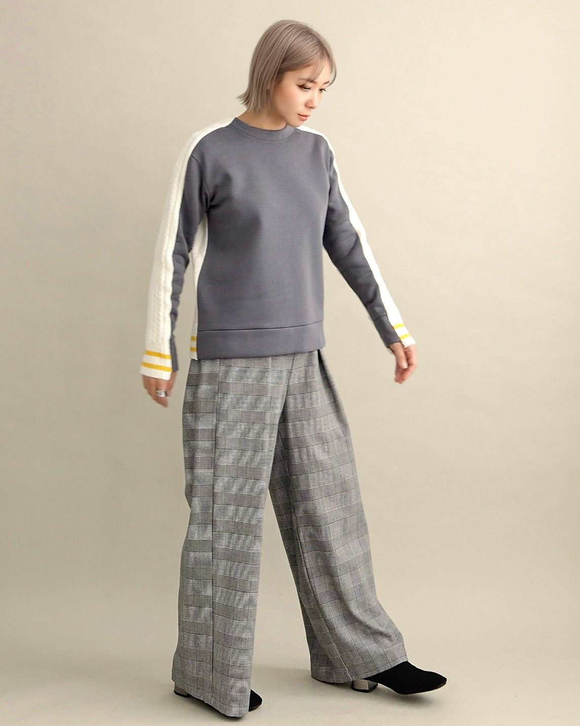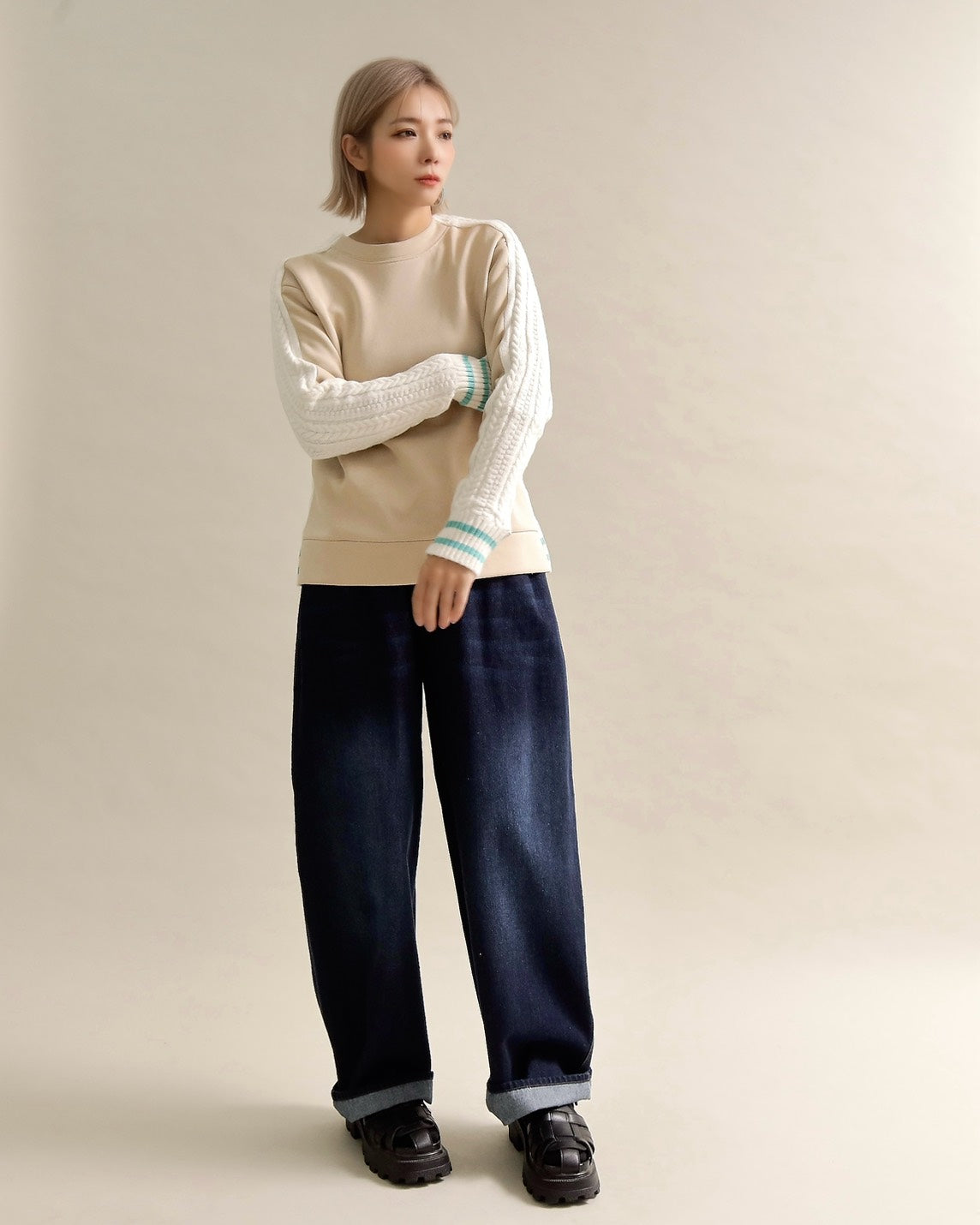フロントはすっきりとしたスウェット地、袖からバックにかけては立体的なケーブル編みニットを組み合わせ、1枚で主役になるバランスに仕上げました。
