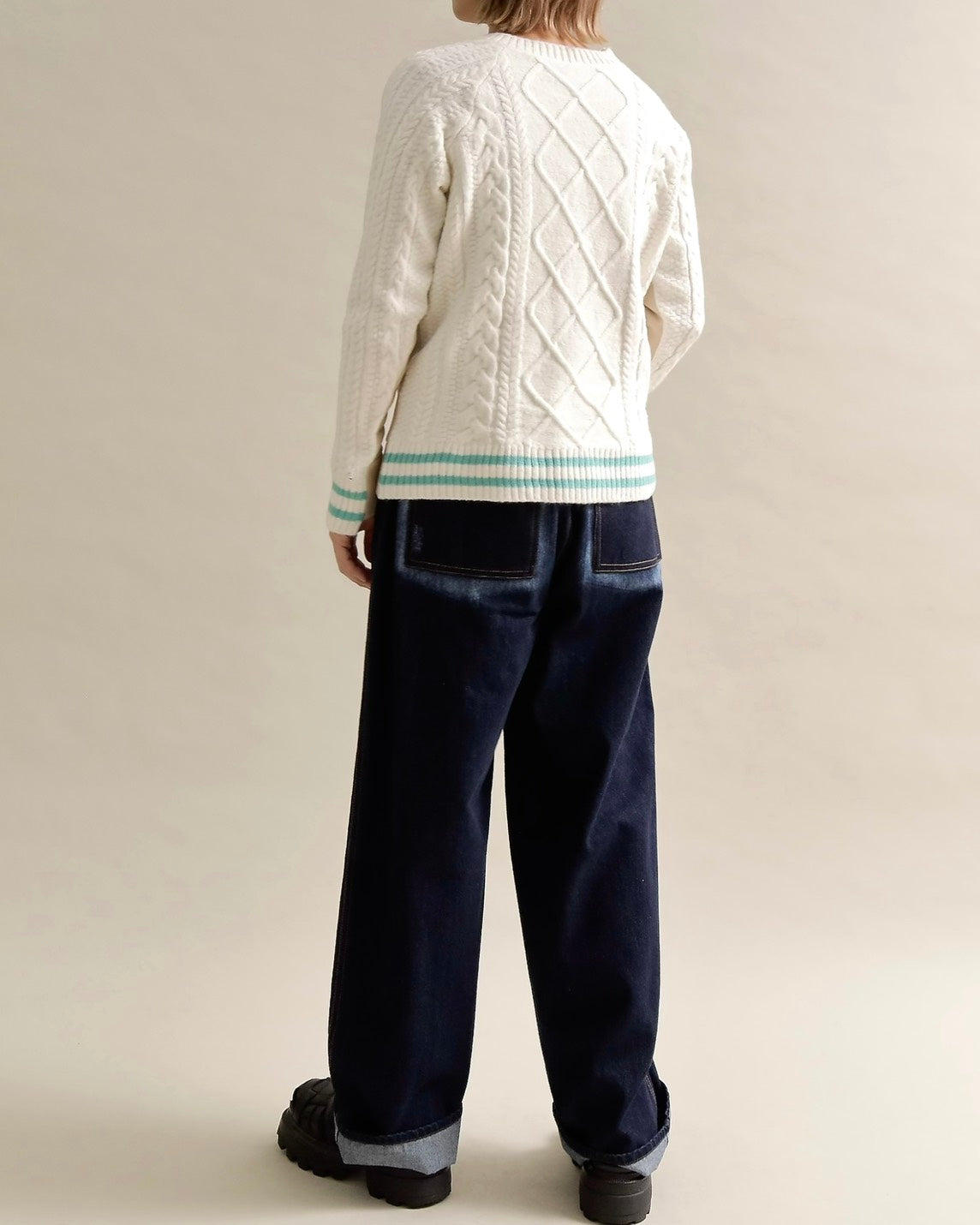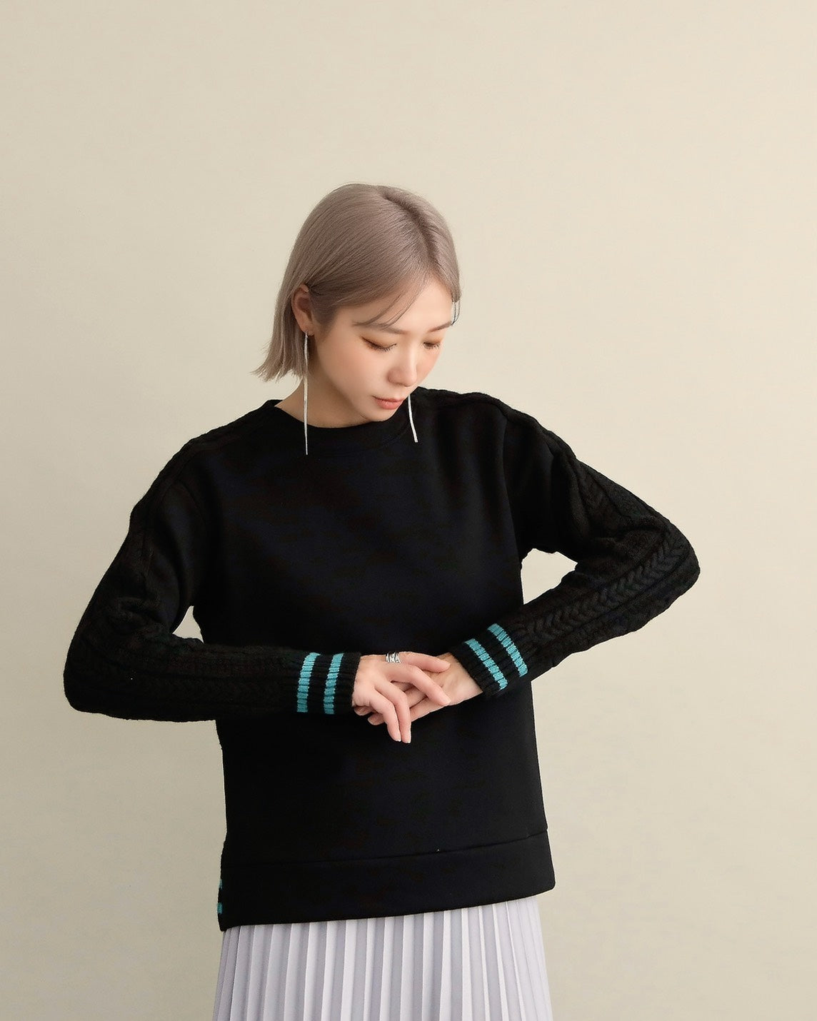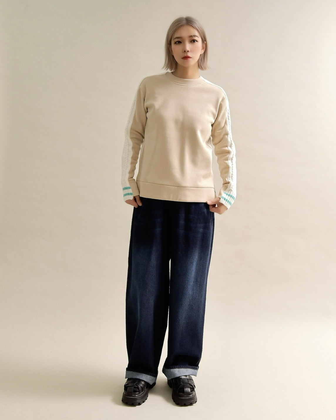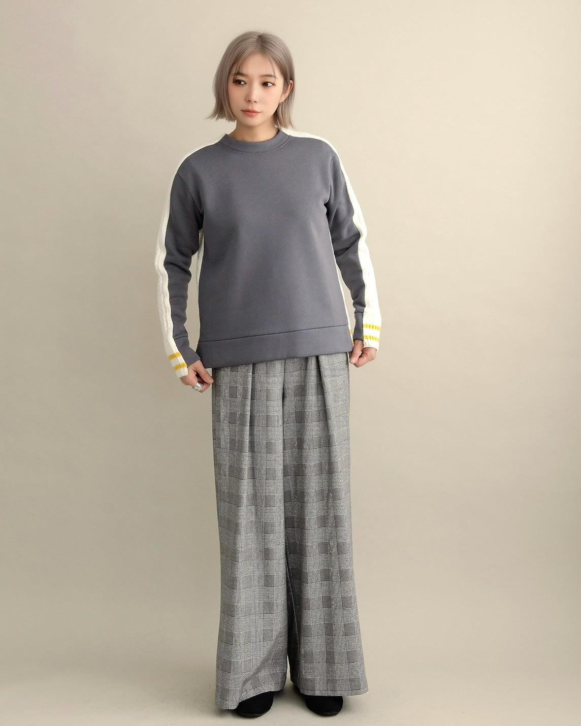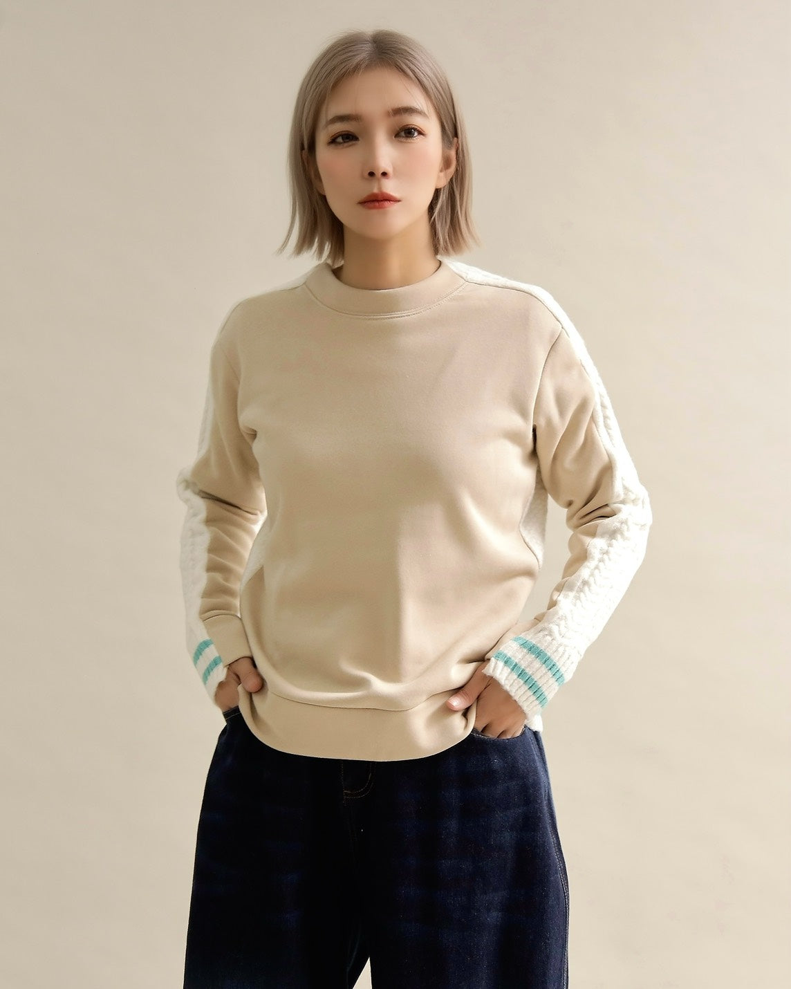 フロントはすっきりとしたスウェット地、袖からバックにかけては立体的なケーブル編みニットを組み合わせ、1枚で主役になるバランスに仕上げました。