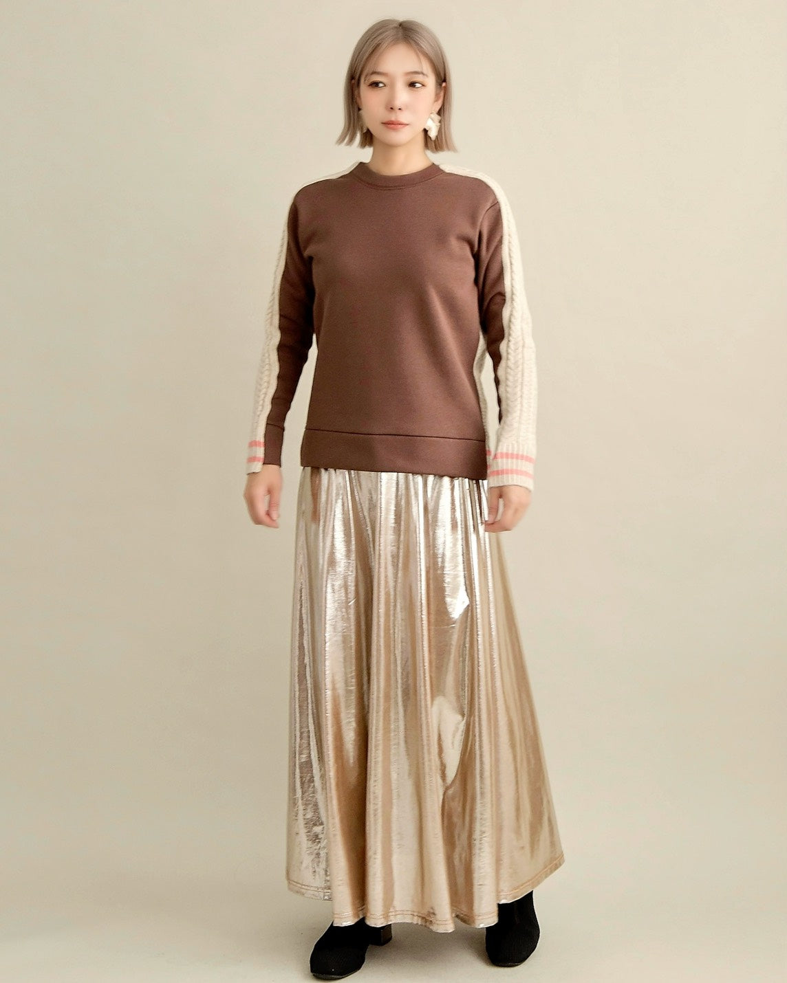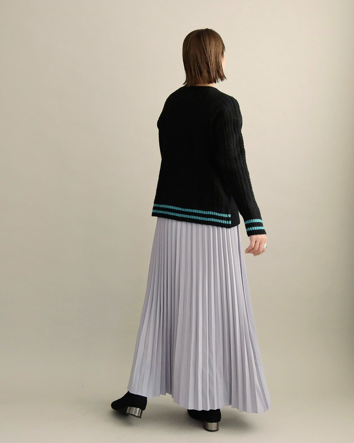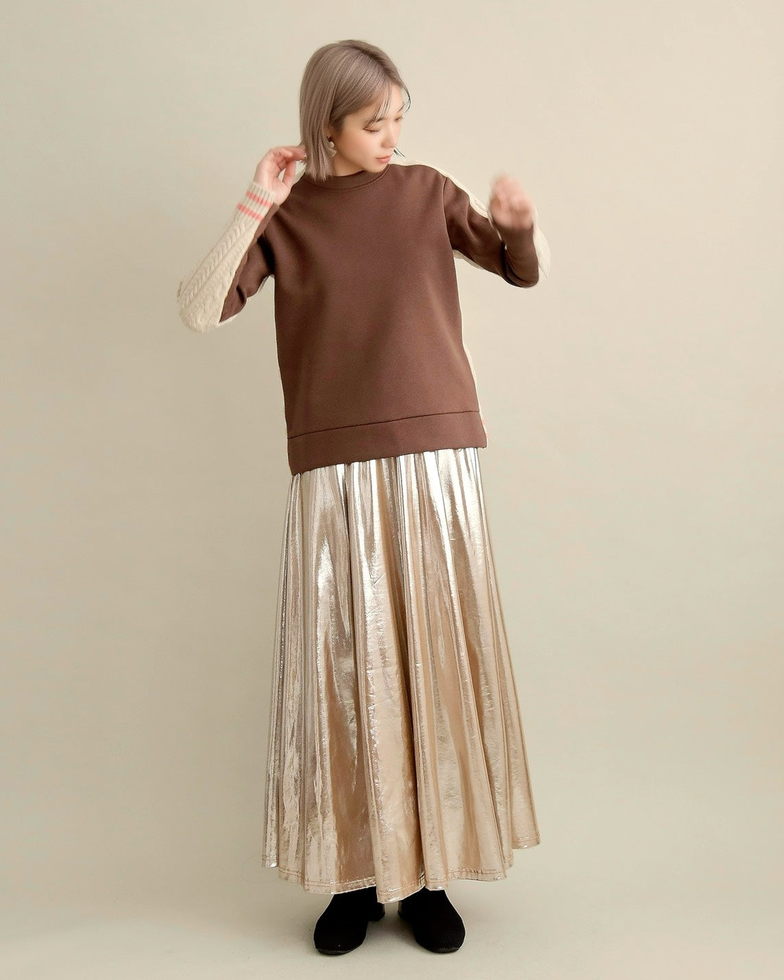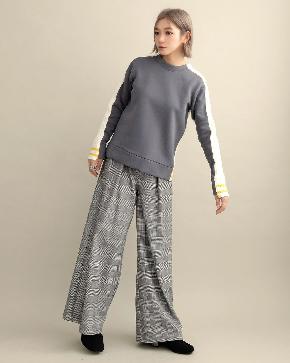 フロントはすっきりとしたスウェット地、袖からバックにかけては立体的なケーブル編みニットを組み合わせ、1枚で主役になるバランスに仕上げました。