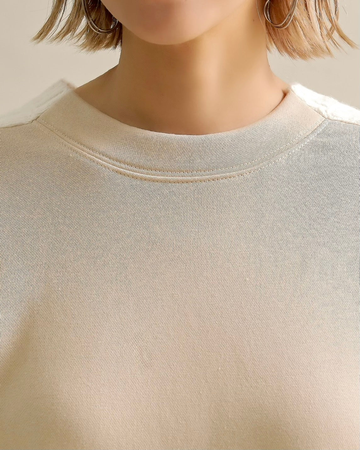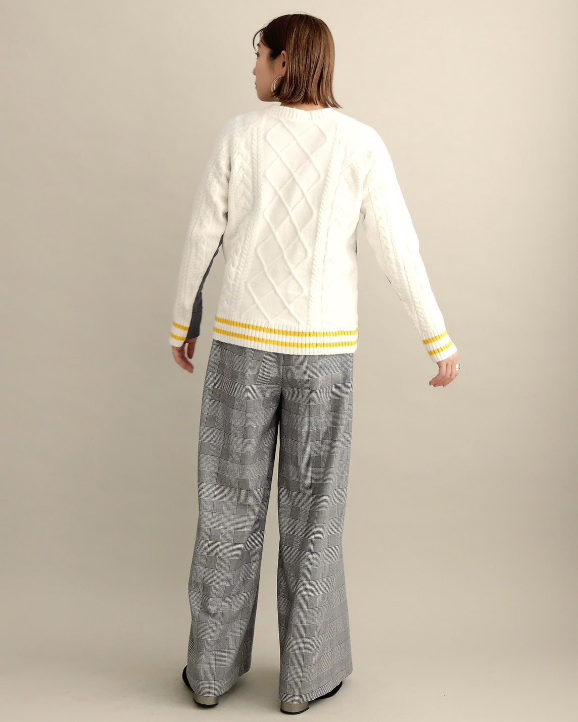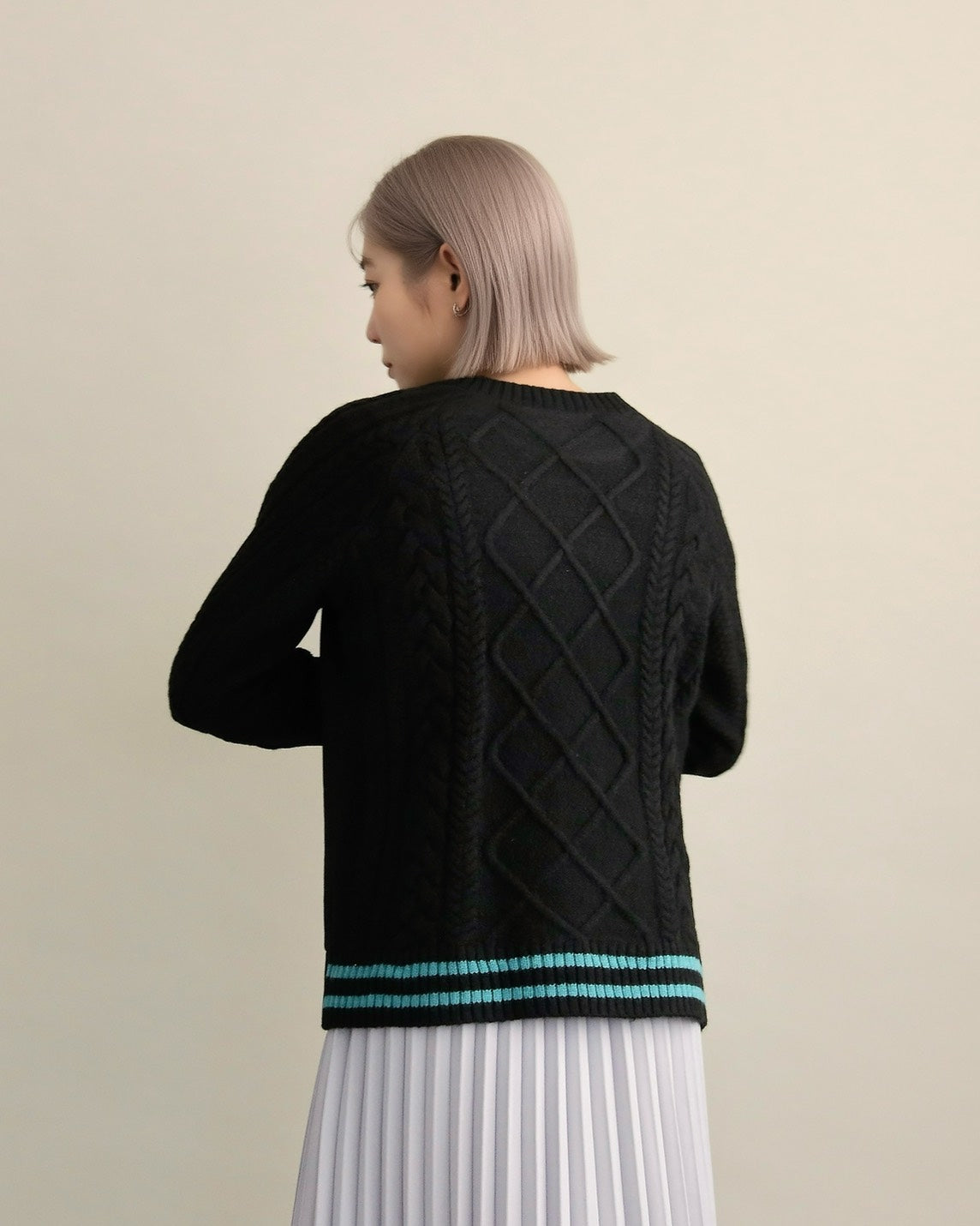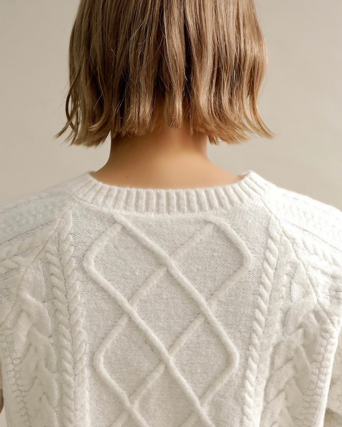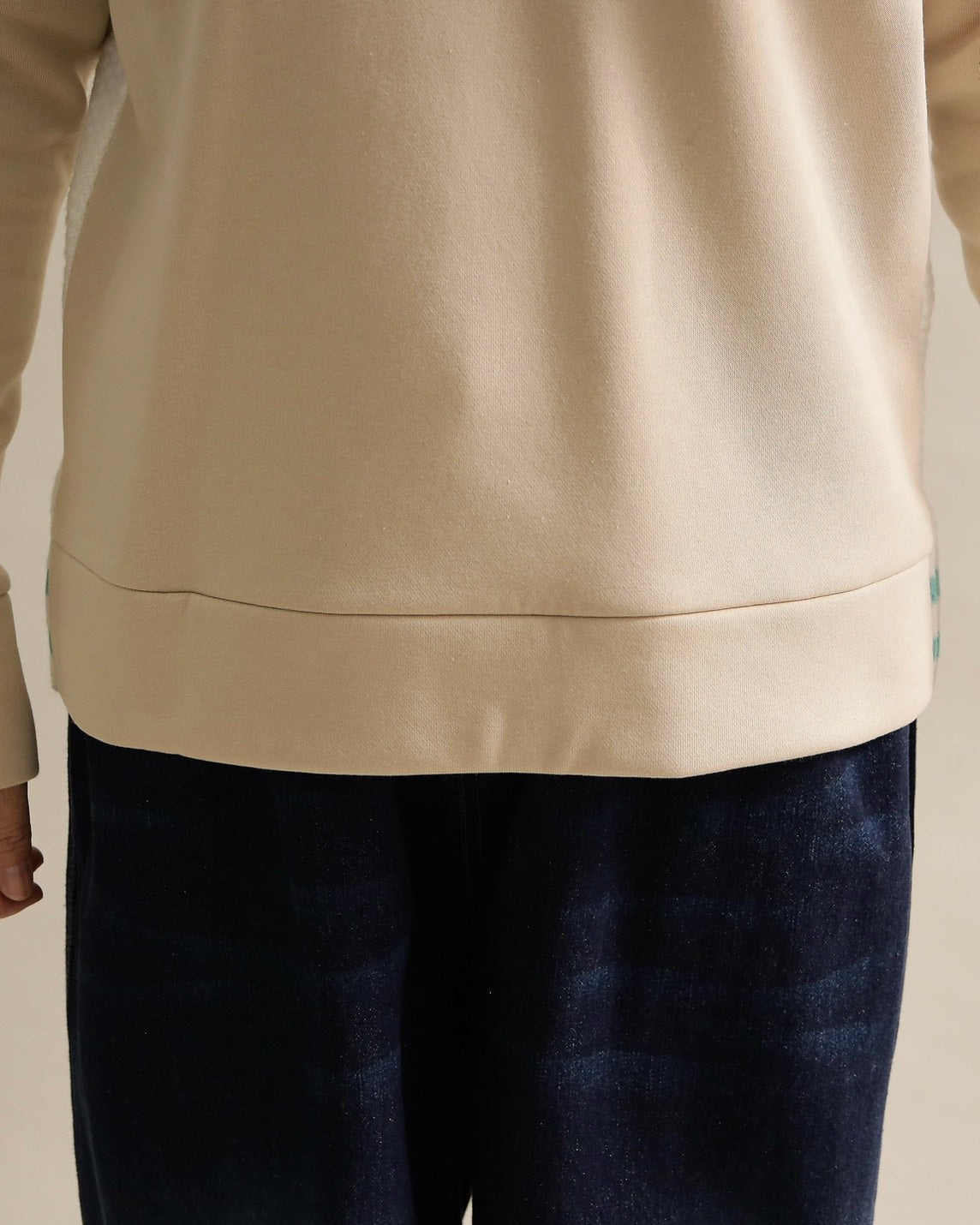 フロントはすっきりとしたスウェット地、袖からバックにかけては立体的なケーブル編みニットを組み合わせ、1枚で主役になるバランスに仕上げました。