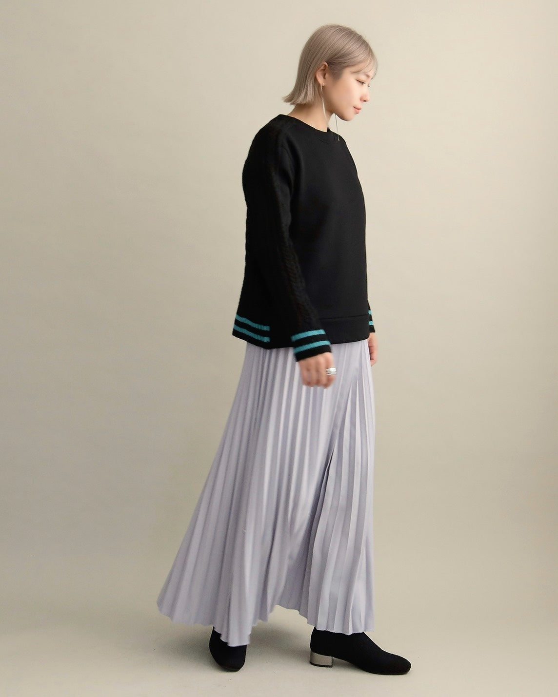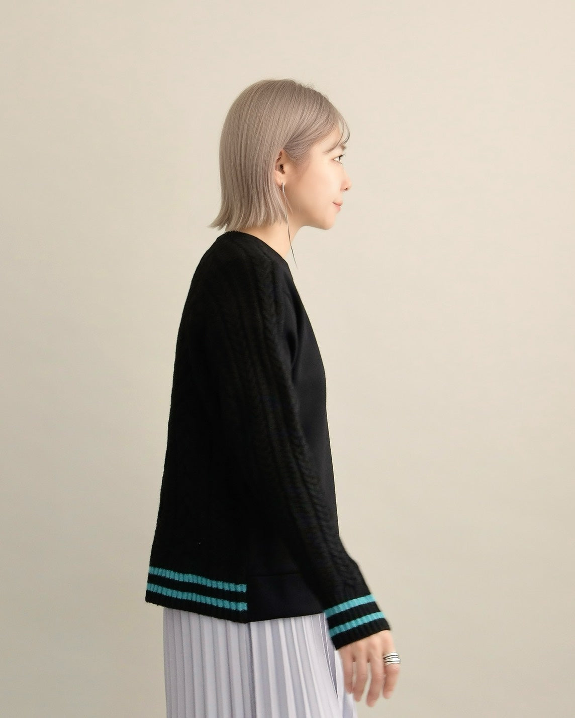 袖口のライン配色がさりげないアクセントとなり、カジュアルすぎない“大人の遊び心”をプラス。
