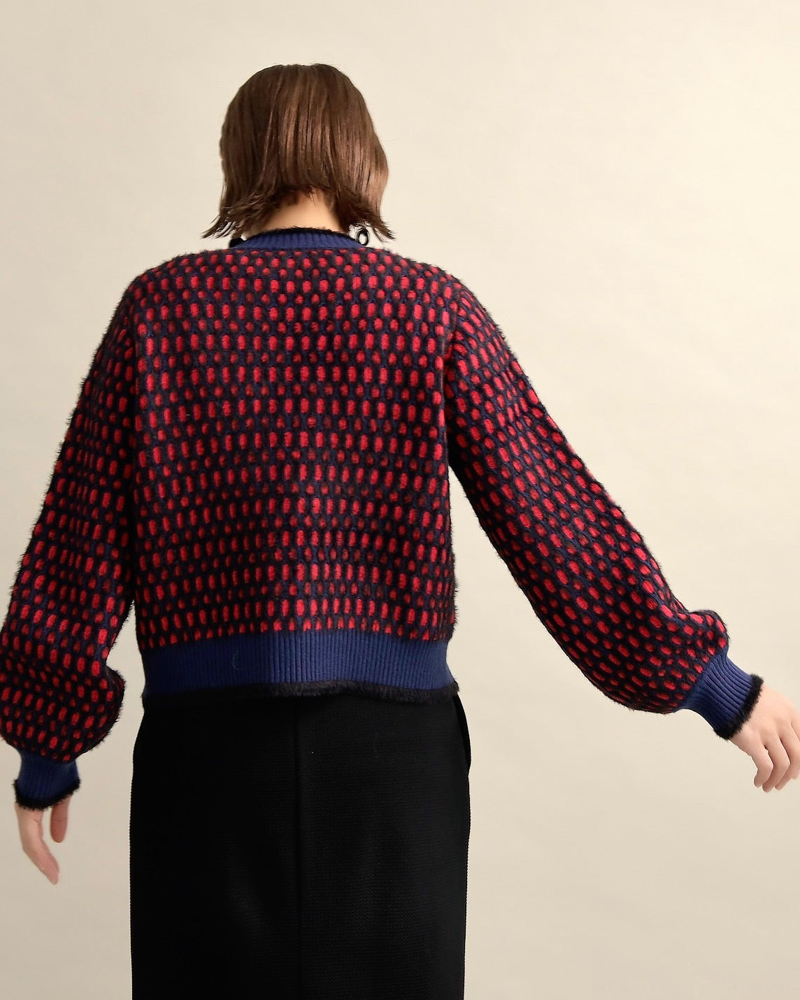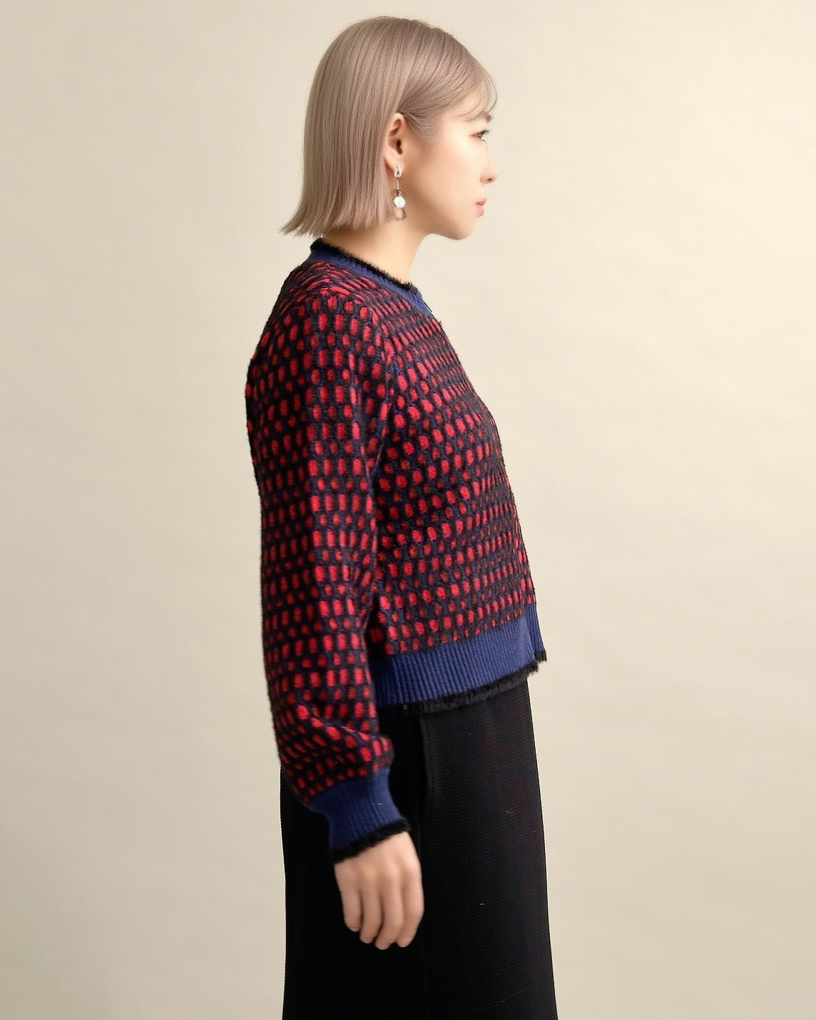 深みのあるネイビーにレッドを重ねた存在感のある配色が、羽織るだけでスタイリングの主役に。