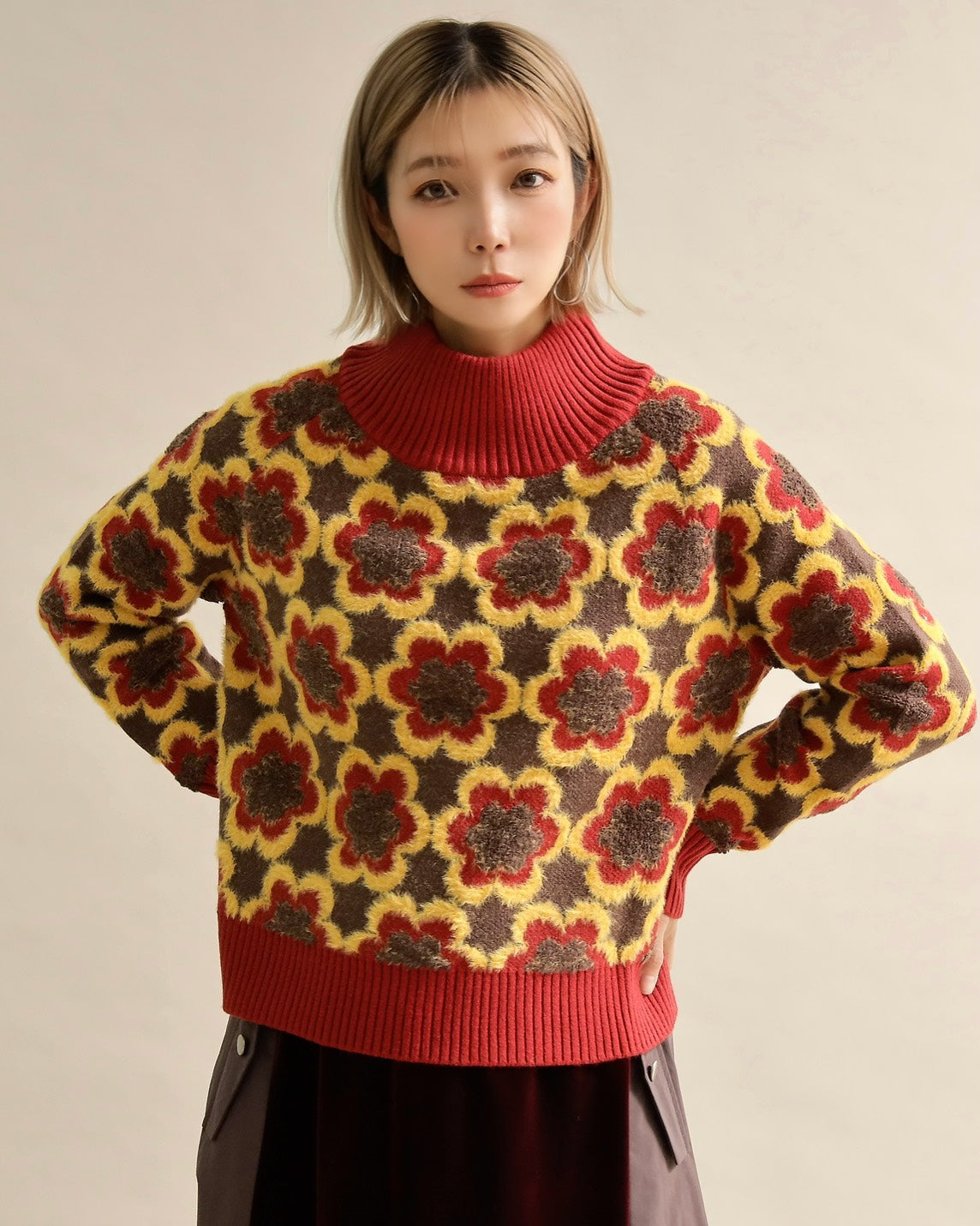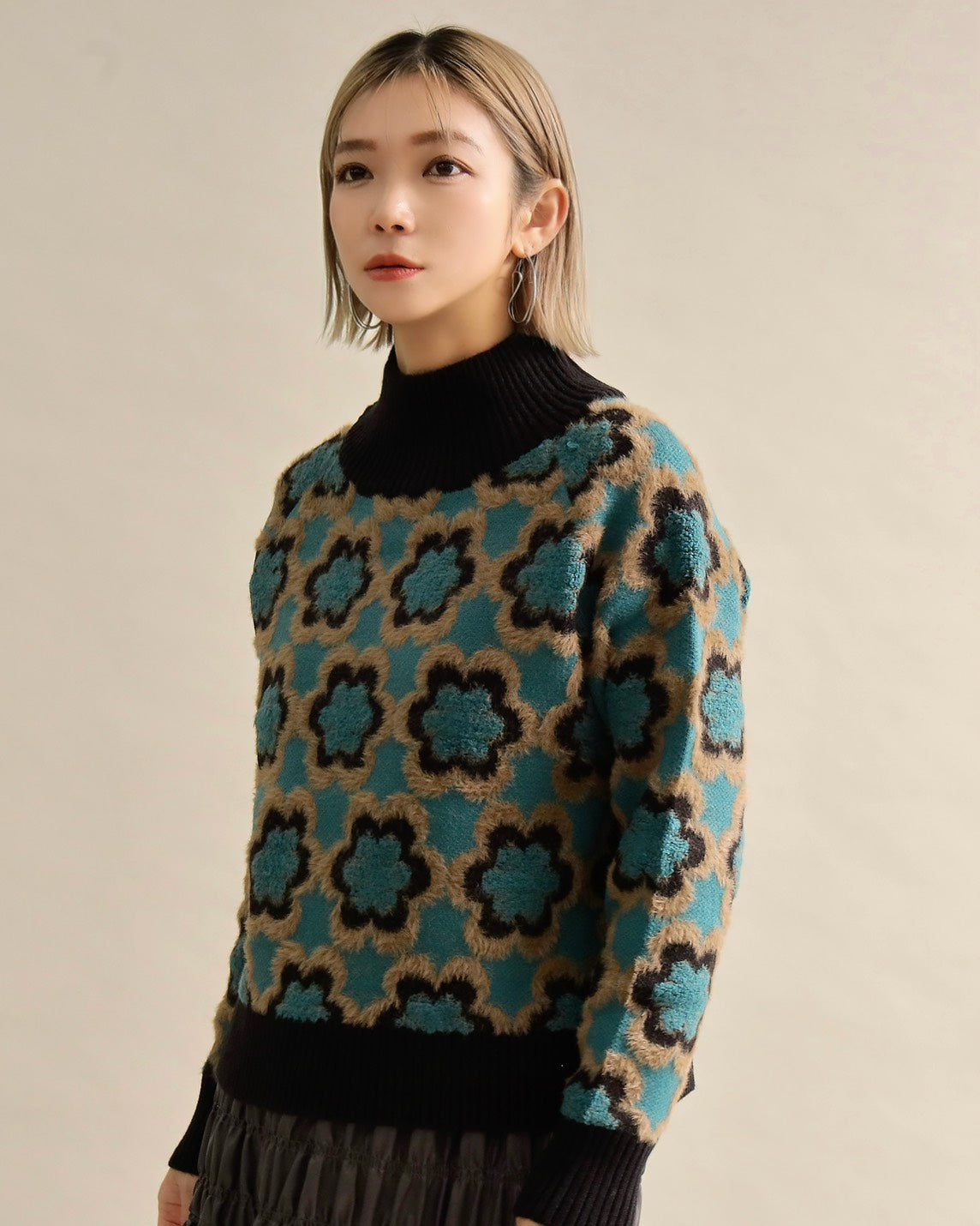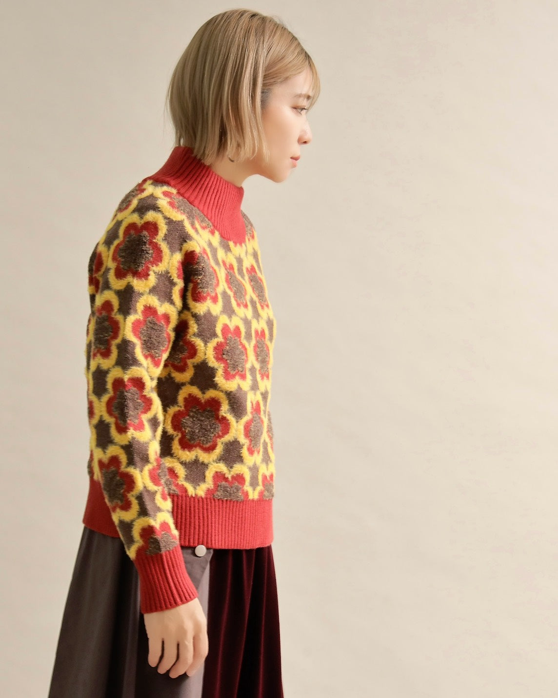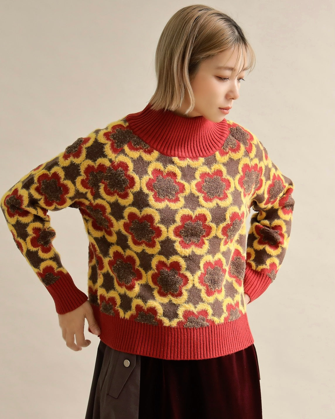 レトロフラワーハイネックニット