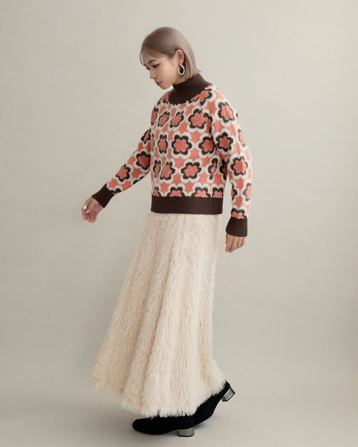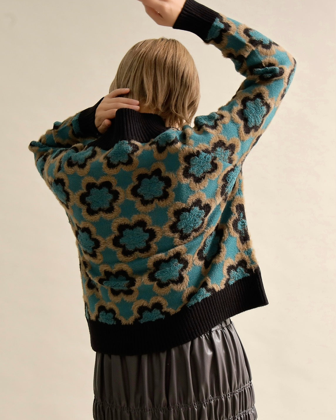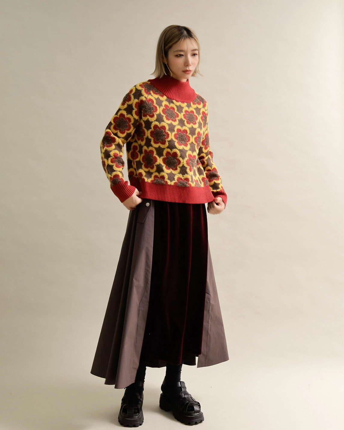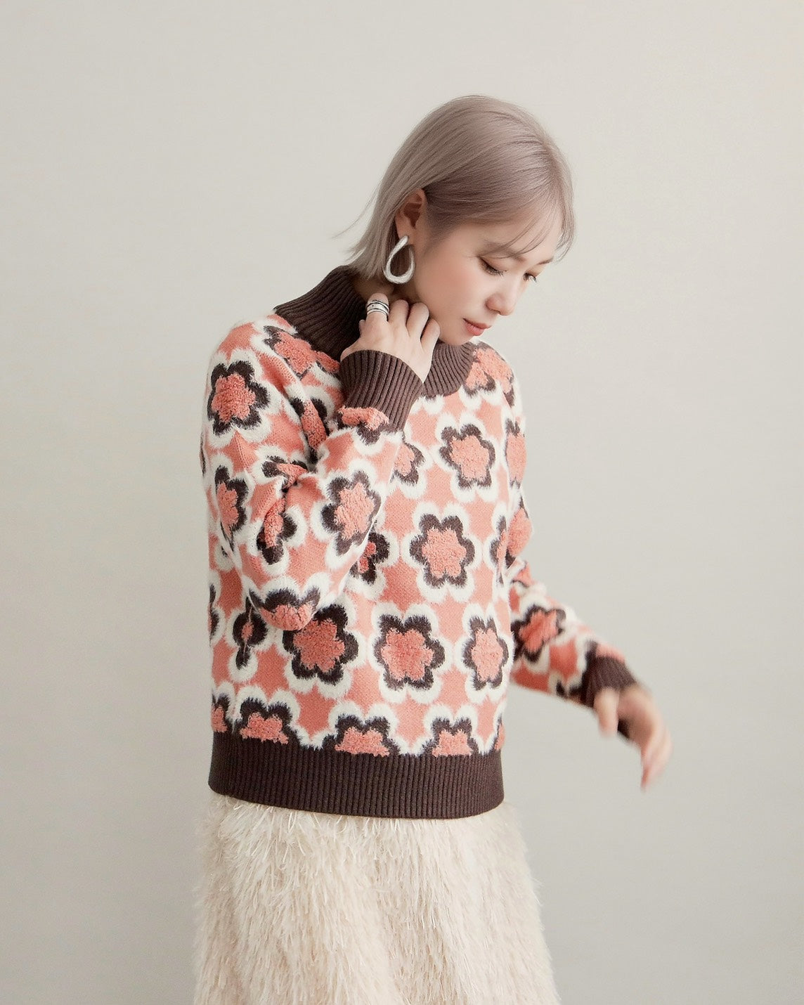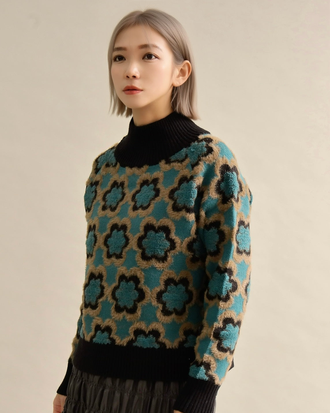 レトロフラワーハイネックニット