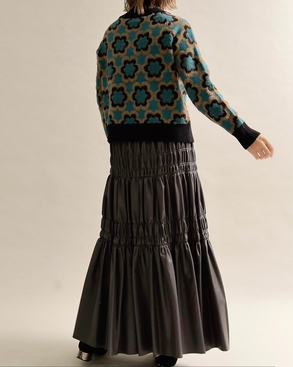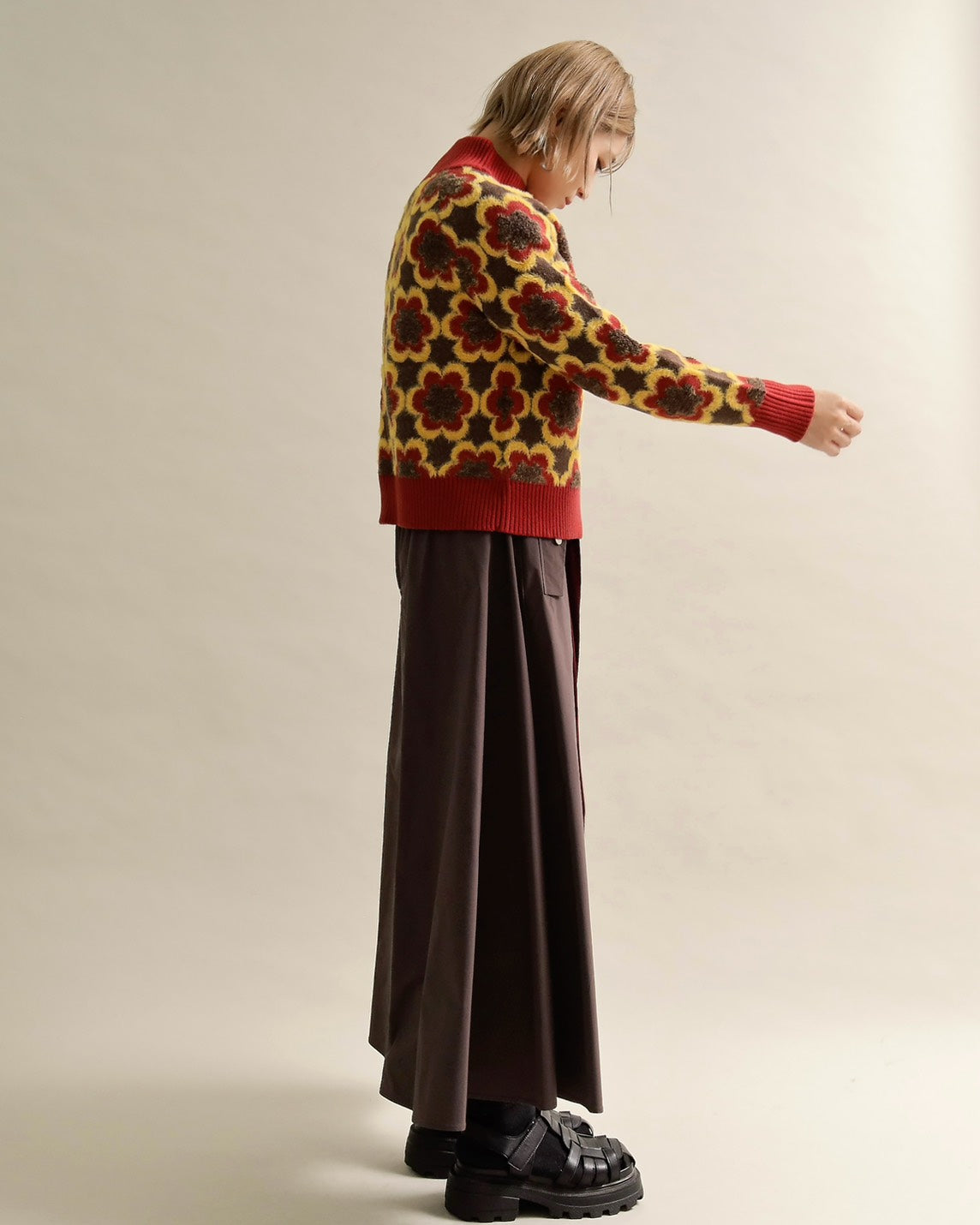 クラシカルなフラワーモチーフを全面にあしらった、存在感のあるジャカードニットプルオーバー。どこか懐かしさを感じさせるレトロ柄を、配色とシルエットで今のムードに落とし込みました。